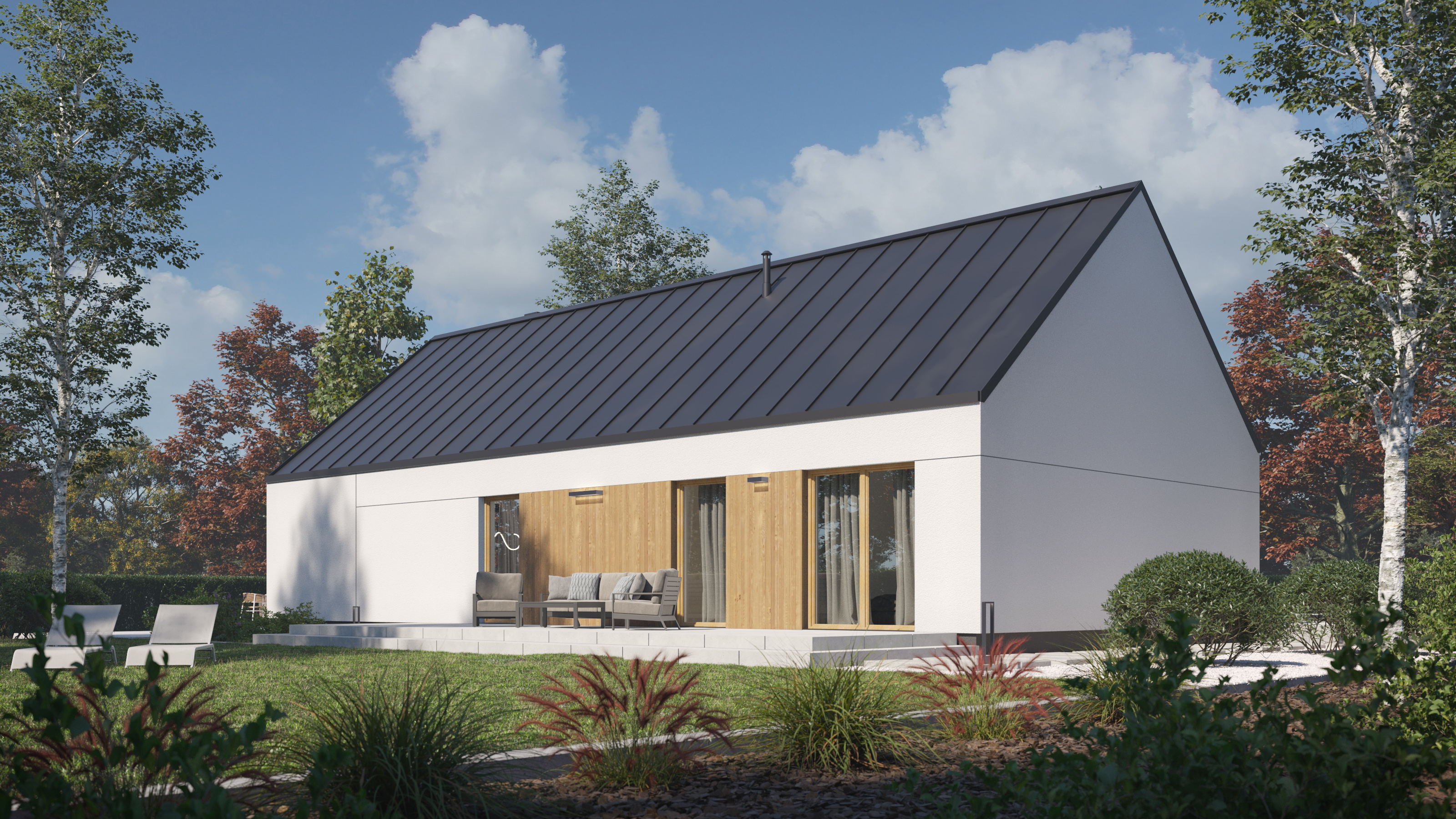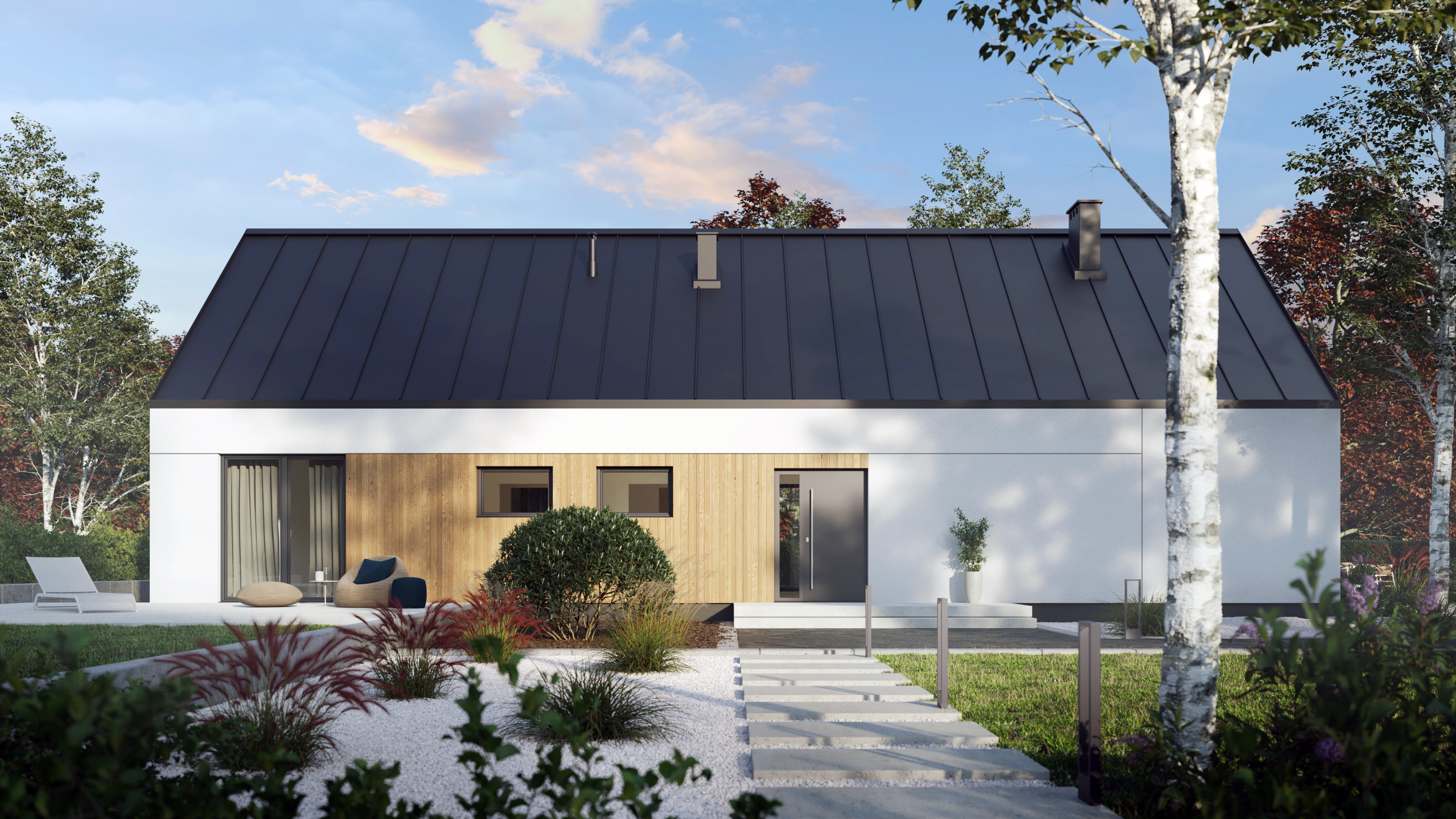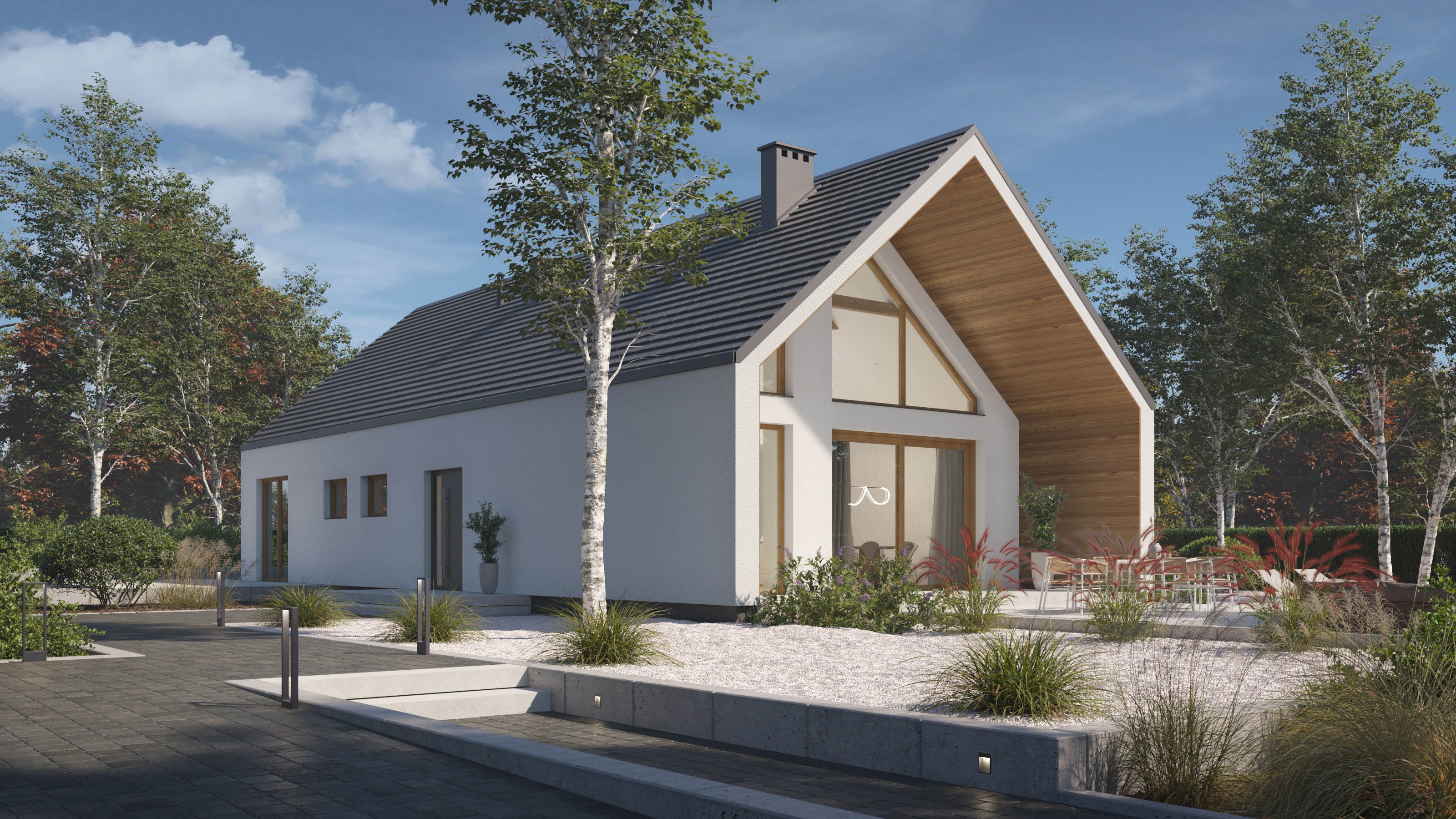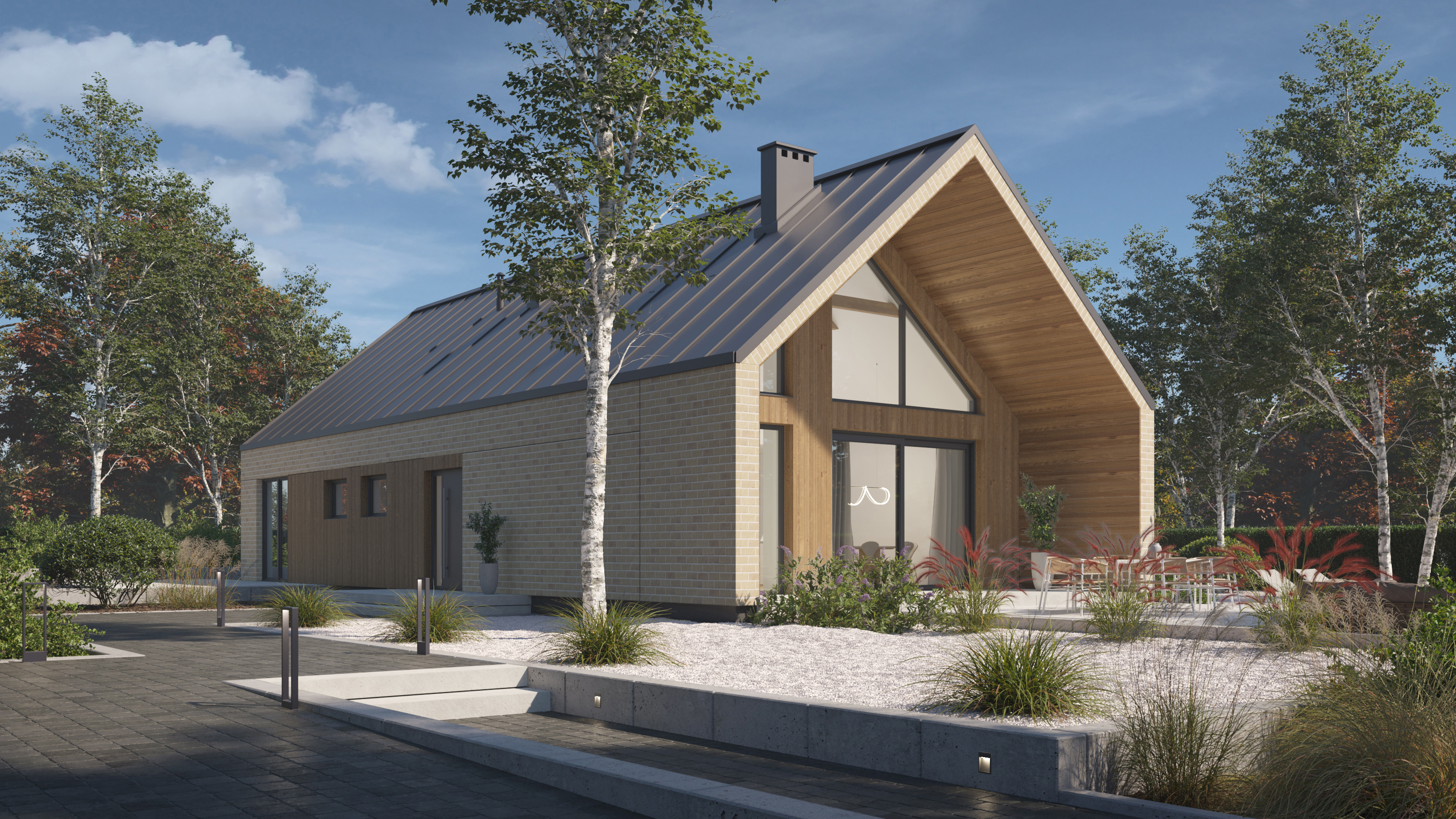 Projekt P.14 od P. Homes to współczesna interpretacja tradycyjnej stodoły – dom, który z jednej strony wtapia się naturalnie w krajobraz, z drugiej przyciąga spojrzenia swoją elegancką, wyważoną formą. Prosta bryła, wysokiej klasy wykończenia i perfekcyjnie przemyślany układ funkcjonalny to przepis na komfortową codzienność.