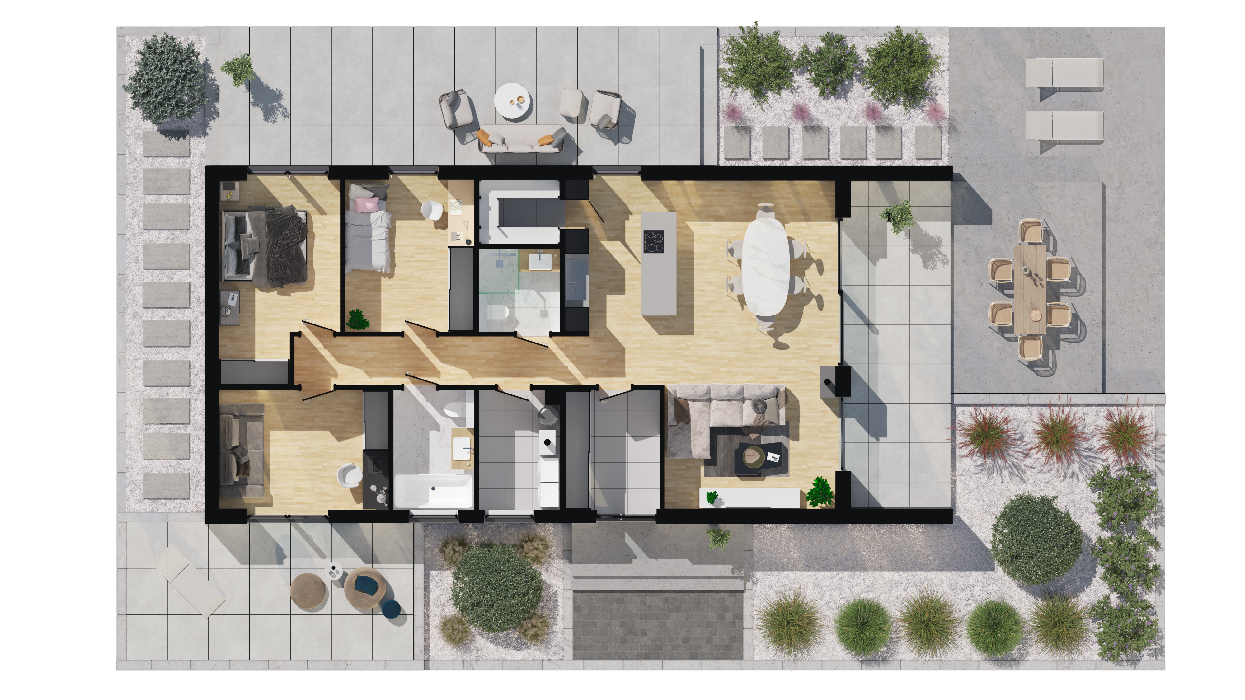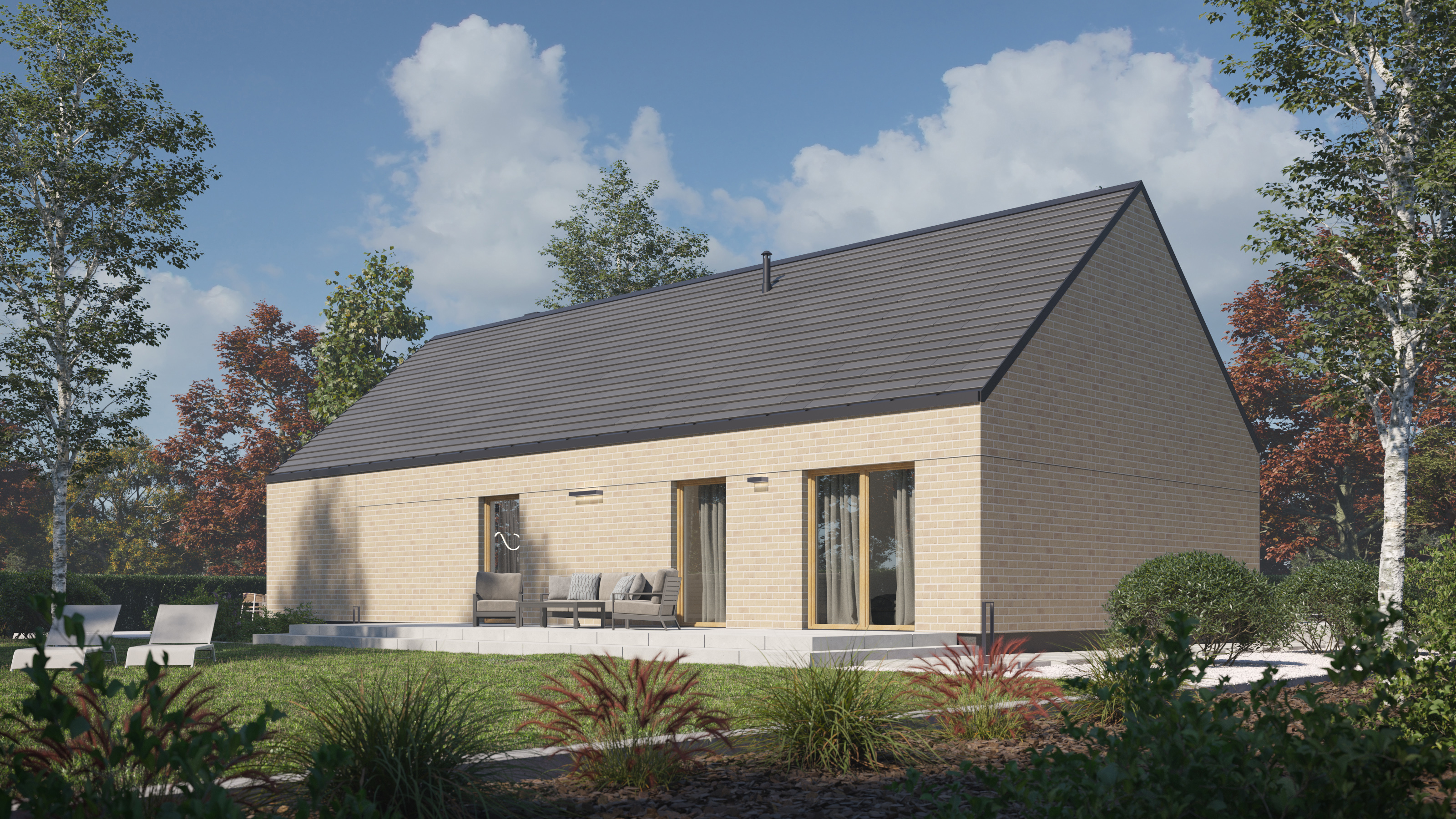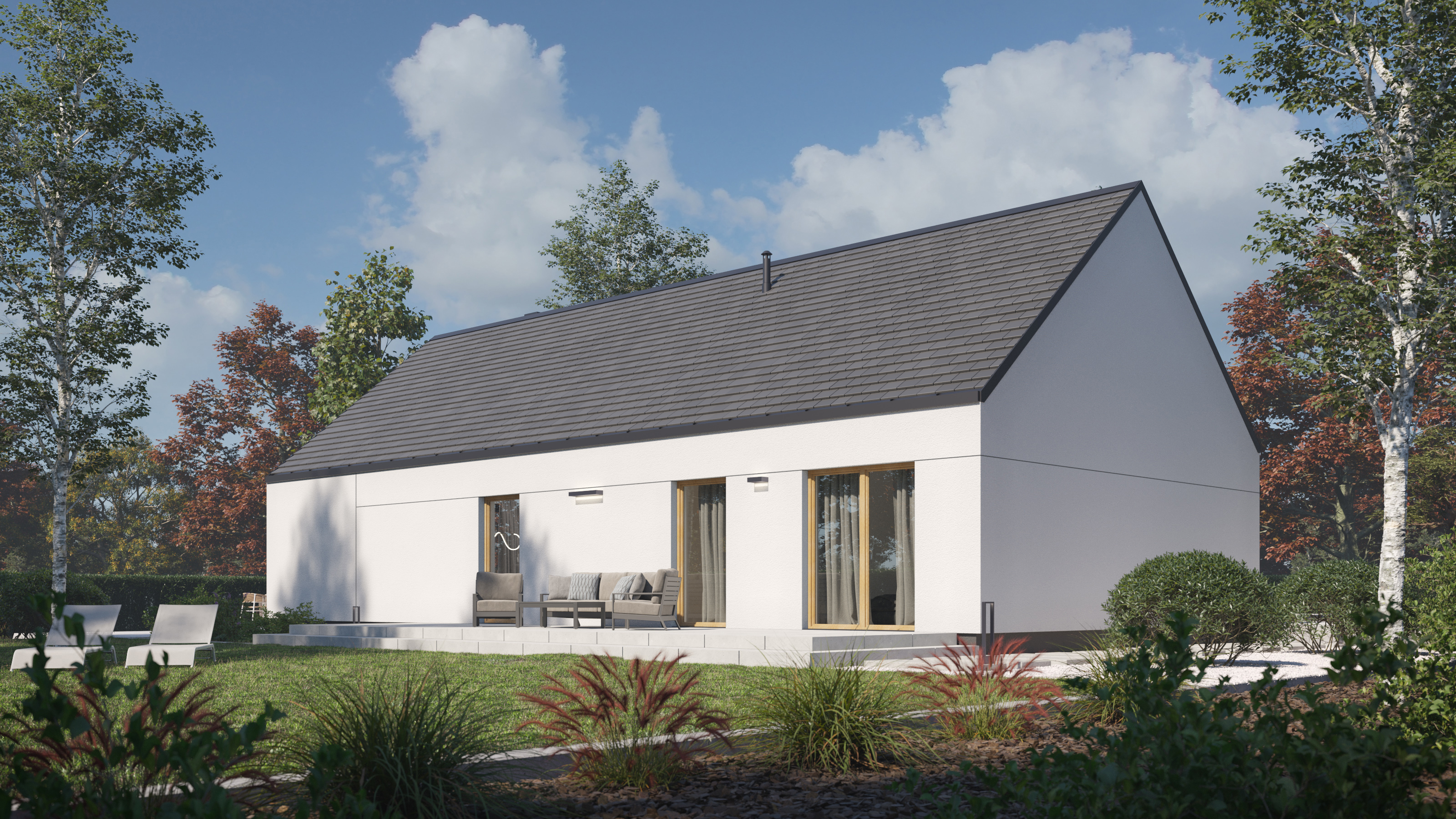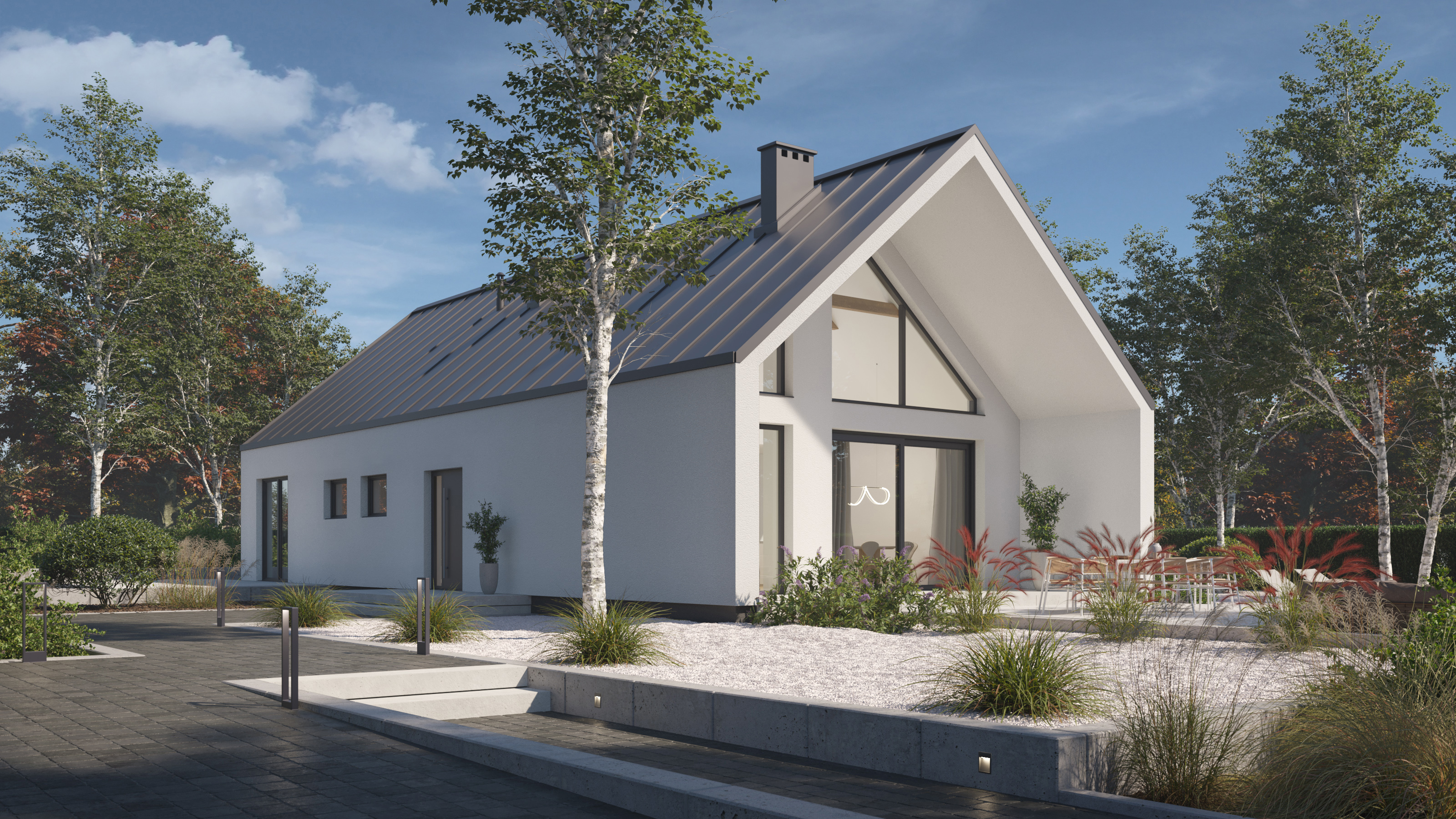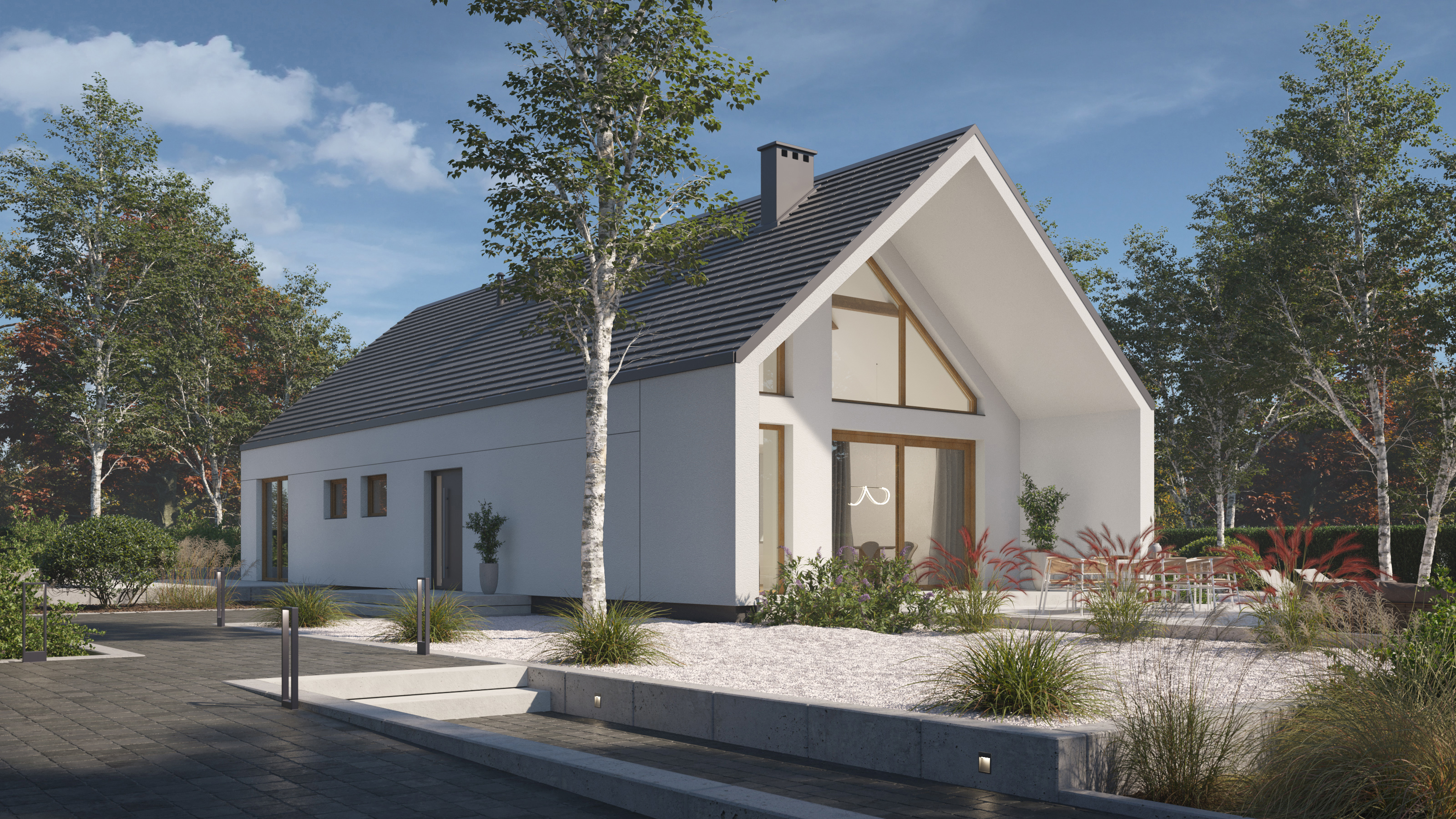 Na parterze znajdziemy przestronny, wysoki salon z dużymi przeszkleniami, które nie tylko doświetlają wnętrze, ale też otwierają dom na ogród. Klarowny podział na część dzienną i prywatną pozwala zachować harmonię, a układ trzech sypialni, dwóch łazienek i dodatkowej spiżarni odpowiada potrzebom zarówno par, jak i rodzin.