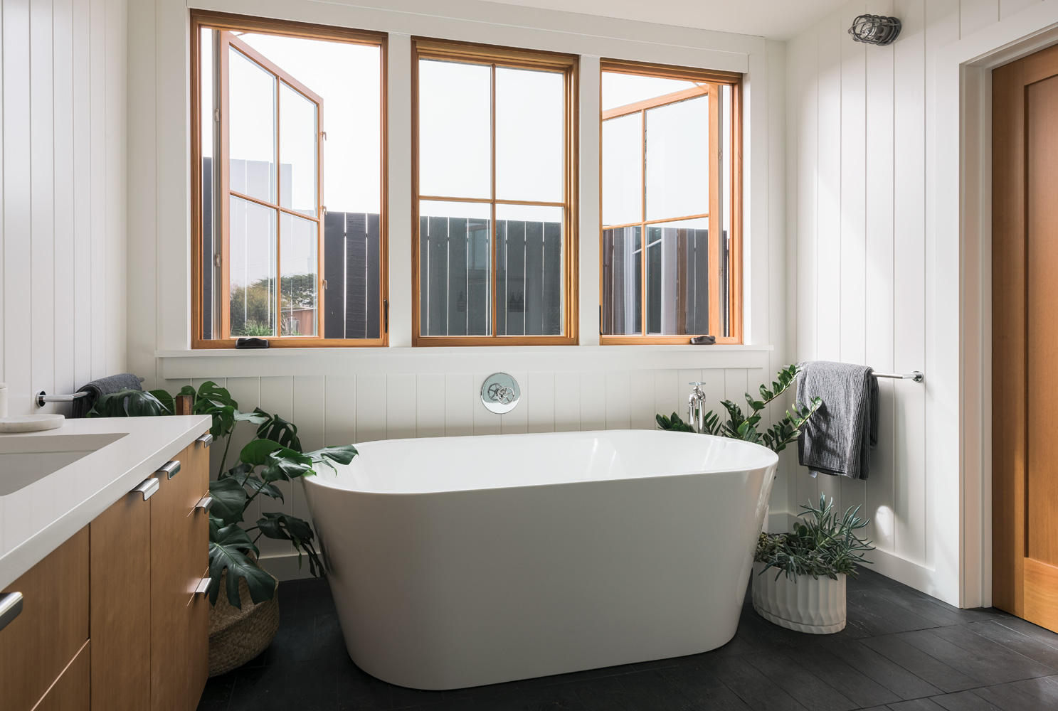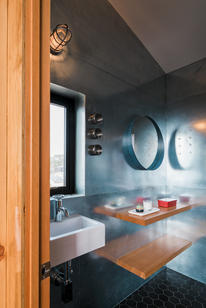 Zespół architektoniczny zdecydował się zachować pierwotny układ domu, przebudowując dach w celu poprawy izolacji oraz zwiększenia wysokości przestrzeni. Wprowadzili także nowy przedpokój i pokój z rządem okien, który wyznaczał granice między otwartą kuchnią a przytulnym salonem. Oryginalne podłogi z daglezji zostały zachowane, ale elewacja została pomalowana na czarno.