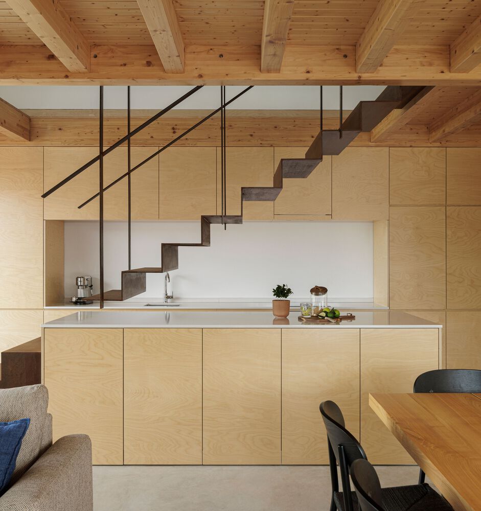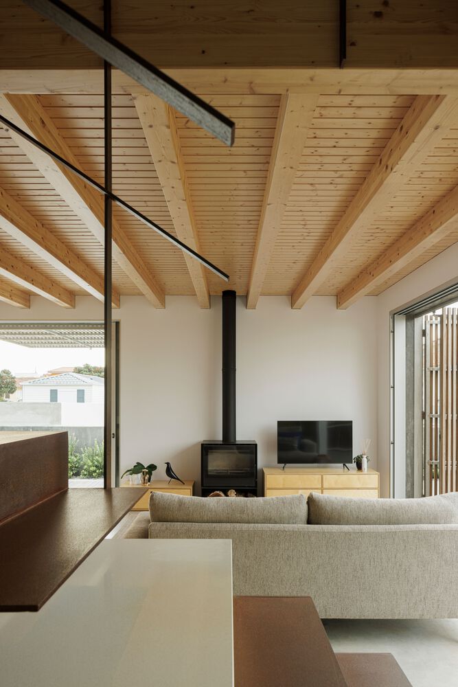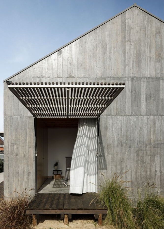Budynek przyjął archetypową formę, wykonaną w całości z betonu, podczas gdy drewno zostało zastosowane na elewacjach, tworząc kontrast, który podkreśla nowoczesny charakter obiektu. Rytmiczne okładziny drewniane nadają budynkowi estetyczny wygląd i doskonale współgrają z betonową strukturą, co podkreśla jego nowoczesny, minimalistyczny design. Budynek wznosi się na podniesionej z ziemi rampie, która przypomina nadmorskie chodniki, zapewniając dostęp do poziomu wejściowego. Również platformy zaprojektowane w tej samej konstrukcji tworzą wrażenie, że tarasy są naturalnym przedłużeniem przestrzeni wewnętrznej, co sprzyja płynnemu przejściu między wnętrzem a zewnętrzem.