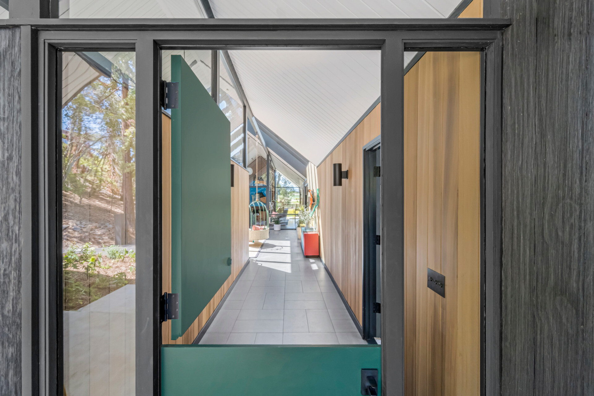 Przestrzenie wewnętrzne zostały otwarte poprzez usunięcie ścian działowych, co pozwoliło na swobodny przepływ światła i powietrza. To minimalistyczne tło podkreśla kolekcję sztuki współczesnej, głównie autorstwa kobiet. Szklane drzwi Fleetwood i przeszklony dach nad dawnym atrium potęgują wrażenie pionowości, jednocześnie zapraszając naturę do wnętrza. Drewno cedrowe, korek, kamień i stal tworzą organiczną, spokojną paletę materiałową.