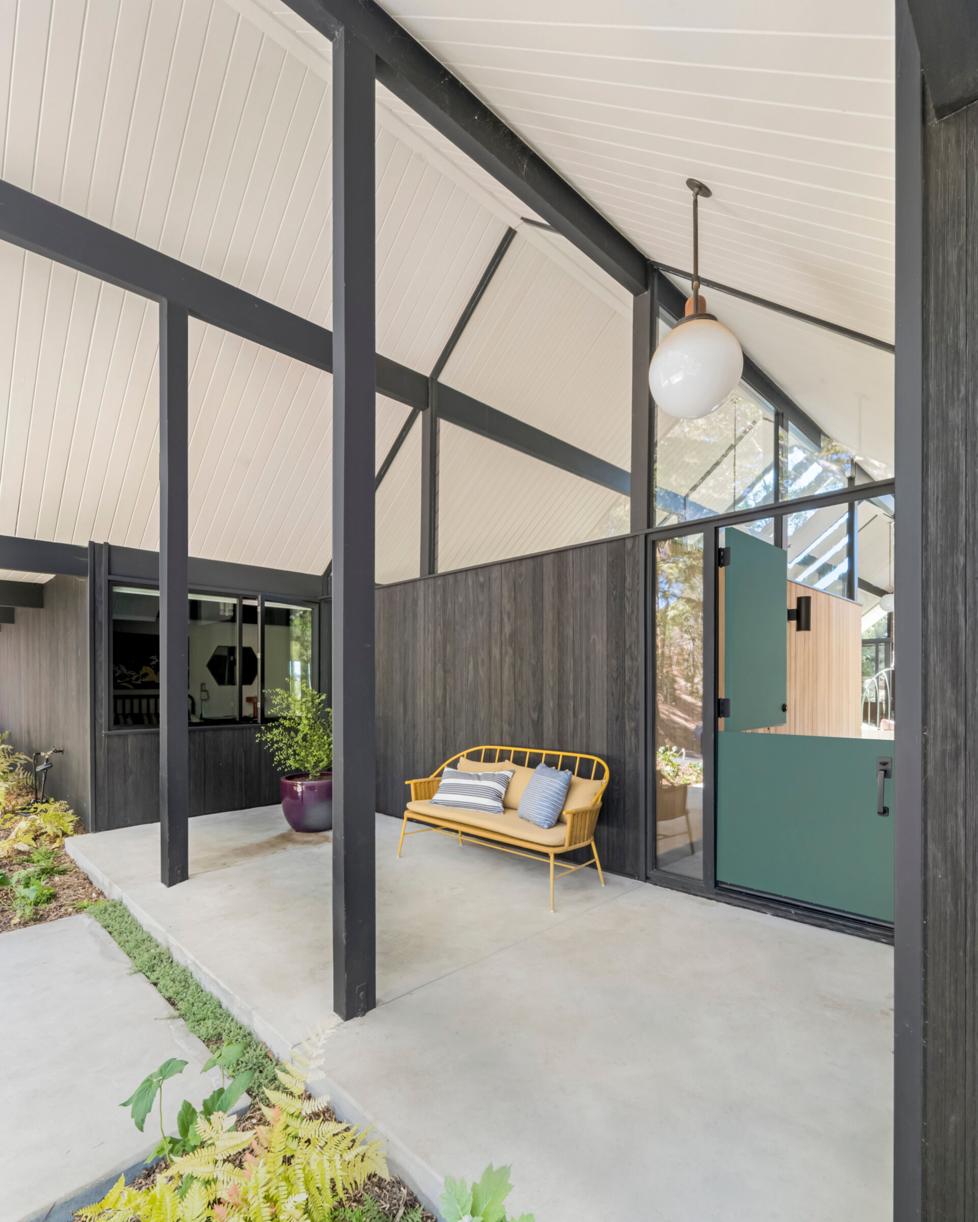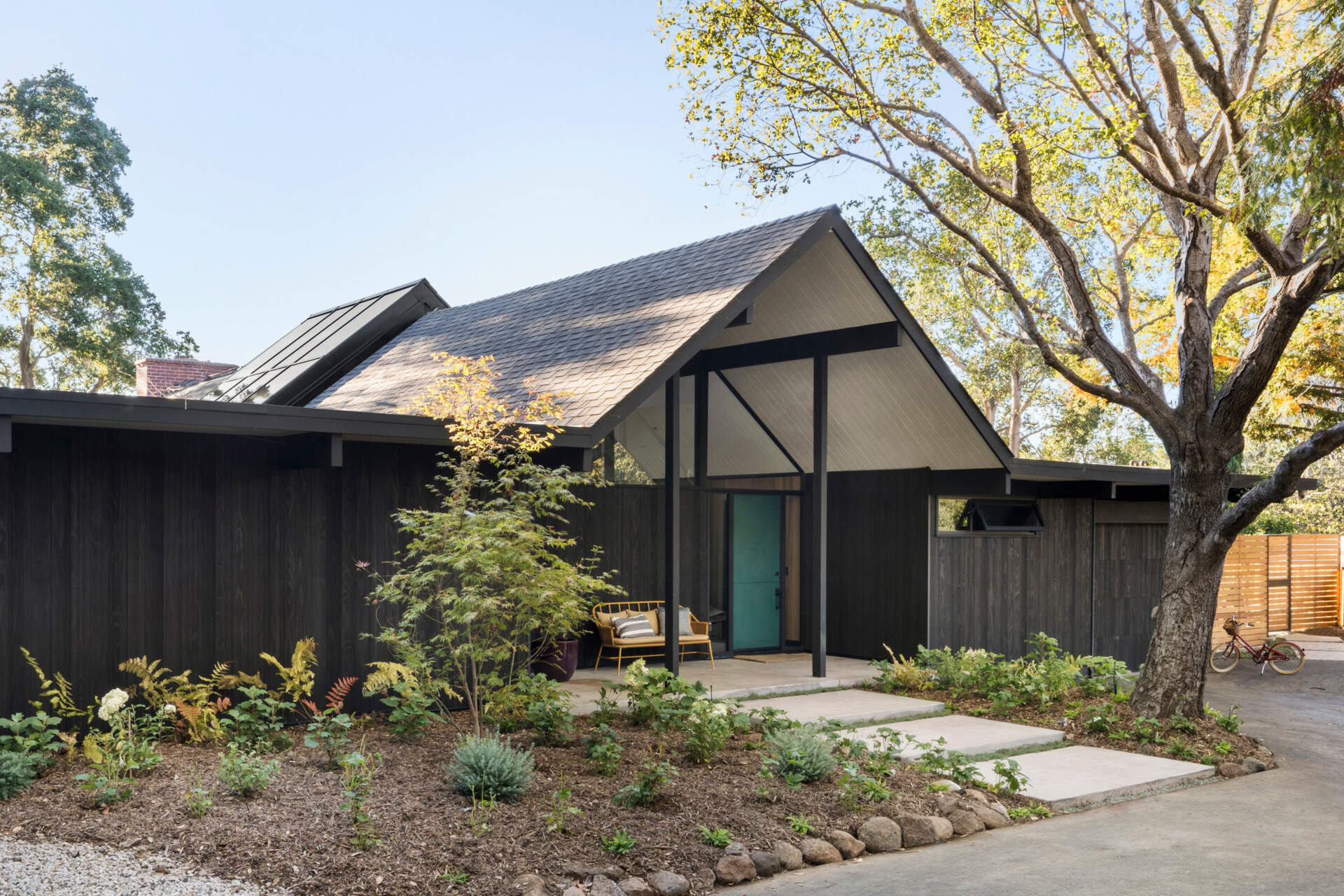 Carlson przeprowadził renowację z ogromnym szacunkiem dla pierwotnego projektu. Zmodernizował dom tak, by lepiej odpowiadał współczesnemu stylowi życia, nie tracąc przy tym jego otwartego, optymistycznego ducha. Dom usytuowany jest z dala od ulicy i prowadzi do niego długa, intymna droga. Elewację pokryto trwałym drewnem Accoya, poddanym technice Shou Sugi Ban, co nadaje całości teksturę i głębię. Główna bryła z dwuspadowym dachem została uzupełniona o dwa skrzydła z płaskimi dachami, zachowując charakterystyczny dla Eichlera profil.