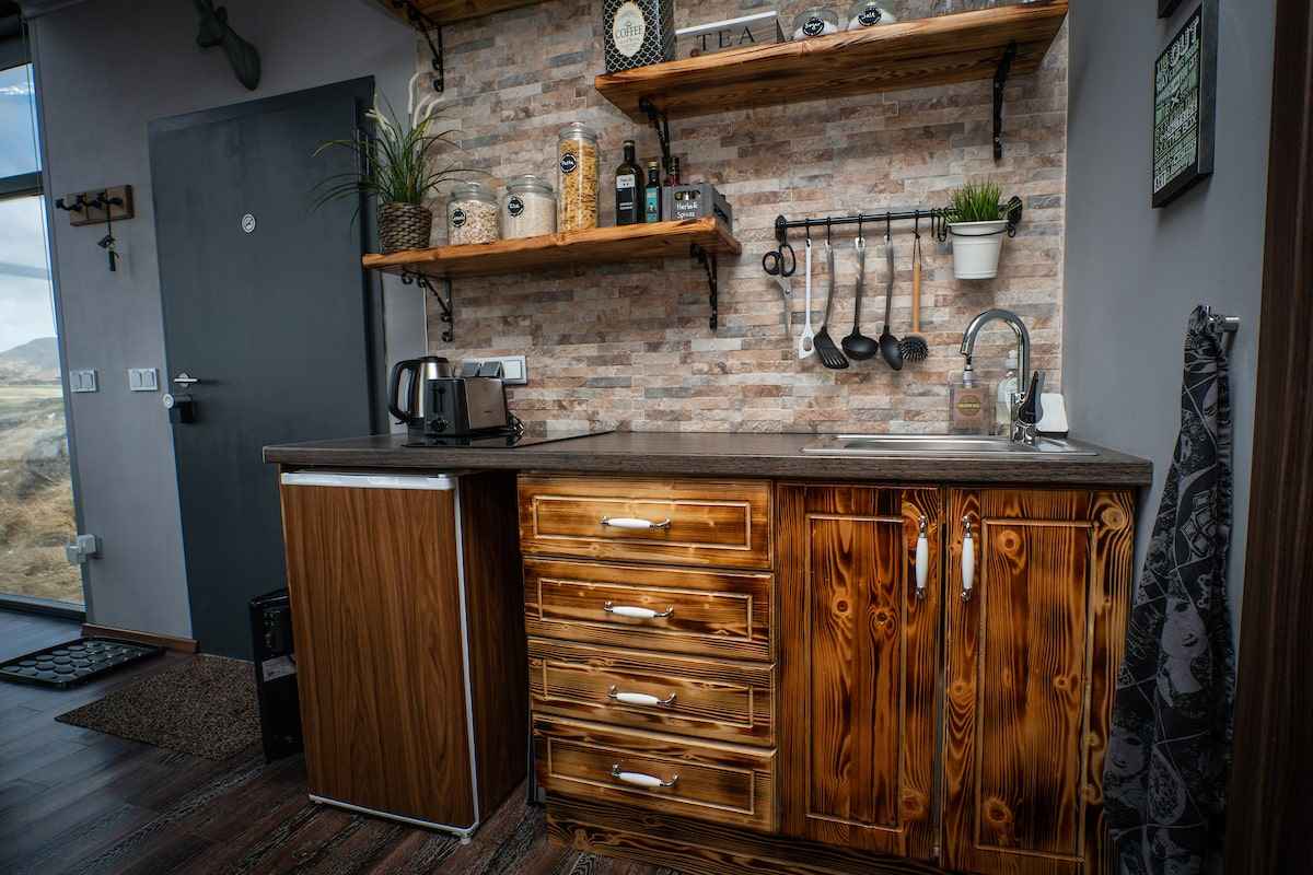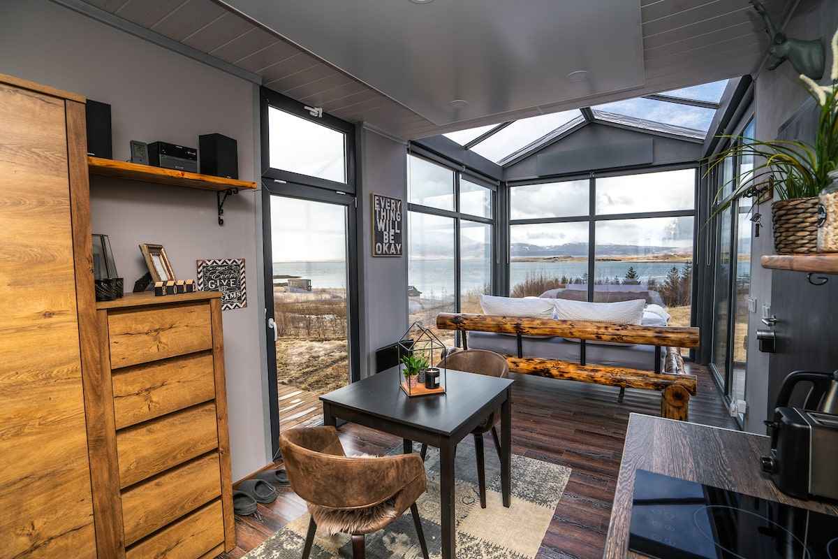 Wnętrza domków zostały stworzone zgodnie z indywidualnym projektem, w którym kluczową rolę odgrywa komfort i minimalizm. Funkcjonalny układ obejmuje przytulną sypialnię z panoramicznym oknem, w pełni wyposażoną kuchnię oraz wygodną łazienkę. Całość utrzymana jest w naturalnej kolorystyce i prostocie, które idealnie współgrają z otaczającym krajobrazem. Ta nowoczesna stodoła w islandzkim wydaniu łączy luksus z bliskością natury, tworząc przestrzeń sprzyjającą relaksowi i wyciszeniu.