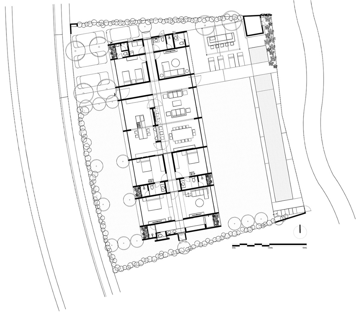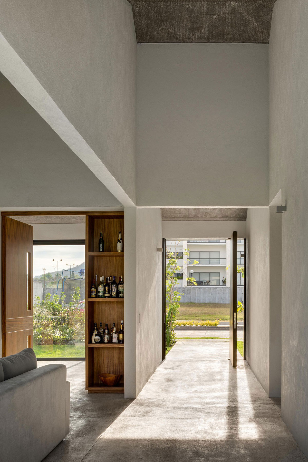 Paraiso to parterowy dom o prostym, ale przemyślanym układzie, który koncentruje się na głównych widokach. Dzięki dwóm głównym wejściom – jednym od strony południowej, a drugim od północnej, skierowanej na pole golfowe, dom łączy funkcję wypoczynkową z towarzyską. Otwarta przestrzeń w tylnej części domu zachęca do spędzania czasu na świeżym powietrzu, gdzie niskie rośliny i drzewa tworzą granice działki zamiast tradycyjnych murów czy płotów. Dzięki temu granica między polem golfowym a patio zostaje subtelnie zatarte, co wzmacnia poczucie przestronności i bliskości natury.