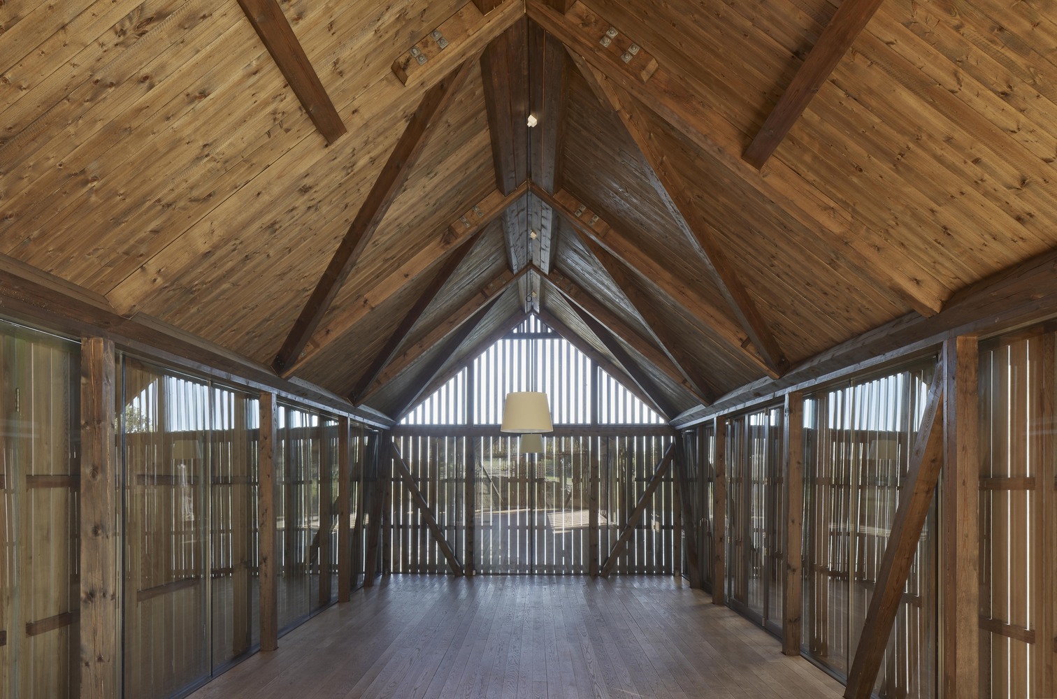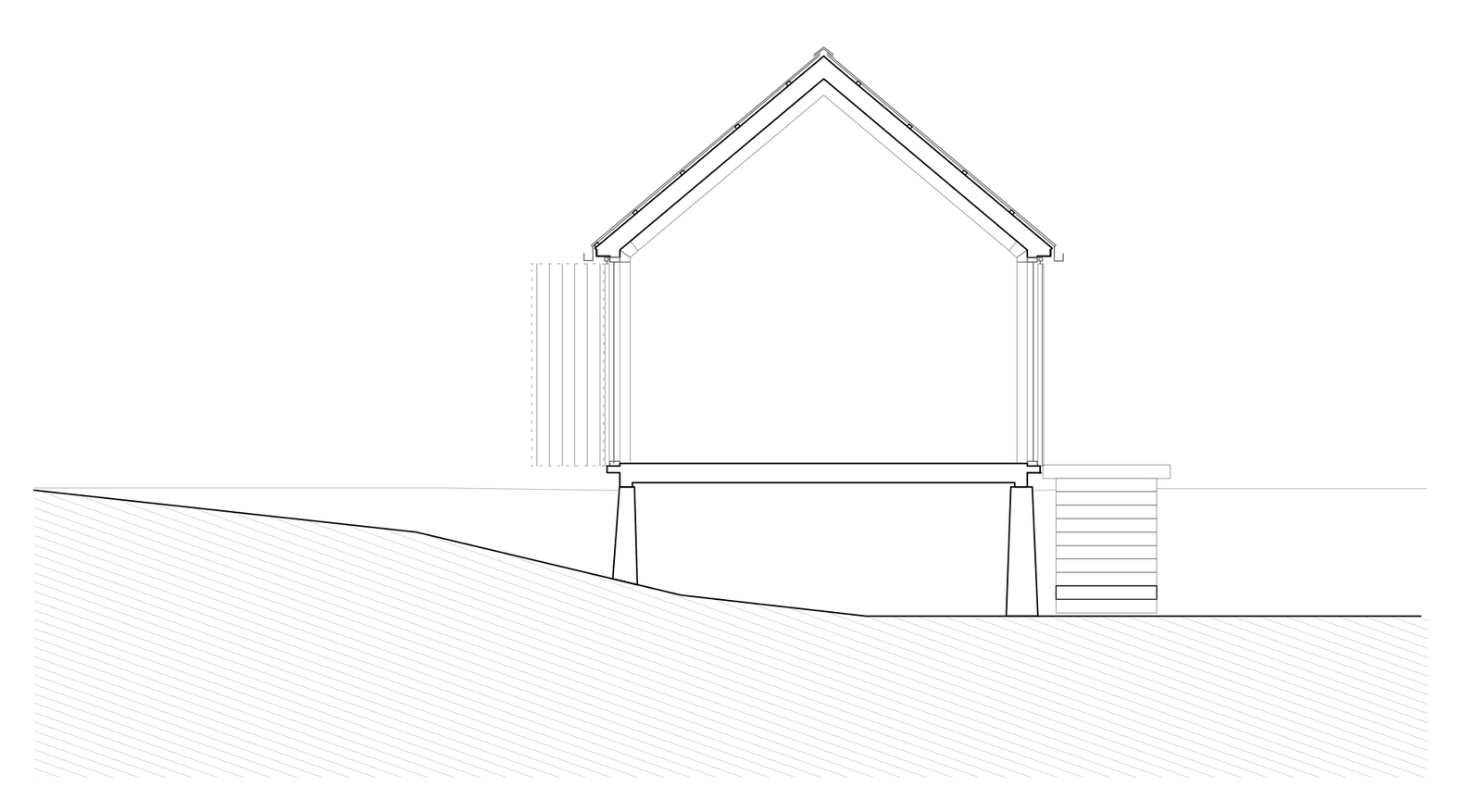 Konstrukcja opiera się na systemie drewnianych ram, reinterpretowanych we współczesnej formie. Przeszklona fasada z ruchomymi okiennicami pozwala dostosować przestrzeń do różnych zastosowań, takich jak warsztat, sala eventowa, pokój zabaw czy salon wystawowy. Budynek harmonijnie łączy tradycję z nowoczesnością, oferując elastyczną i wielofunkcyjną przestrzeń.