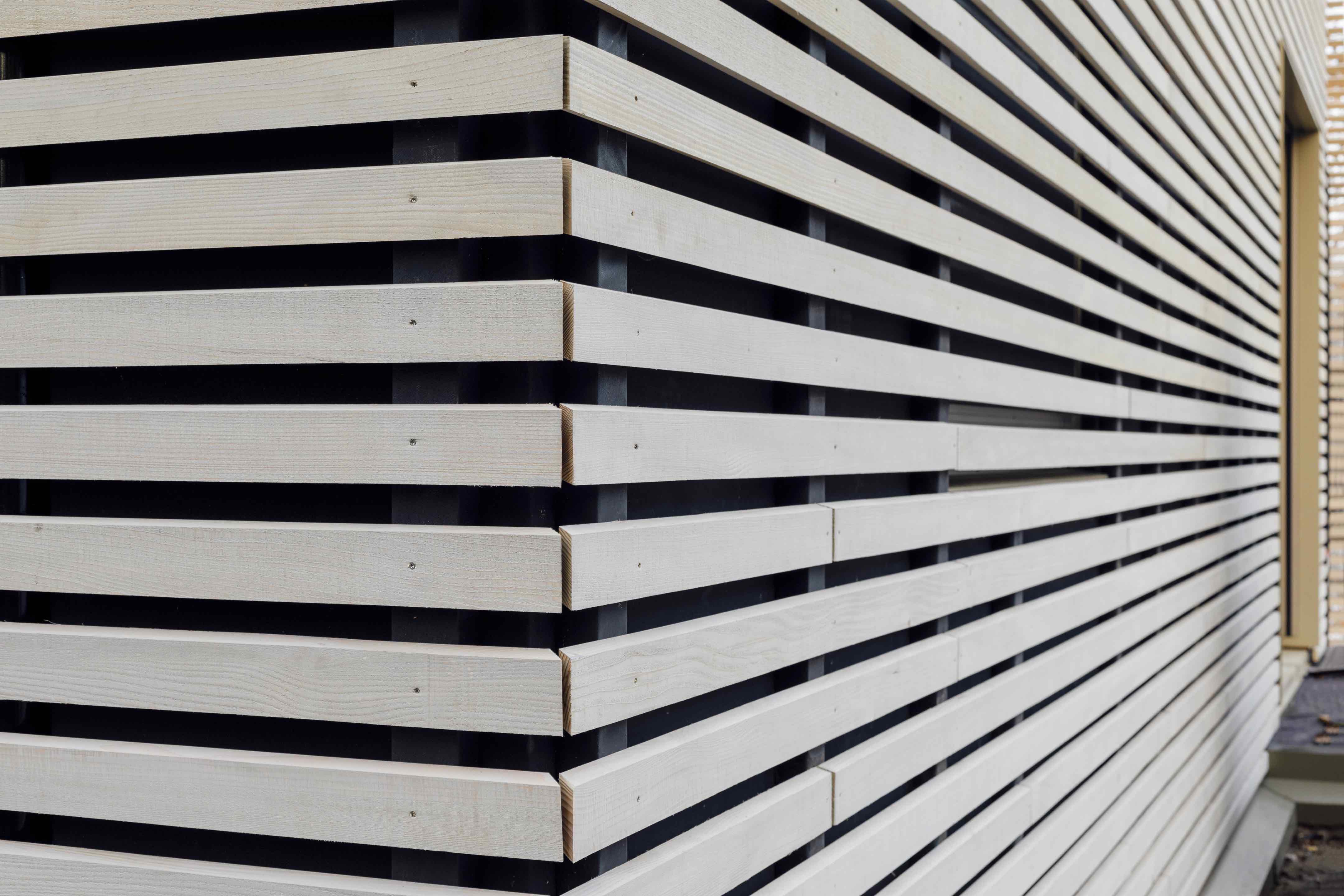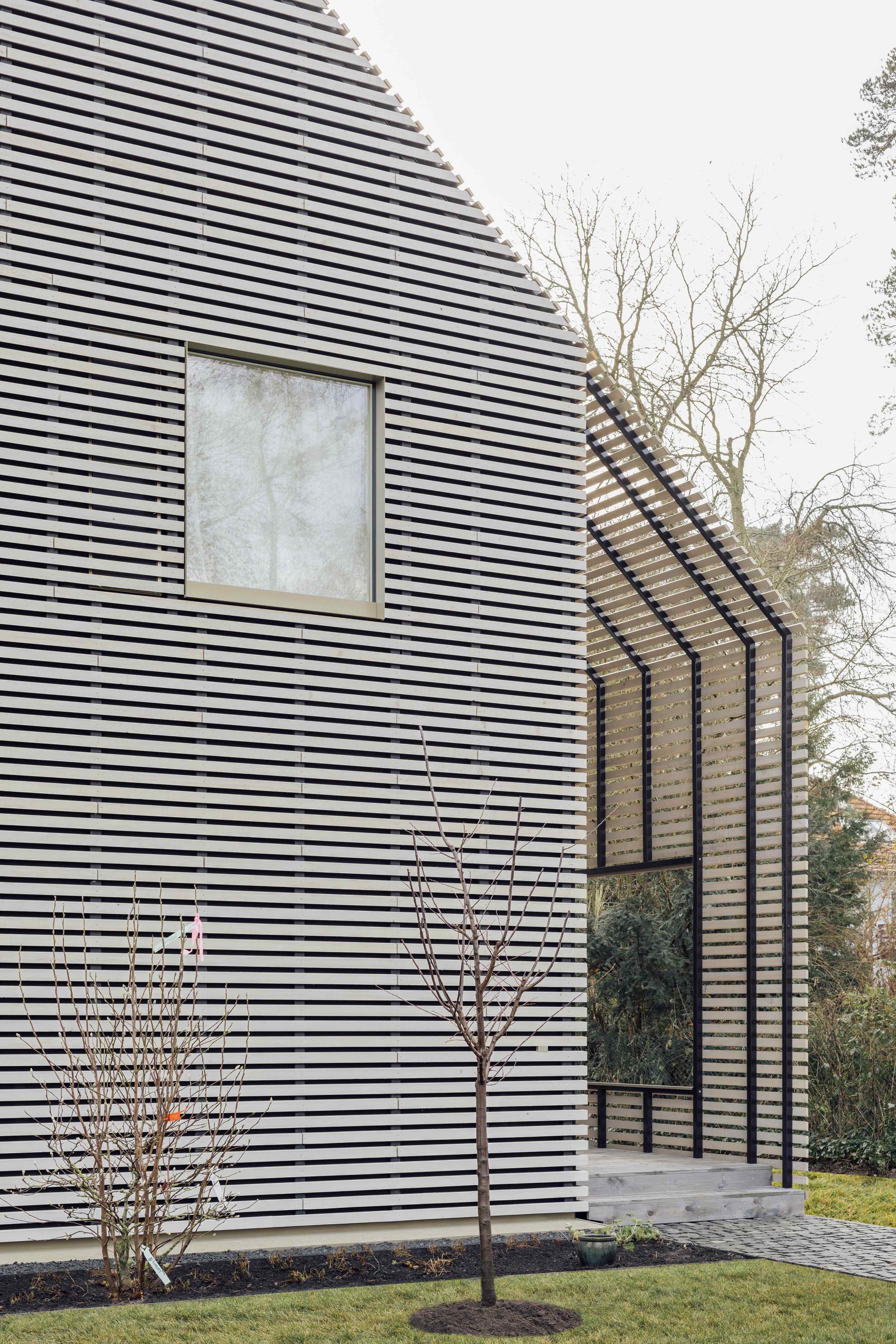 Zastosowana okładzinowa membrana działa jak filtr: delikatnie rozmywa kontury domu, zapewnia intymność i chroni wnętrza przed nadmiernym nasłonecznieniem. Równocześnie nadaje obiektowi elegancki, dyskretny charakter – dom wtapia się w otoczenie, zamiast nad nim dominować. Wydłużone okapy tworzą pergole po obu stronach budynku, rozszerzając jego funkcję i otwierając przestrzeń mieszkalną na ogród.