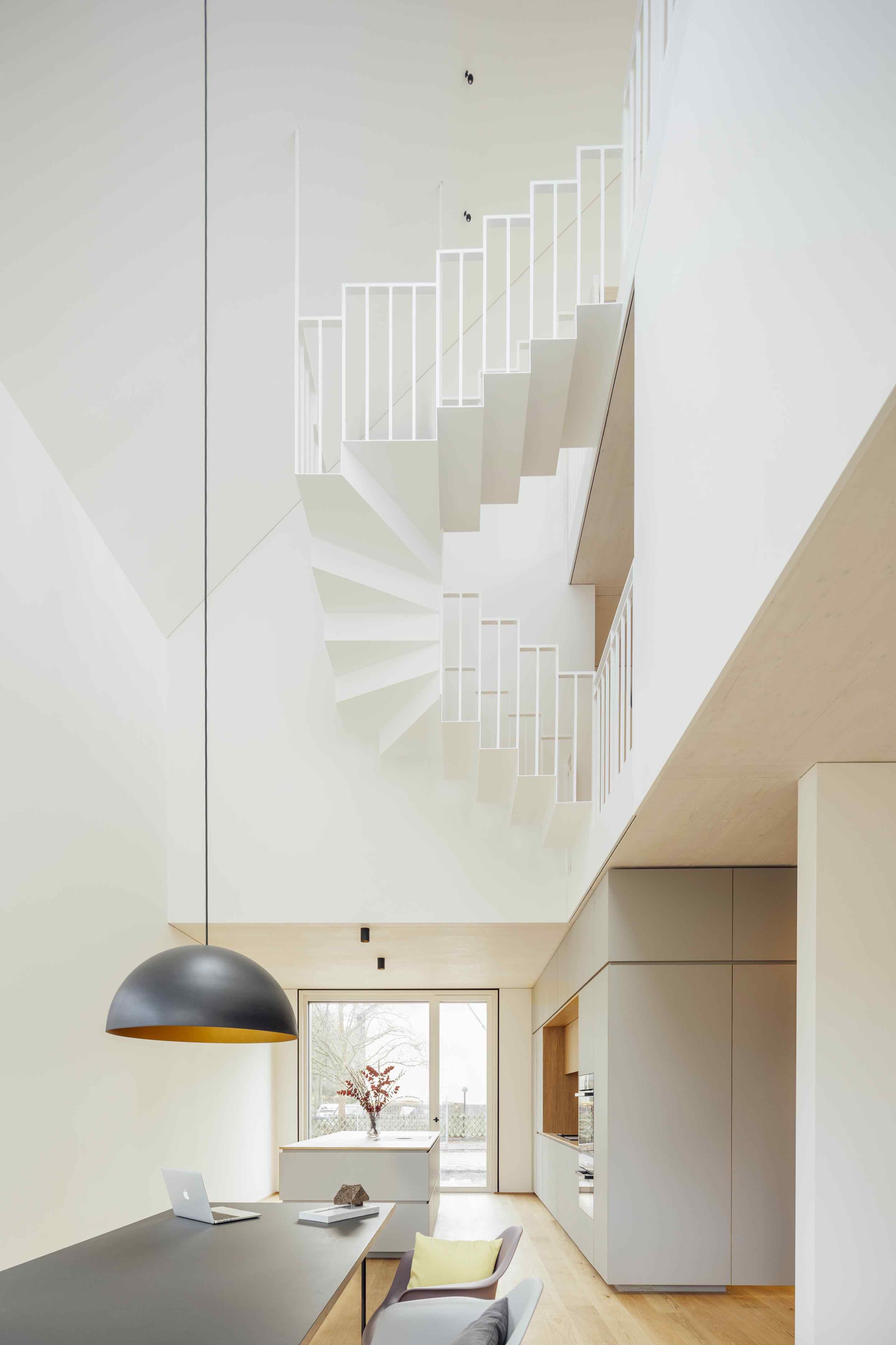 Wysoka przestrzeń nad jadalnią wznosi się aż pod sam dach, tworząc pionowe „L” i zapewniając wizualny kontakt między kondygnacjami. Lekka, stalowa klatka schodowa rozwija tę ideę, prowadząc do pokoi dziecięcych i głównej sypialni na piętrze.