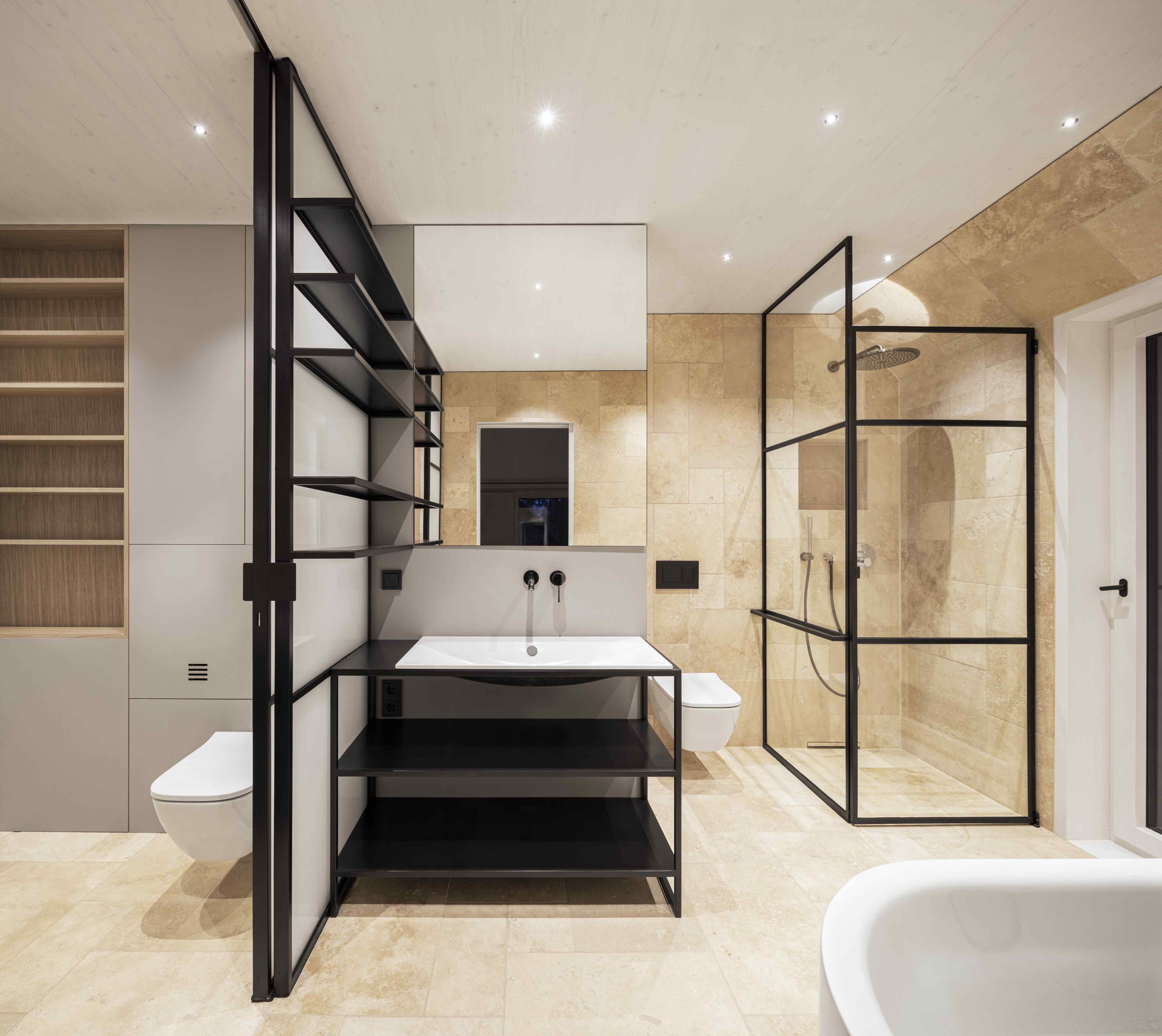 Wnętrza, utrzymane w jasnych tonach bieli i naturalnego drewna, cechuje spójna, elegancka prostota. Dąb zastosowano na podłogach, schodach, w zabudowach meblowych i siedziskach okiennych. Fronty szaf wykończono szarym linoleum, a strefy wellness – beżowo-brązowym trawertynem zestawionym z czarną stalą. Każdy element został zaprojektowany tak, aby tworzyć dom spokojny, ponadczasowy i dopracowany w każdym detalu.