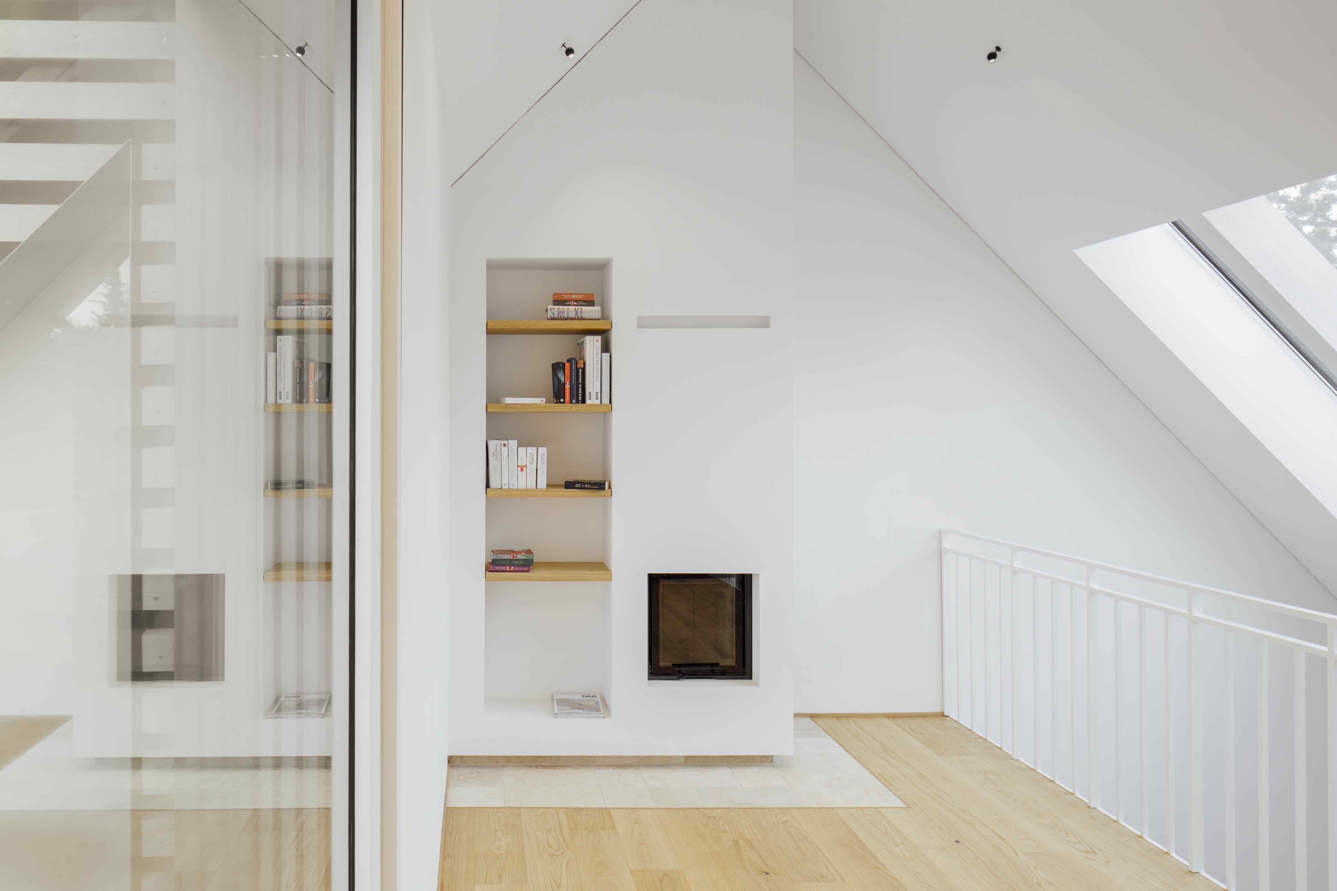 W poddaszu znajduje się półprywatna galeria z kominkiem, intensywnie doświetlona wschodnim świetlikiem oraz w pełni przeszkloną fasadą prowadzącą na zachodni taras. To miejsce do wyciszenia, pracy lub spotkań, które z łatwością może pełnić funkcję dodatkowego pokoju gościnnego.