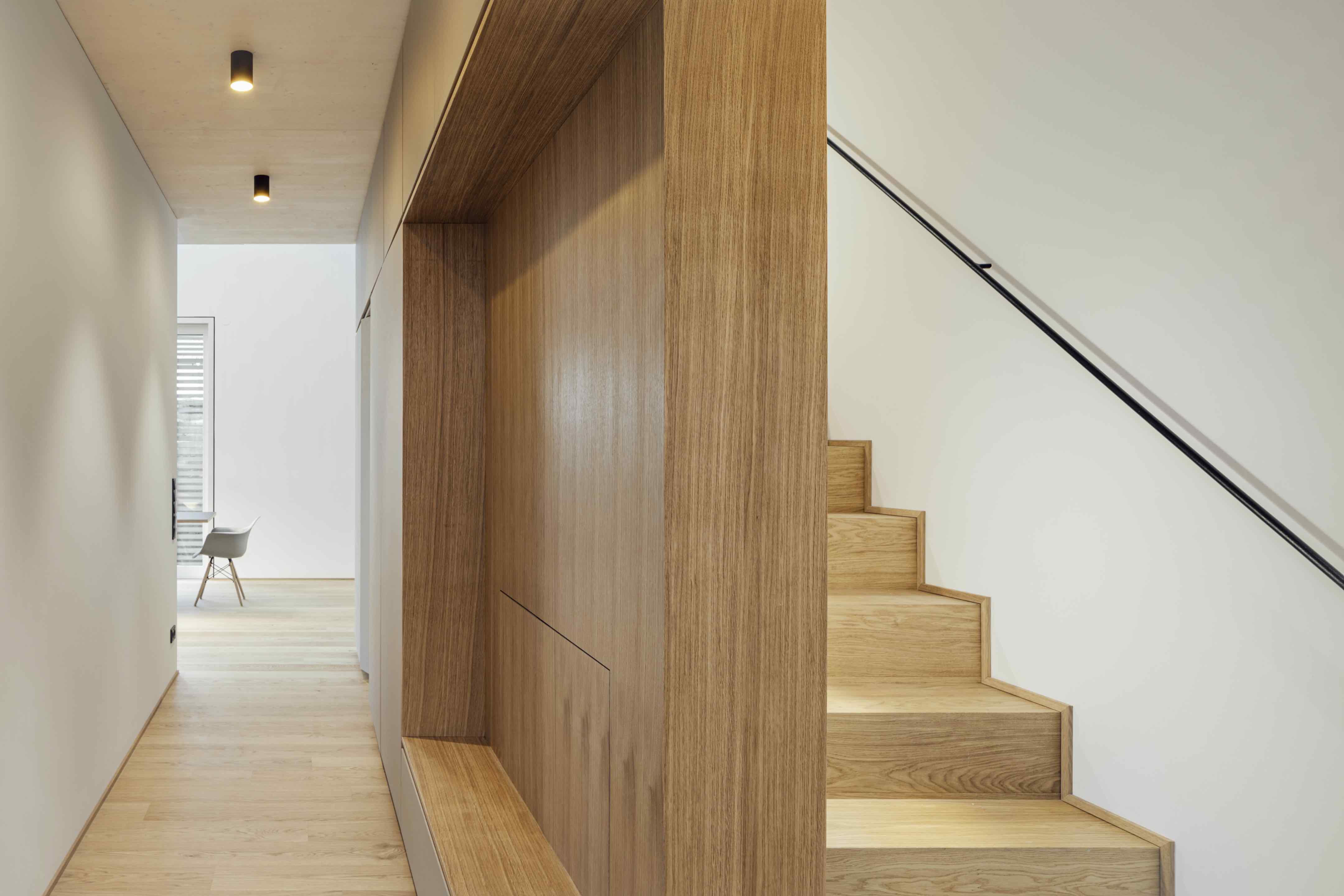 Dom wykonano jako konstrukcję całkowicie drewnianą – łącznie z stropami i stropami piwnicznymi – z myślą o przyszłej recyklingowalności. Połączenia wykonano mechanicznie, unikając klejów. Izolacja z wełny drzewnej, płyty gipsowo-włóknowe i tynki wapienne pozwalają na naturalną regulację wilgotności, zapewniając zdrowy mikroklimat we wnętrzach.
