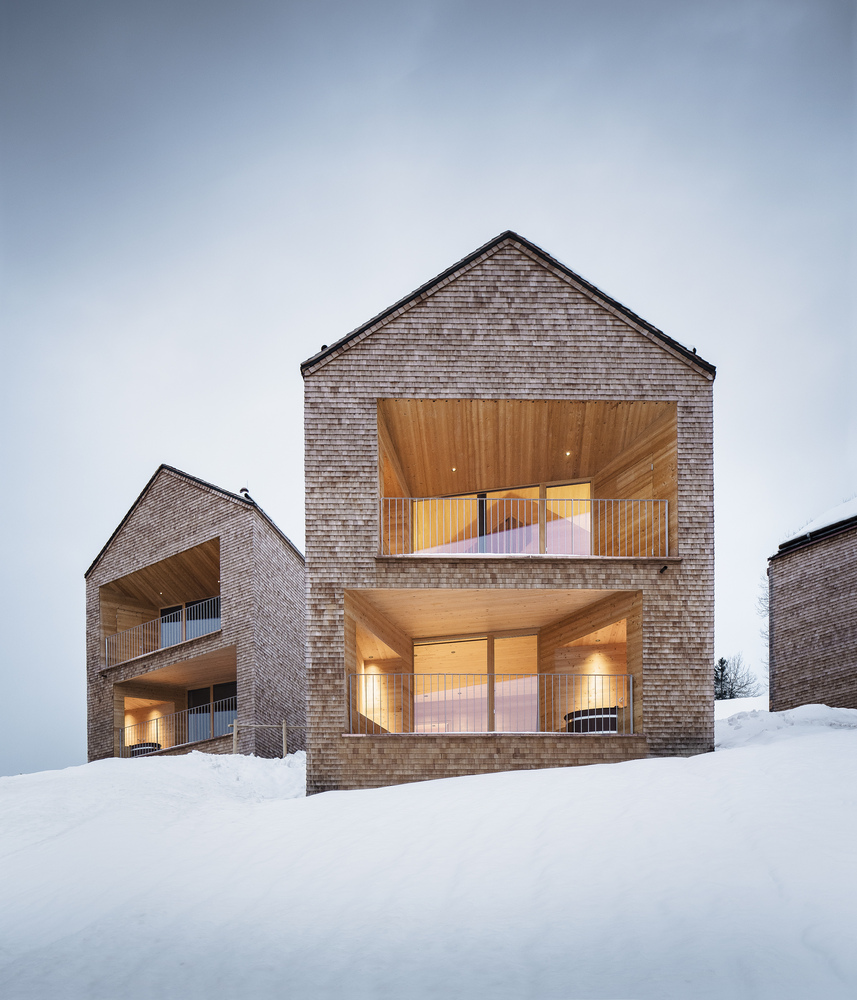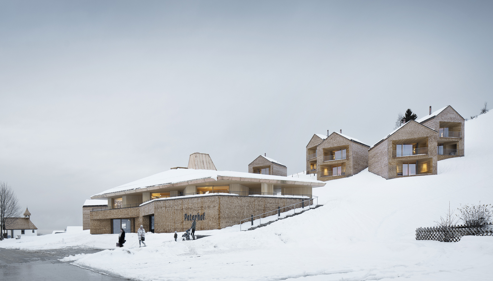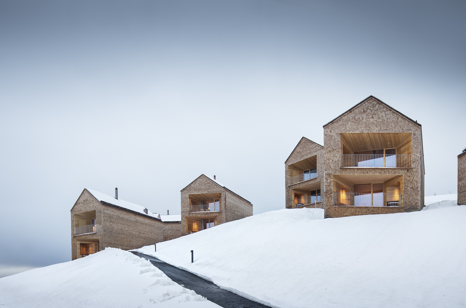 Kompleks składa się z trzech grup po cztery budynki, rozmieszczonych w naturalny sposób wokół centralnej przestrzeni. Chalety bazują na jednolitym modelu, zróżnicowanym poprzez odbicia i warstwowanie, dostosowanym do ich położenia i dróg dostępu. Główny budynek oferuje starannie skomponowane widoki na góry, dolinę oraz pobliską kaplicę, a zimą także na stoki narciarskie. Usytuowany poniżej chaletów, zapewnia niezakłócone panoramy alpejskiego krajobrazu, podczas gdy restauracja i słoneczny taras są widoczne z drogi dojazdowej.