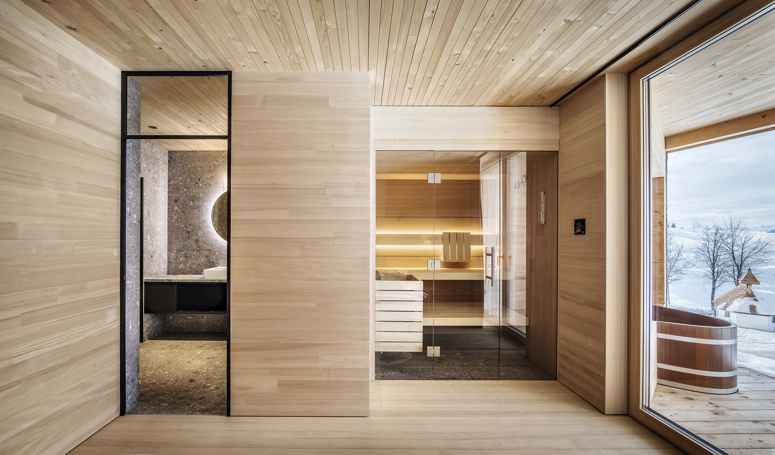 Każdy chalet składa się z sypialni, przestronnej strefy dziennej z kuchnią i piecem opalanym drewnem, sauny oraz zewnętrznej wanny z hydromasażem, oferując wysokiej jakości układ przestrzenny na obu kondygnacjach. Główny budynek, zwrócony na zachód, zaprasza gości do restauracji i na taras z miejscami dla 120 osób.