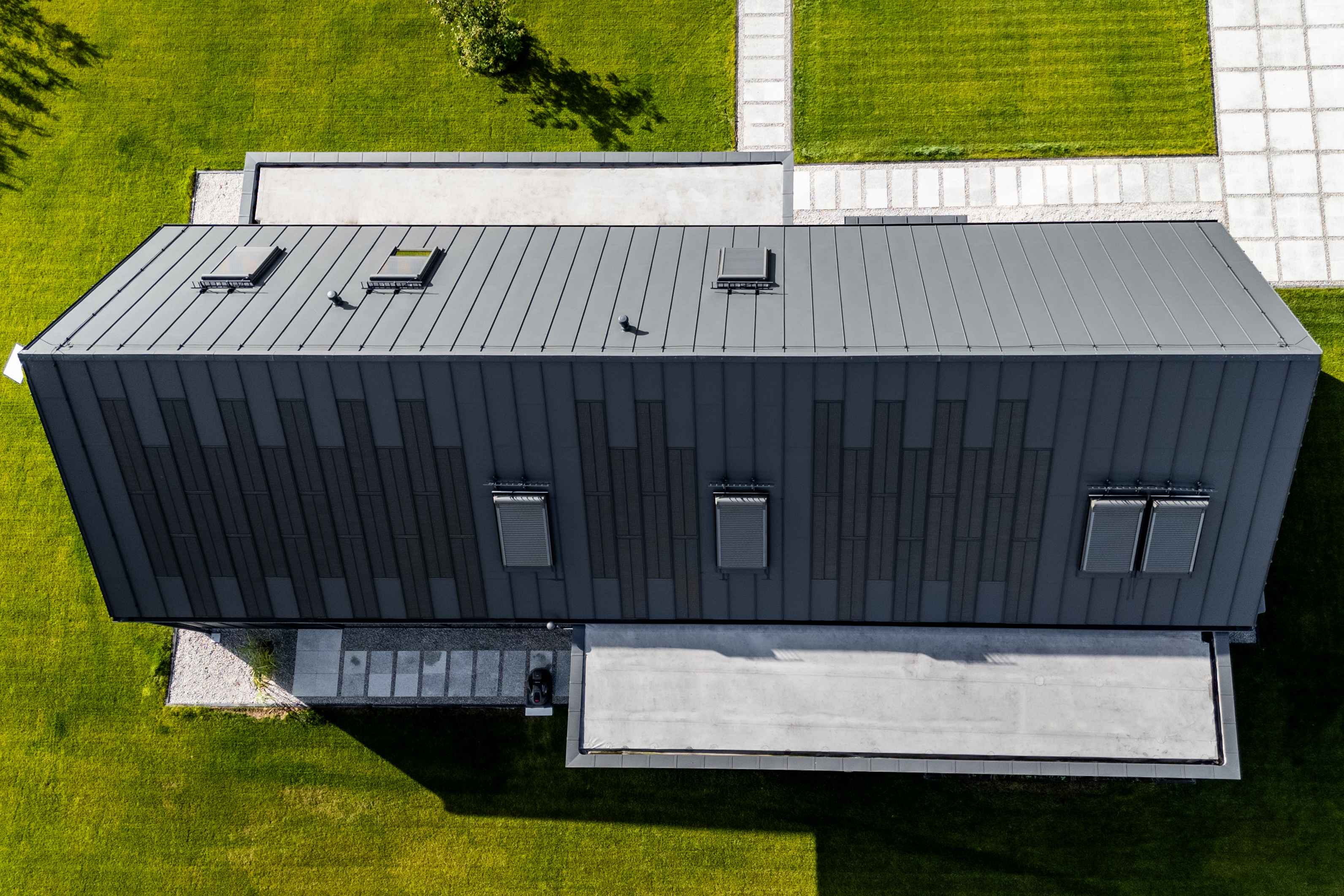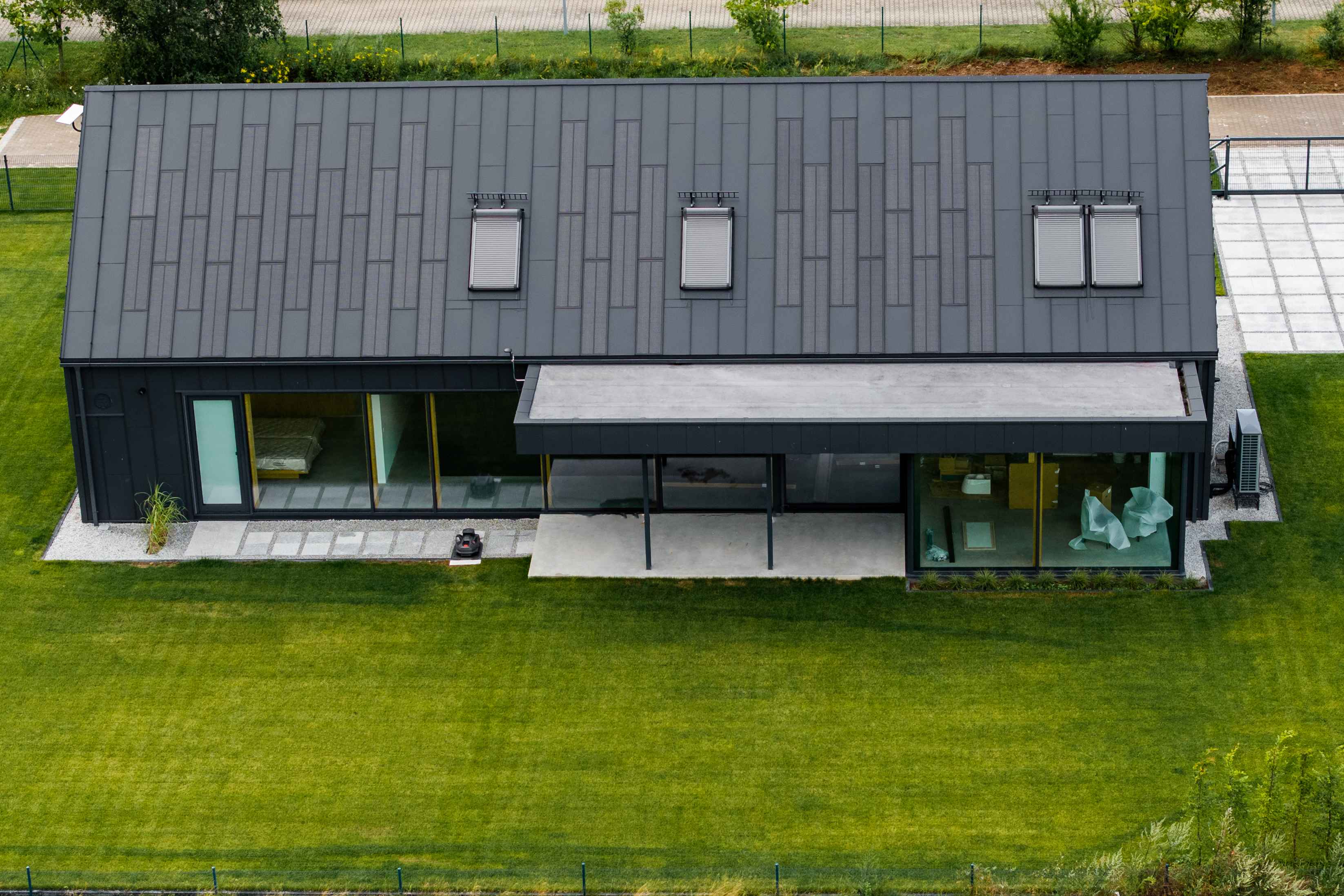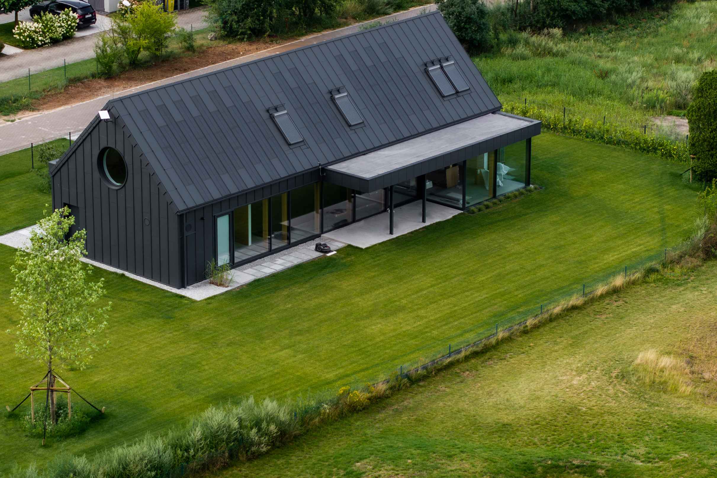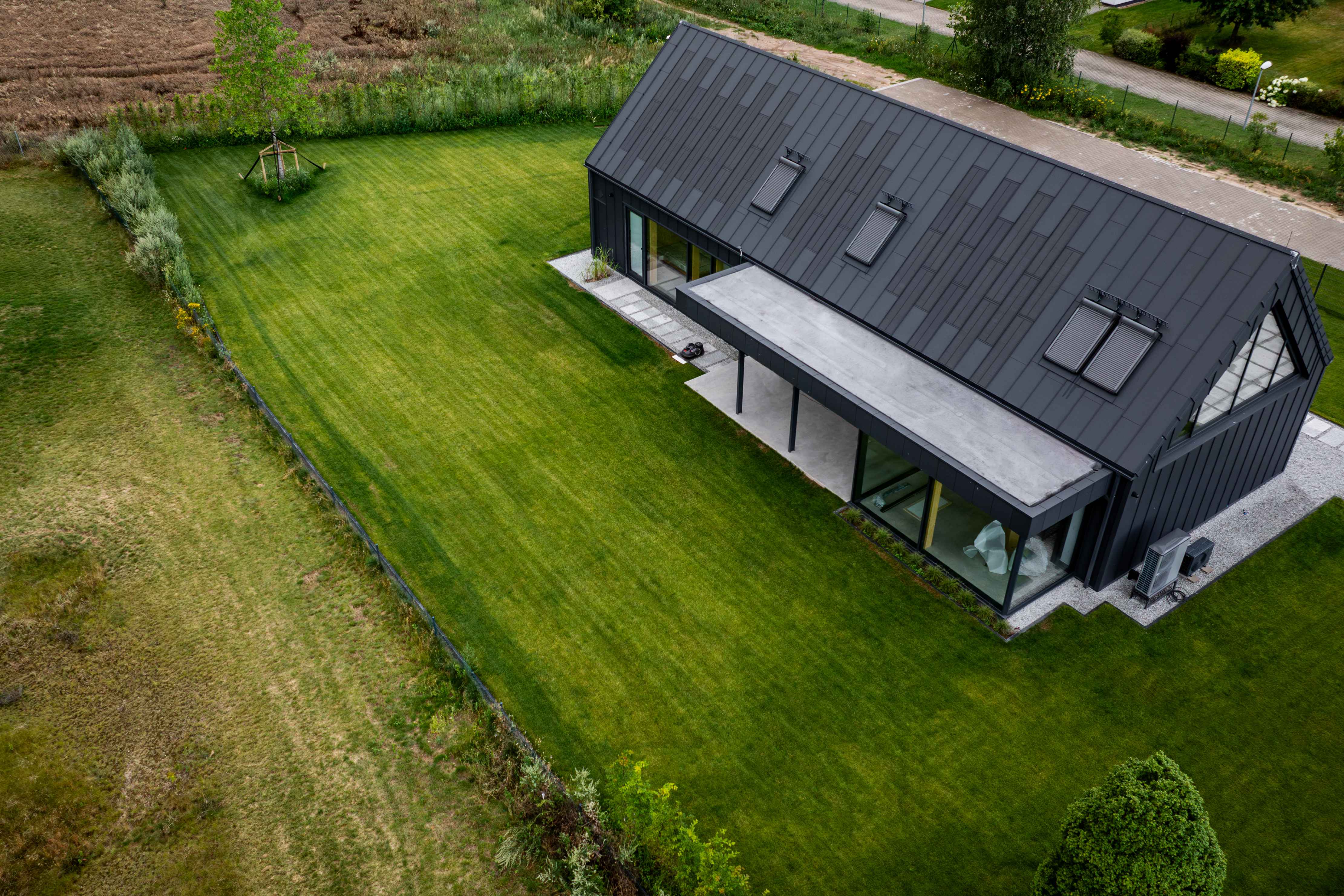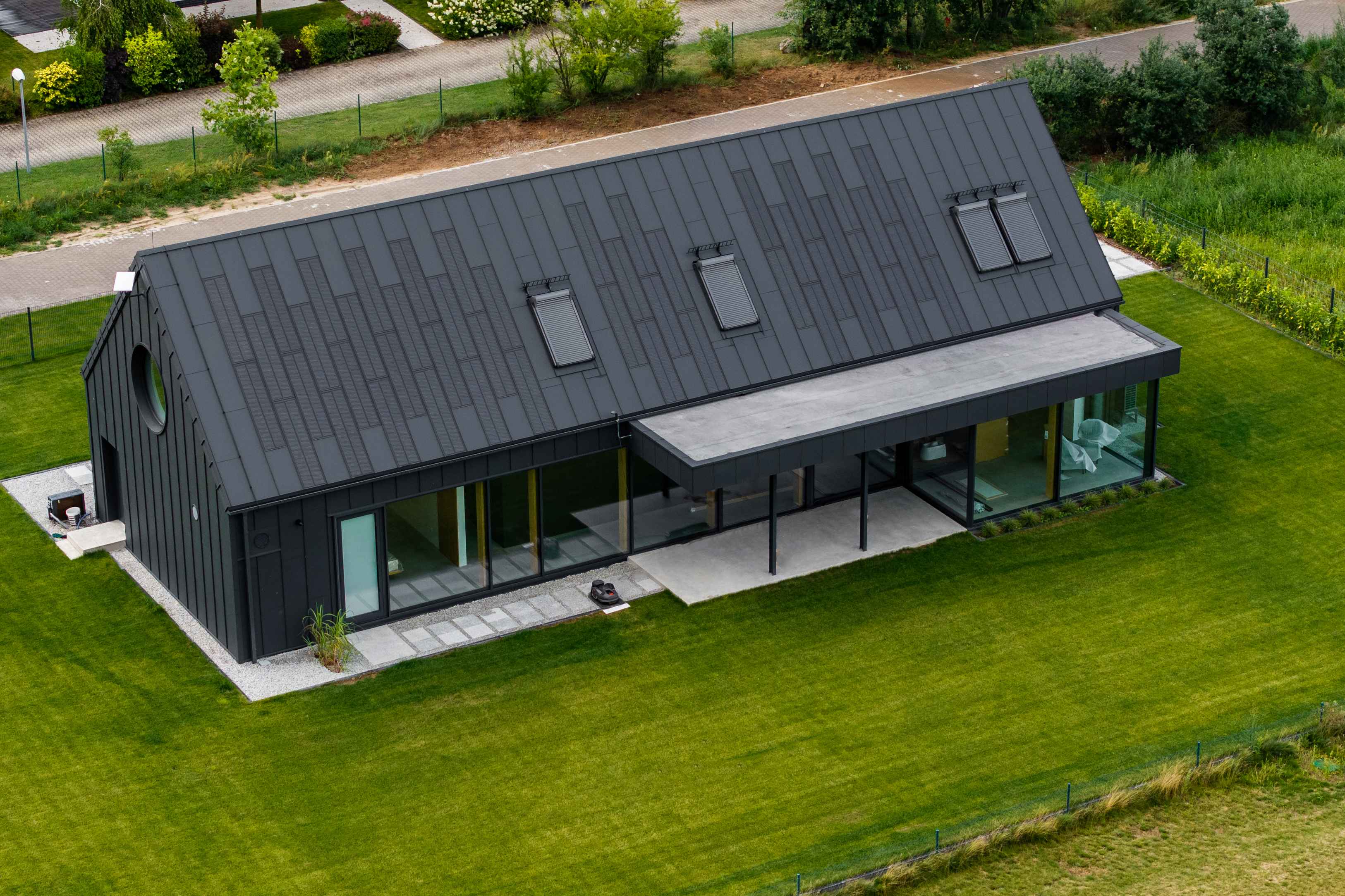Największą zaletą tej nowoczesnej stodoły jest estetyka. Panele fotowoltaiczne SOLROOF wraz ze stalowymi, nieaktywnymi panelami dachowymi tworzą jednolitą powierzchnię, która idealnie komponuje się z prostą formą budynku. Dzięki dostępności paneli w dwóch długościach, montaż przebiega szybko i precyzyjnie, a dach zyskuje perfekcyjną spójność wizualną – również w miejscach trudniejszych, takich jak okolice okien dachowych czy powierzchnie częściowo narażone na zacienienie.