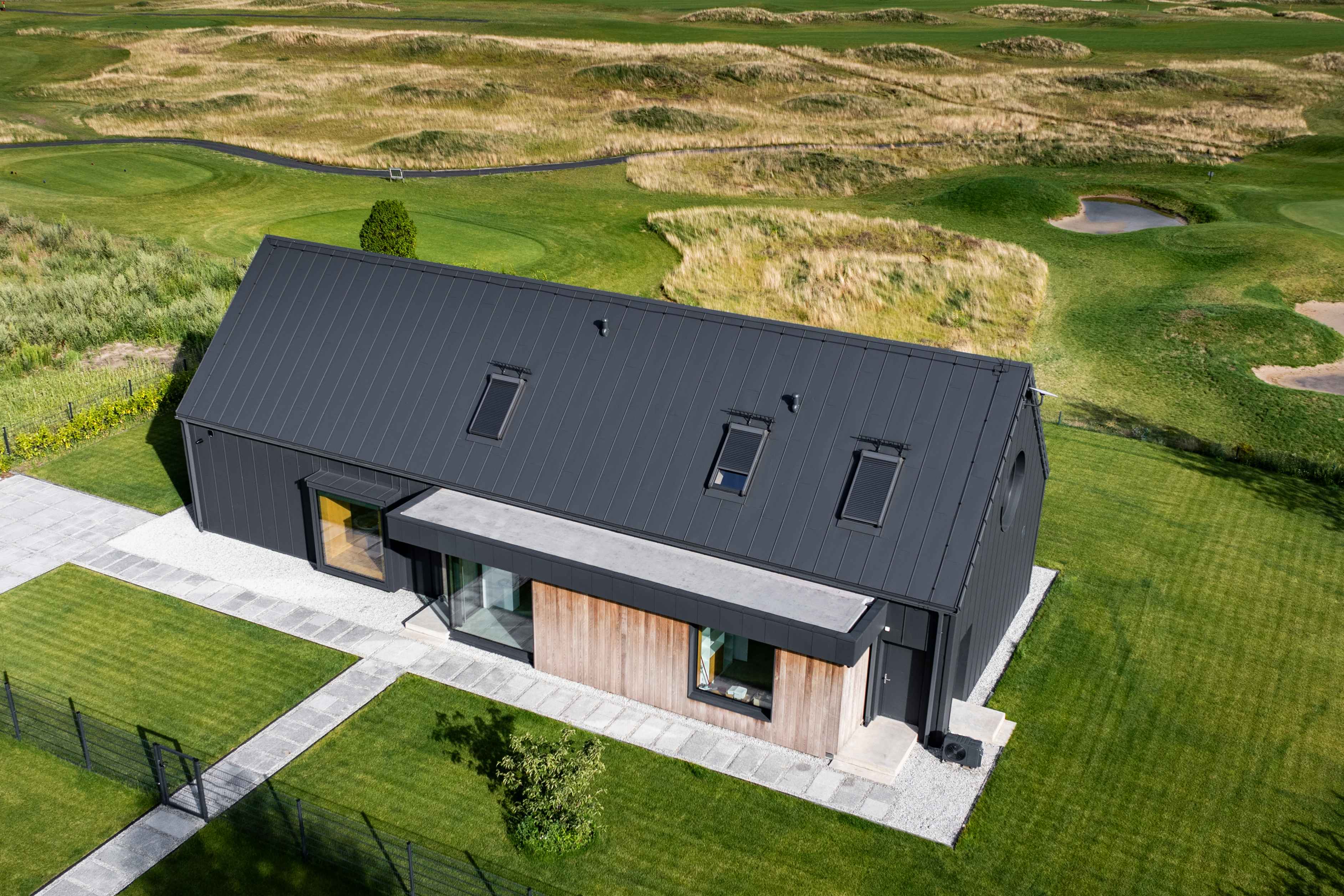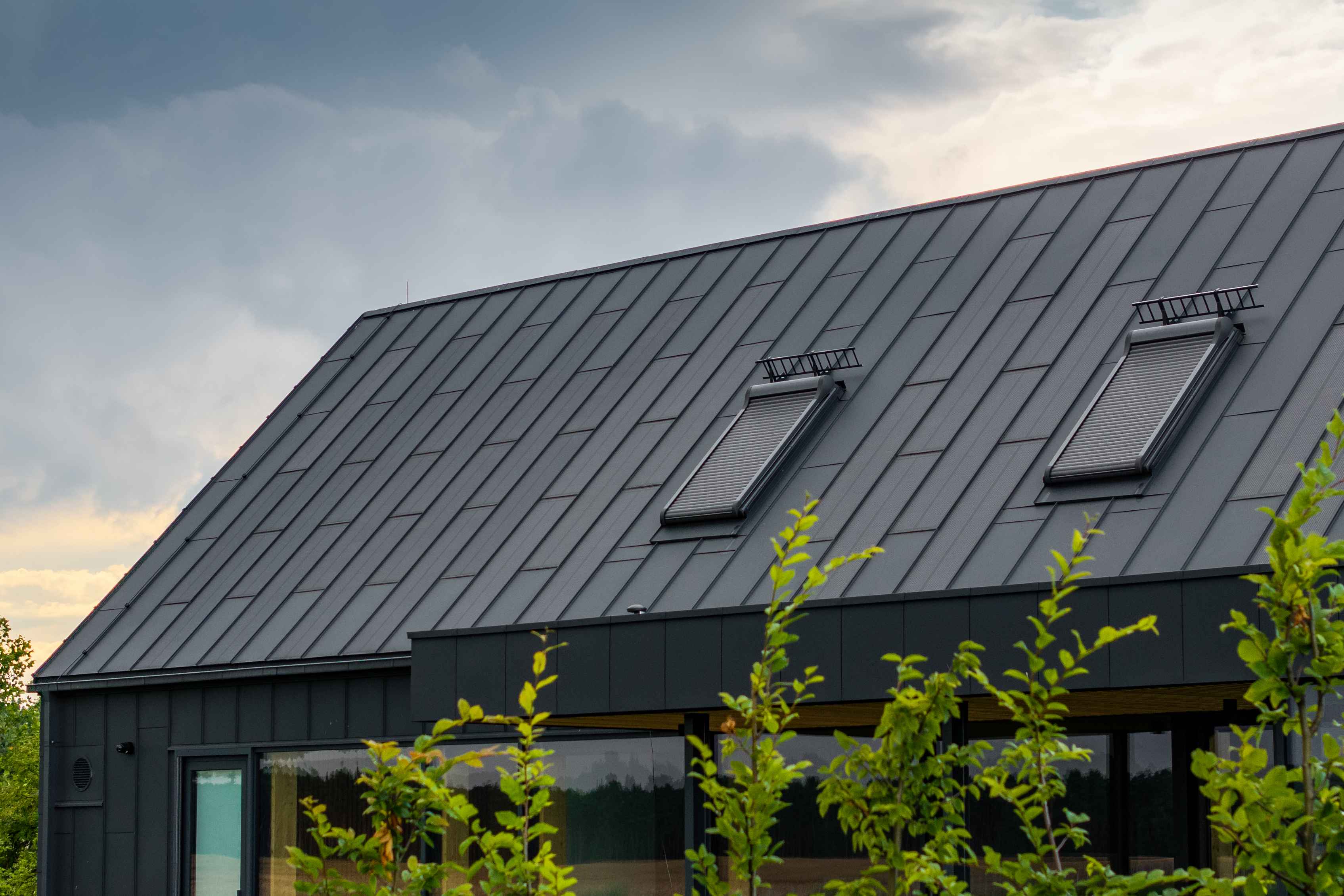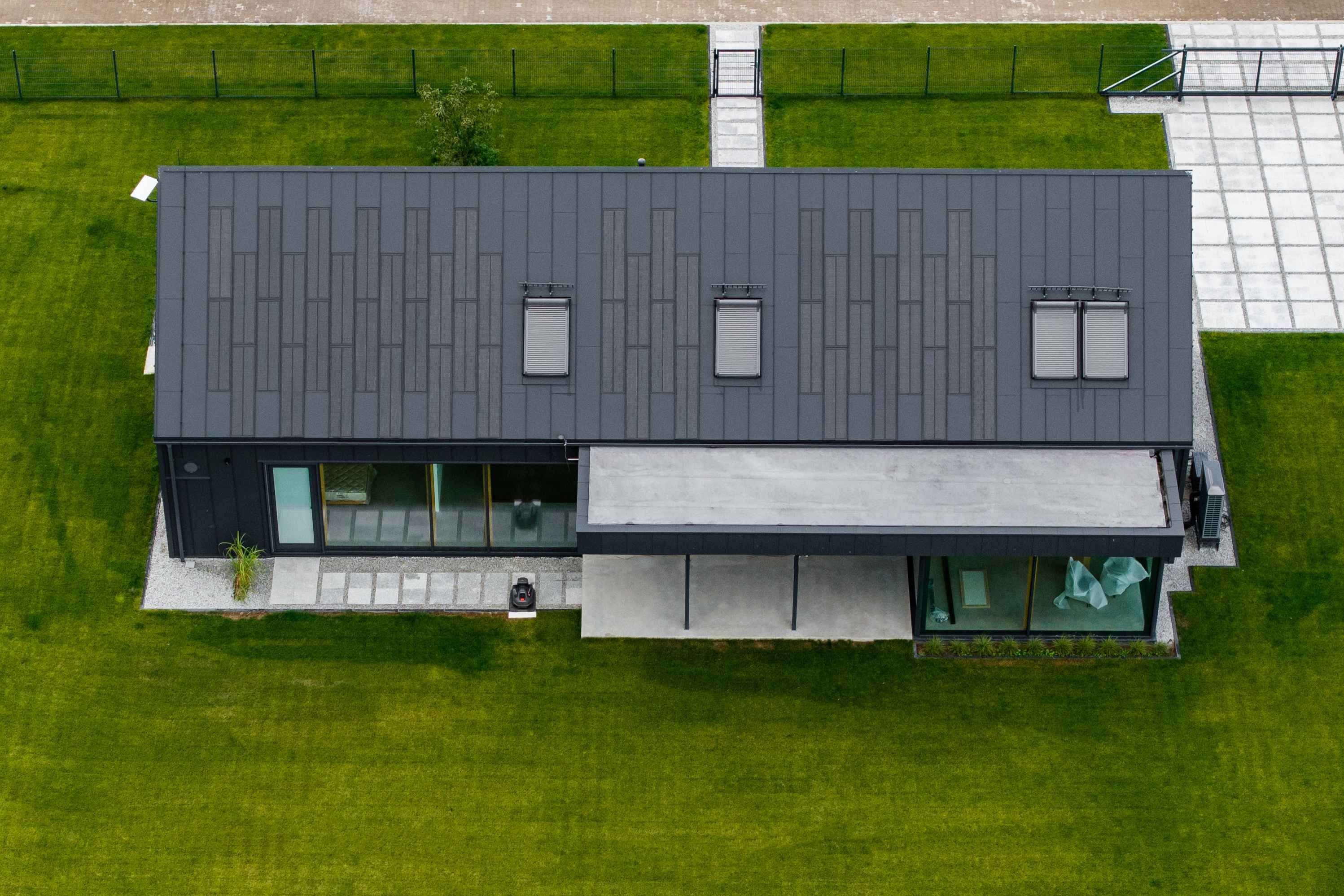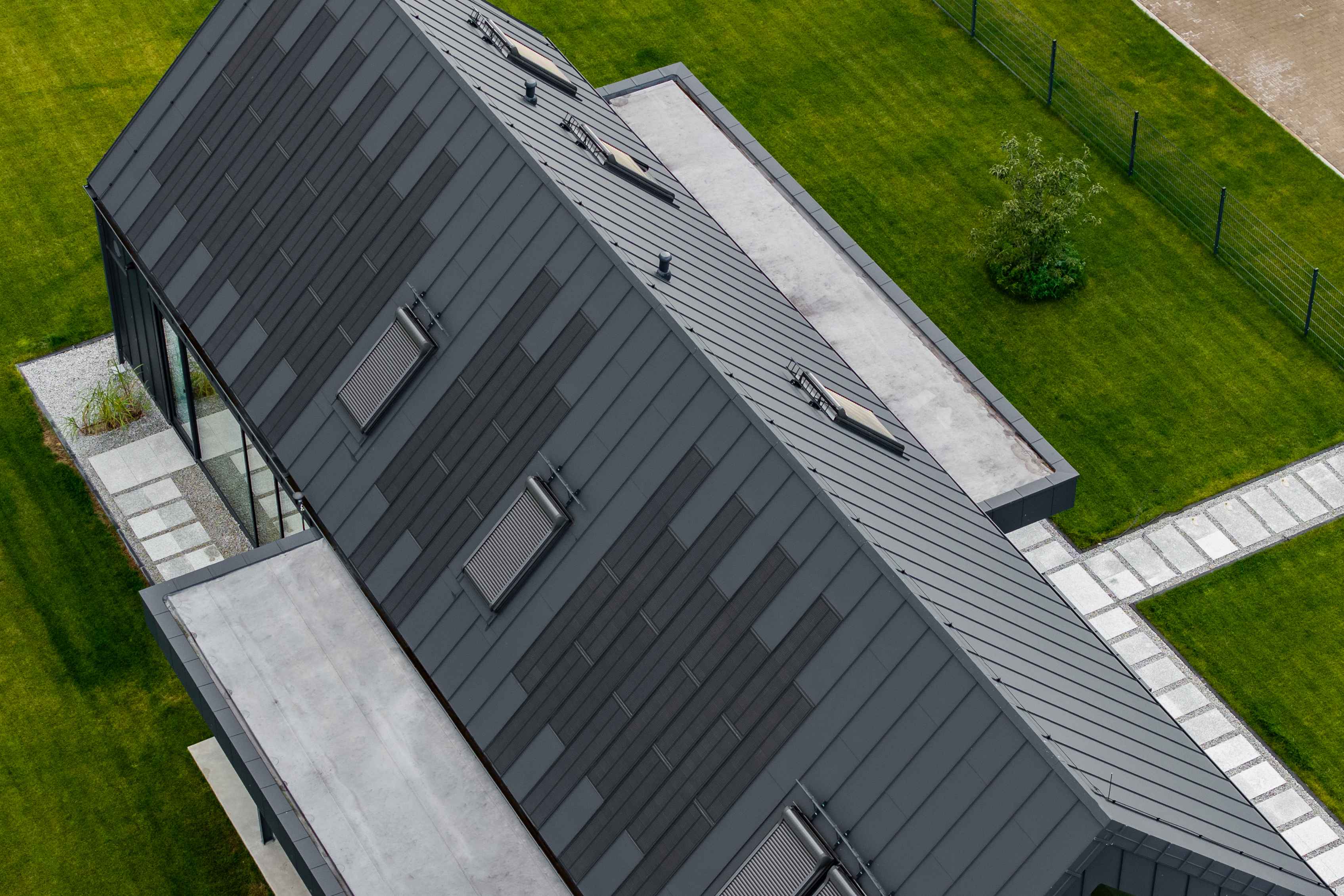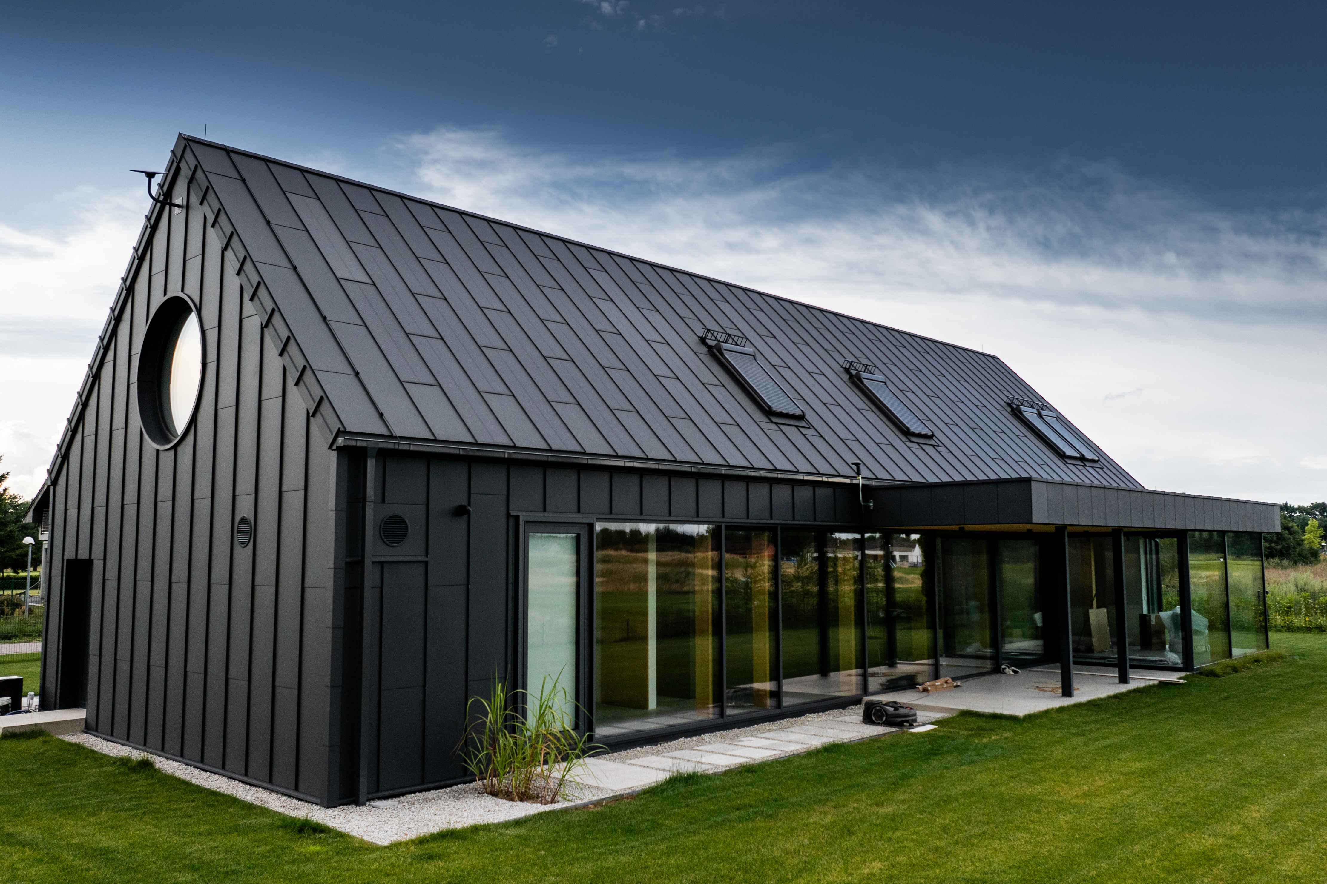 Największą zaletą tej nowoczesnej stodoły jest estetyka. Panele fotowoltaiczne SOLROOF wraz ze stalowymi, nieaktywnymi panelami dachowymi tworzą jednolitą powierzchnię, która idealnie komponuje się z prostą formą budynku. Dzięki dostępności paneli w dwóch długościach, montaż przebiega szybko i precyzyjnie, a dach zyskuje perfekcyjną spójność wizualną – również w miejscach trudniejszych, takich jak okolice okien dachowych czy powierzchnie częściowo narażone na zacienienie.