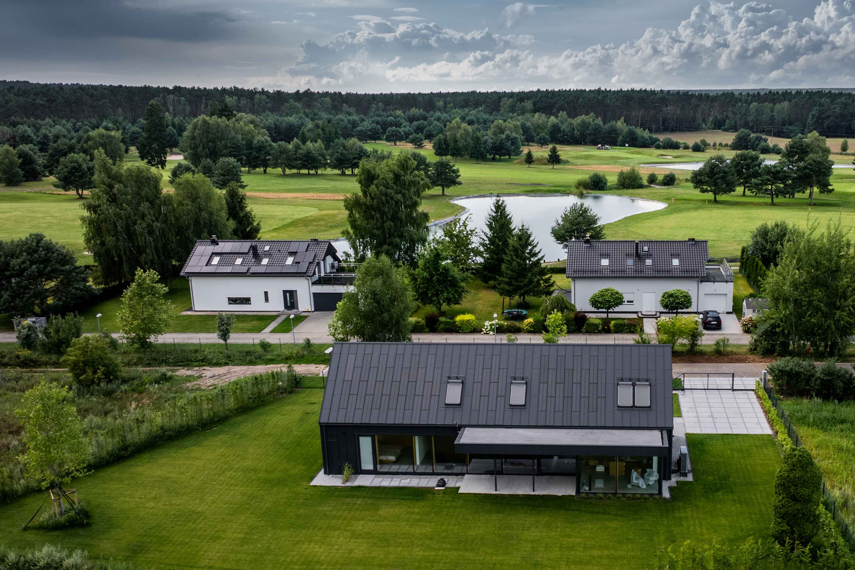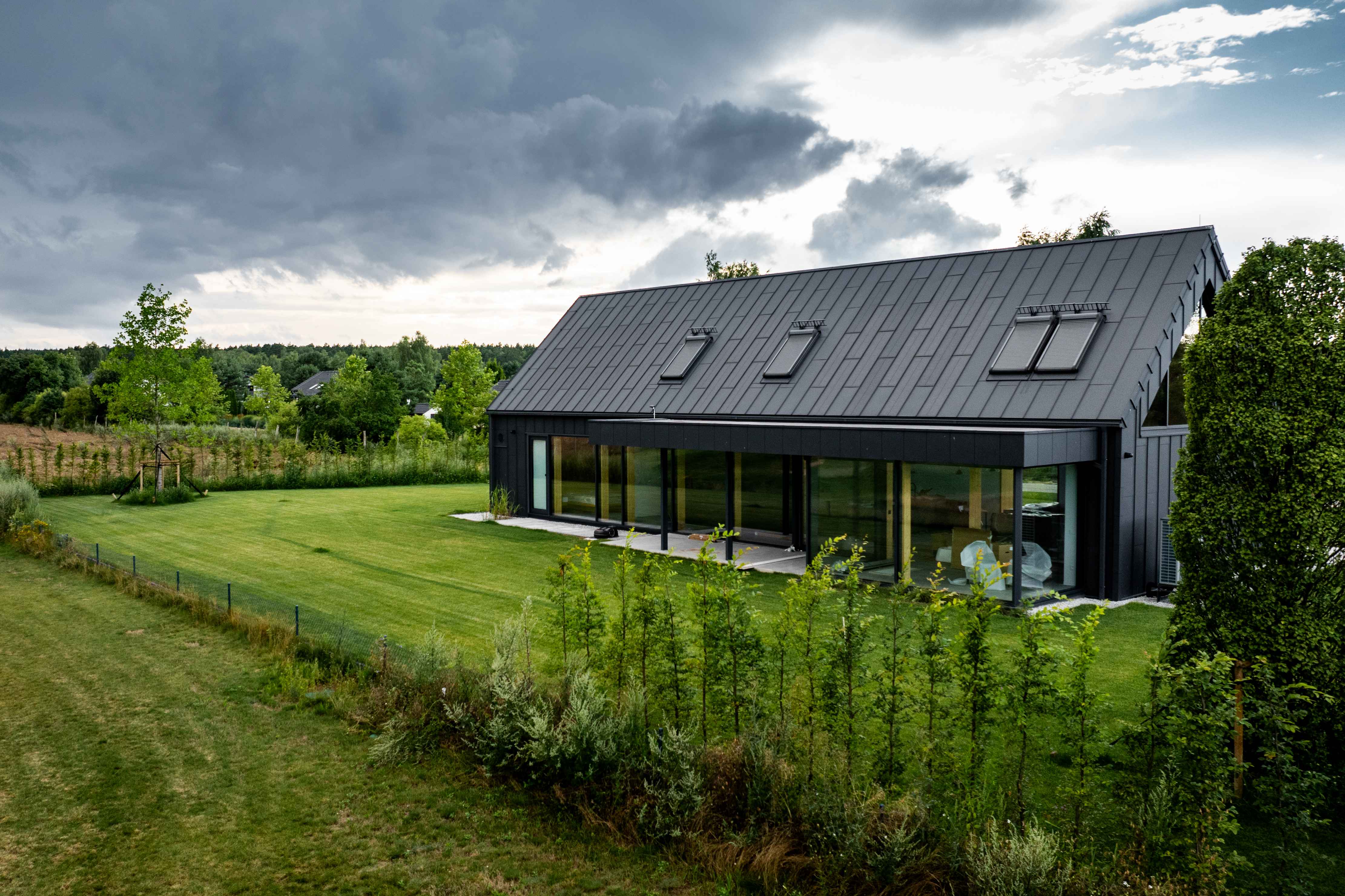 Prosta bryła budynku, dwuspadowy dach i otoczenie pełne zieleni – ta realizacja pokazuje, jak system SOLROOF – fotowoltaika ukryta w dachu, przekłada się na estetykę i wygodę, od projektu po montaż.