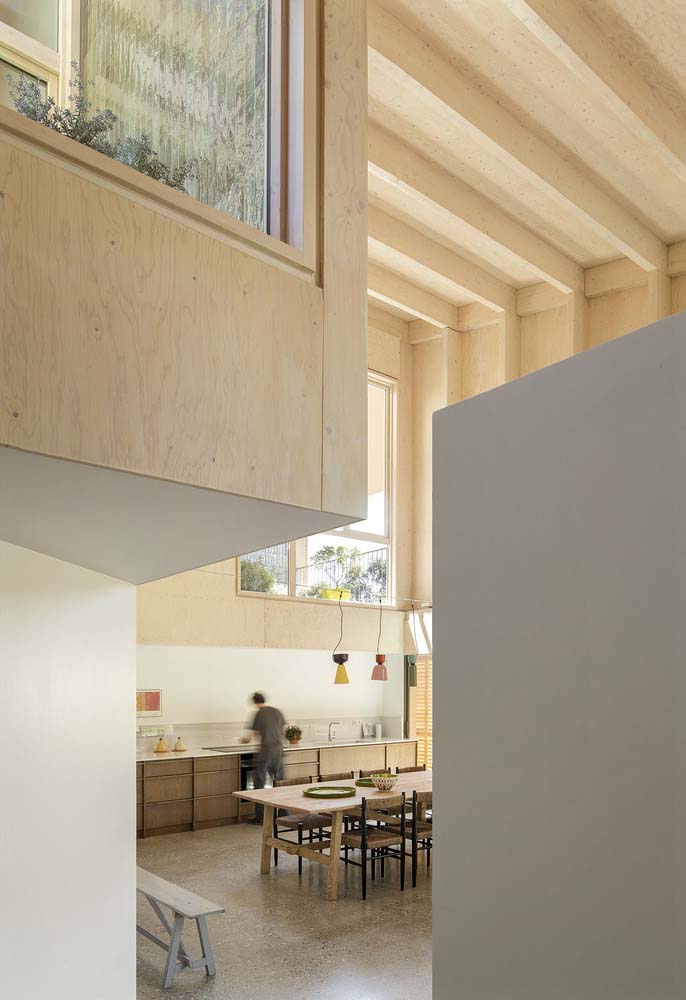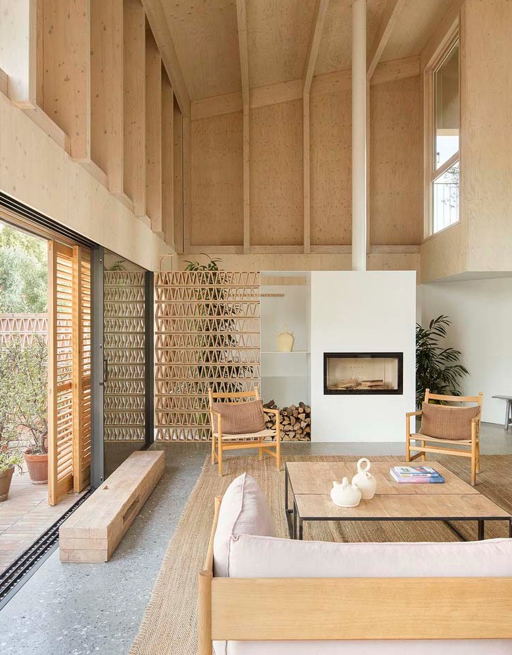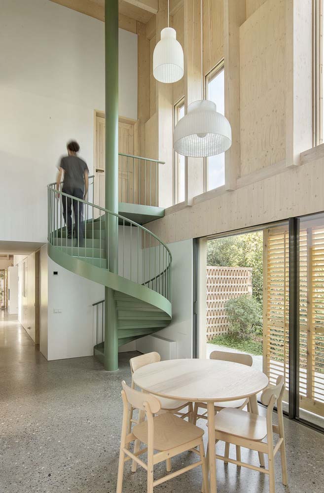Ciekawym elementem projektu PIN8 House jest zastosowanie drewna klejonego krzyżowo CLT w konstrukcji, które nadaje domowi przytulny, naturalny charakter. Drewno jest obecne zarówno w elewacji, jak i w meblach, co doskonale wpasowuje się w ideę budownictwa zero-kilometrowego oraz przedindustrialnego. Cała konstrukcja opiera się na solidnych metalowych filarach, które tworzą stabilną podstawę dla lekkiej, eleganckiej struktury z drewna. Zewnętrzne drewniane panele chronią wnętrze przed nadmiernym nasłonecznieniem, co zwiększa komfort użytkowników.