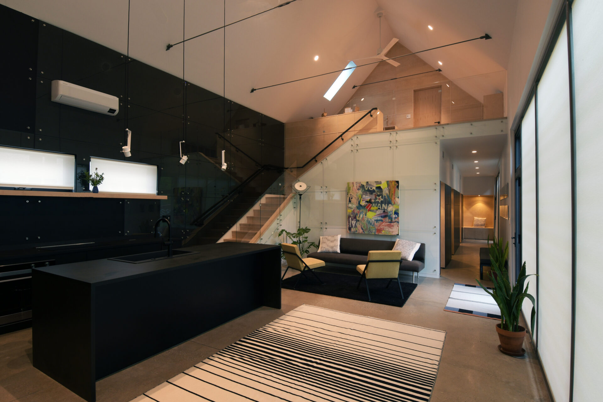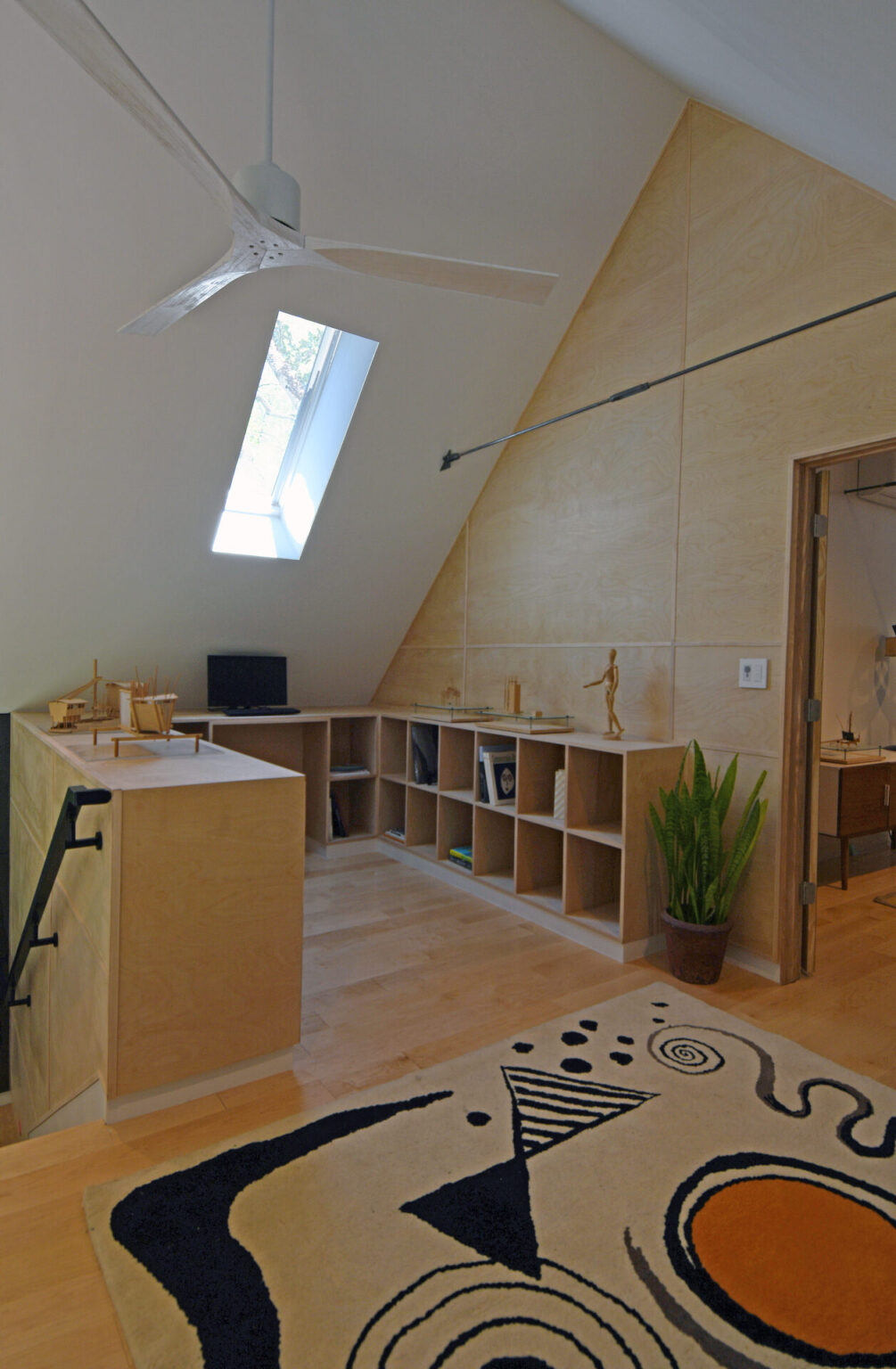 Otwarta klatka schodowa prowadzi do wielofunkcyjnego, loftowego pokoju z pełną łazienką – miejsca, które łatwo dostosować do różnych scenariuszy życia. Nad wolnostojącym garażem zaprojektowano kompaktowe ADU (samodzielny aneks mieszkalny) z niezależnym wejściem z zewnątrz. Taki układ daje właścicielom elastyczność i potencjalny dochód z najmu, jednocześnie wspierając zwiększanie gęstości zabudowy.