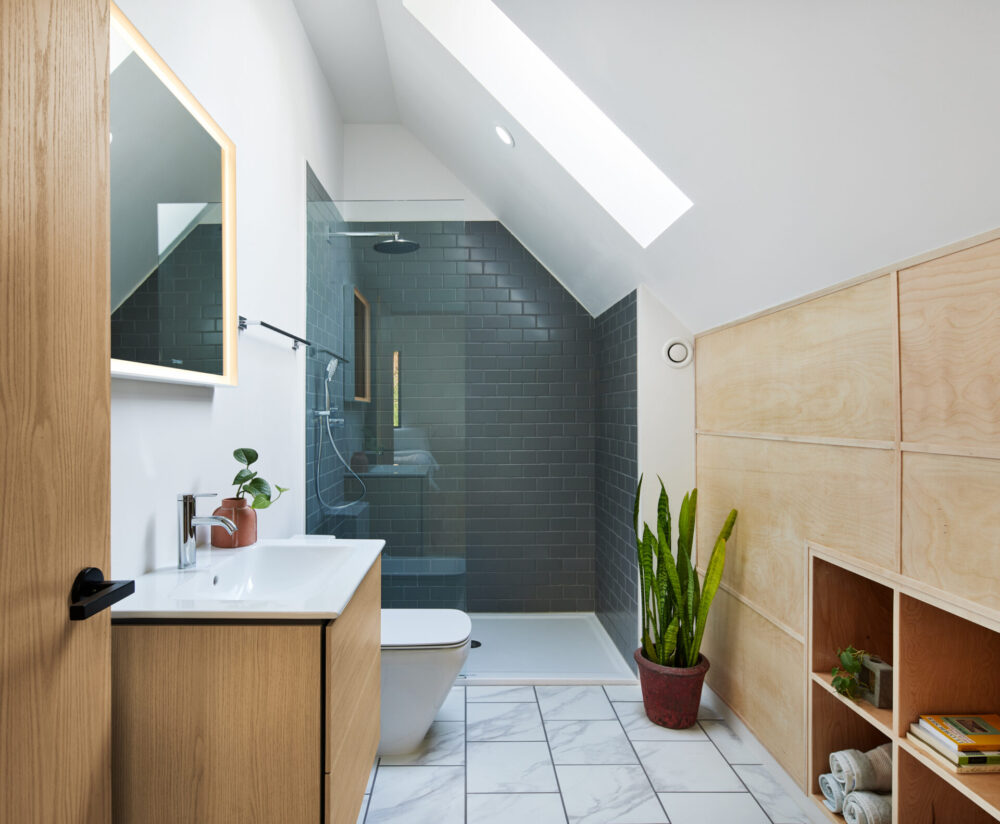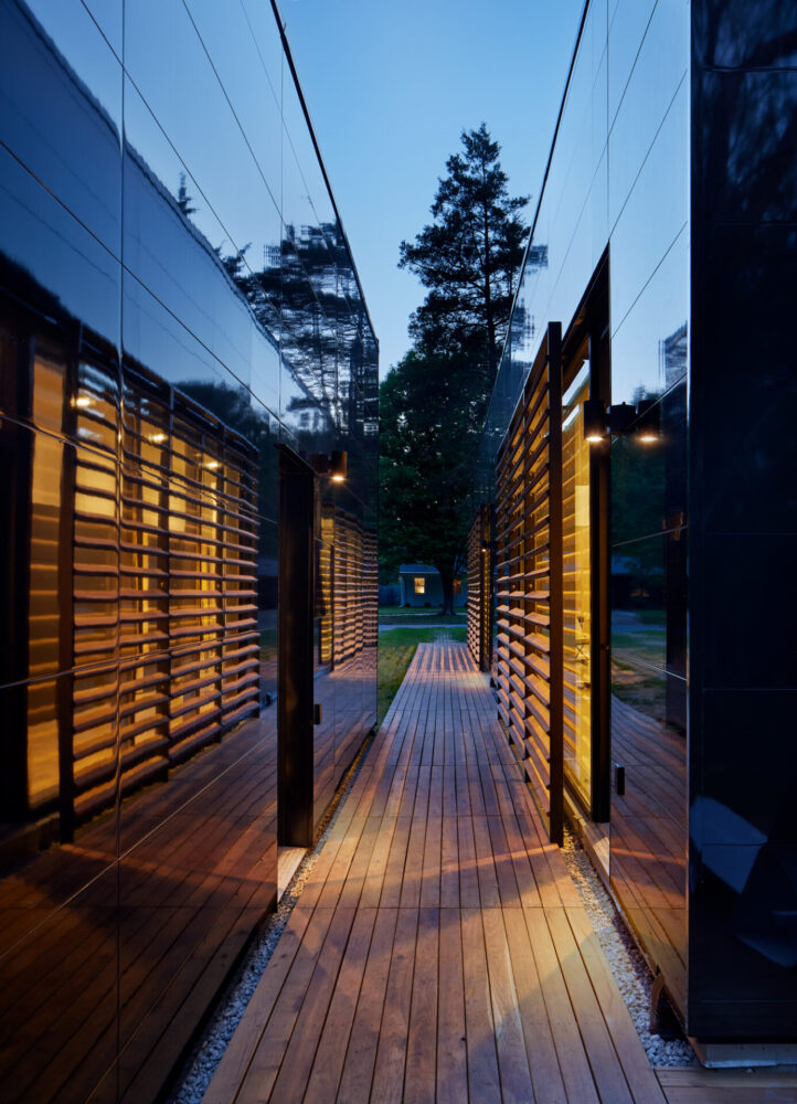 Bryła opiera się na archetypie dwuspadowych „gable forms” wykończonych wentylowaną fasadą typu rainscreen. Okładzina jest w pełni nadająca się do recyklingu, a przegrody mają warstwowe uszczelnienia (powietrze, para, woda), tworząc szczelną i trwałą obudowę. Izolacja przewyższa wymagania kodeksowe, co ogranicza straty energii i poprawia komfort przez cały rok.