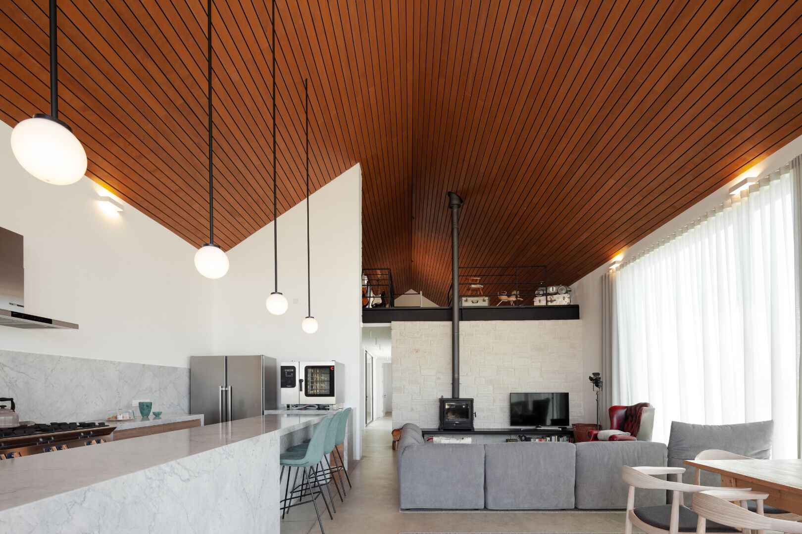 Konstrukcja budynku oparta została na stalowym szkielecie, który obudowano nowoczesnym, izolowanym systemem fasadowym obejmującym również dach. Takie rozwiązanie ogranicza mostki cieplne i wzmacnia energooszczędność domu, jednocześnie nadając mu spójny, minimalistyczny wygląd. Elewacja z lokalnego kamienia, „wbudowana” w bryłę, nawiązuje do regionalnej tradycji, natomiast we wnętrzach zastosowano drewniane listwy sufitowe, które ocieplają przestrzeń i podkreślają lokalny charakter projektu domu w stylu nowoczesnej stodoły.