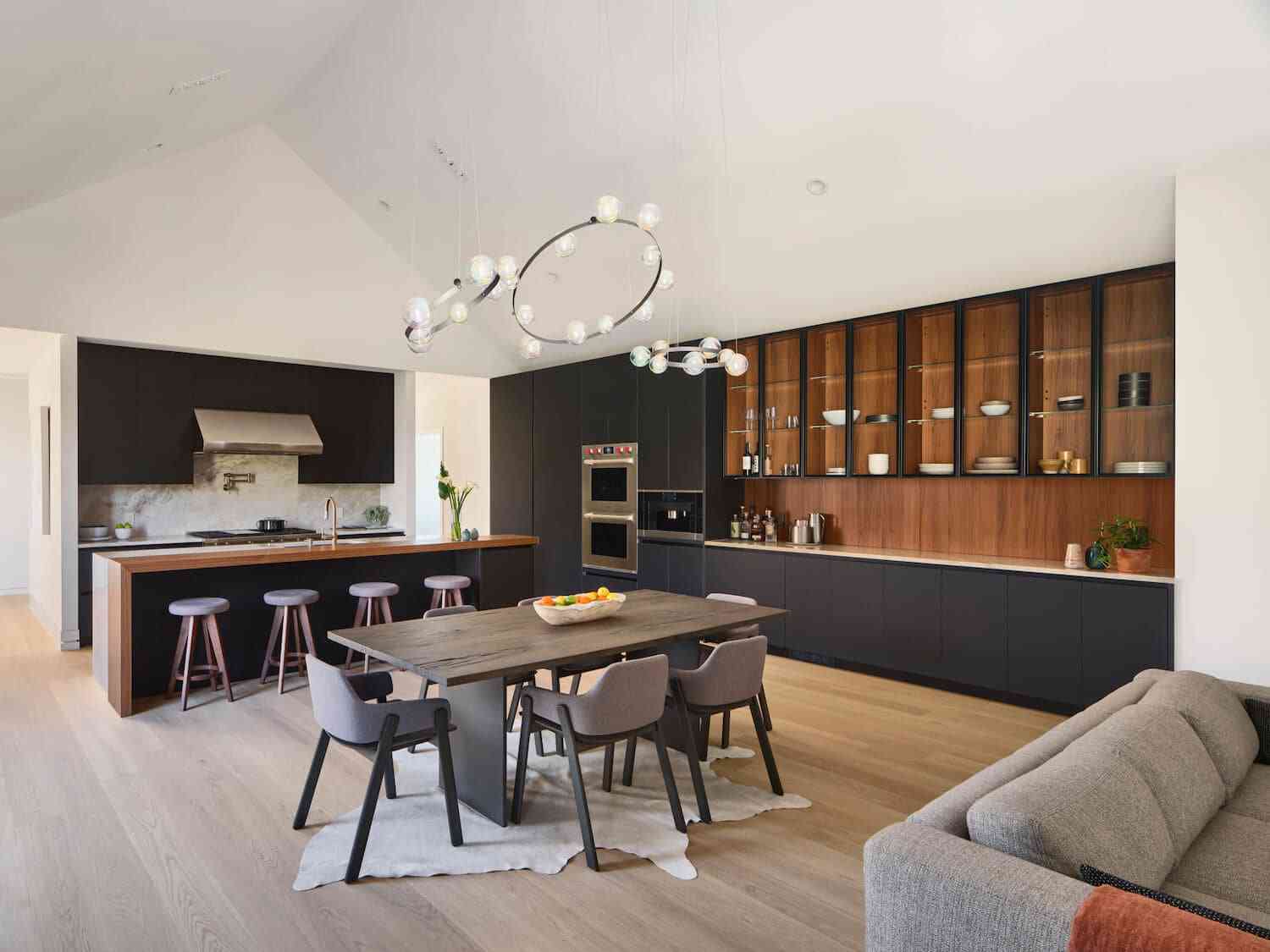 Ważnym elementem tego projektu jest światło naturalne, które nieustannie zmienia charakter wnętrz. Popołudniowe słońce wpada do sypialni przez duże przeszklenia, a świetlik w łazience doświetla apartament główny, który znajduje się w prywatnym skrzydle rezydencji. Przemyślane otwarte schody prowadzą na dolny poziom, gdzie znajduje się przestronny pokój rodzinny oraz pokoje gościnne. Z salonu można przejść bezpośrednio na zadaszone patio i do kuchni na świeżym powietrzu, co umożliwia płynne przenikanie się przestrzeni wewnętrznej i zewnętrznej. Hartford Residence to przykład nowoczesnej architektury, która oferuje komfort, elegancję i silne połączenie z otaczającym krajobrazem.