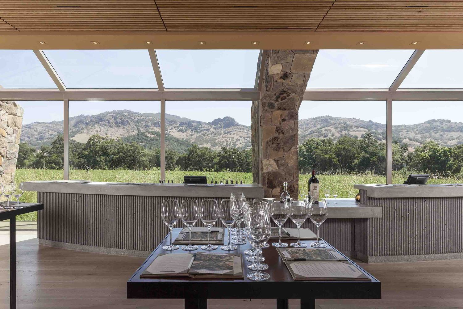 Najważniejszym elementem lobby jest jednak przestronna sala degustacyjna z barem, którego tło stanowi panoramiczny widok na winnice Napa Valley oraz pasma górskie widoczne w oddali. Duże przeszklenia od podłogi do sufitu, drewniany sufit, solidne kamienne ściany i naturalne materiały potęgują wrażenie jednoczesnego przebywania we wnętrzu i na zewnątrz. Ta nowoczesna stodoła w sercu winnicy łączy monumentalną formę z subtelną elegancją – kontrast między ciemnym kamieniem a dużymi oknami podkreśla jej symboliczne znaczenie. Całość dopełniają tarasy zewnętrzne oraz ogrody skalne obsadzone lokalną roślinnością, które wzmacniają związek architektury z krajobrazem i klimatem regionu.