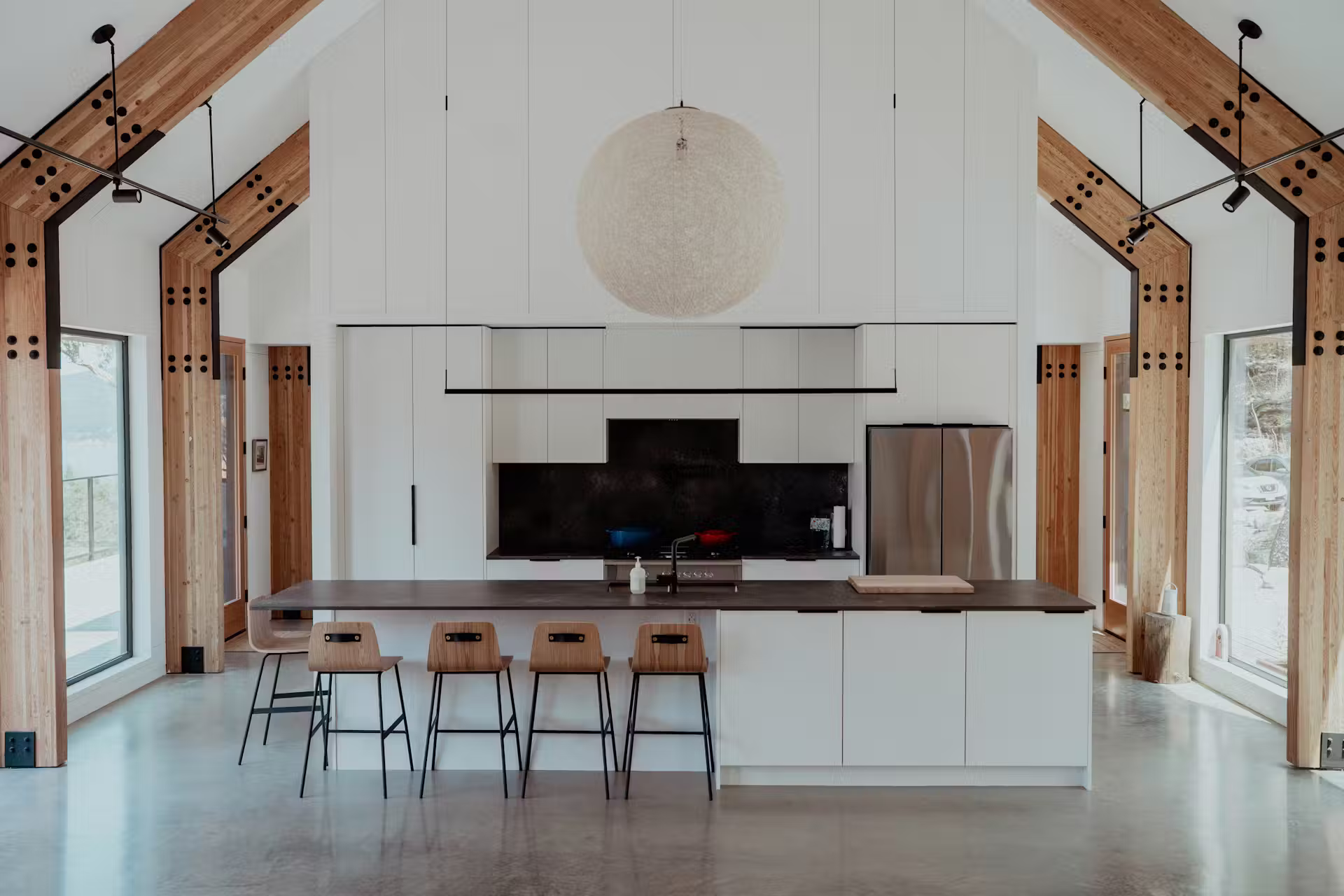 We wnętrzach dominuje naturalne światło, duże przeszklenia oraz nienachalna, neutralna kolorystyka. Otwarta kuchnia została wyposażona w szafki w ciemnozielonym kolorze i blaty z kwarcu, a jej dopełnieniem jest wyspa o powiększonej powierzchni roboczej. Betonowa posadzka, charakterystyczne belki z drewna klejonego oraz przemyślane detale nadają wnętrzom trwałość i ponadczasowy charakter.