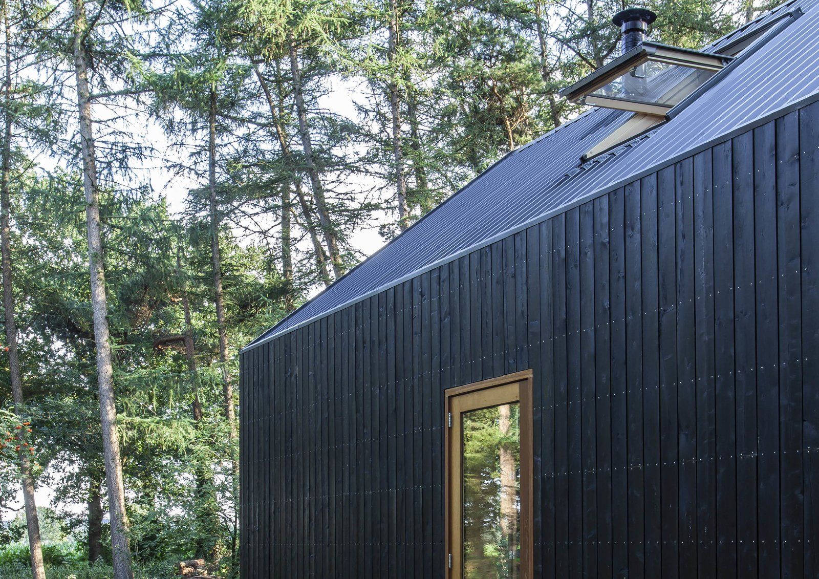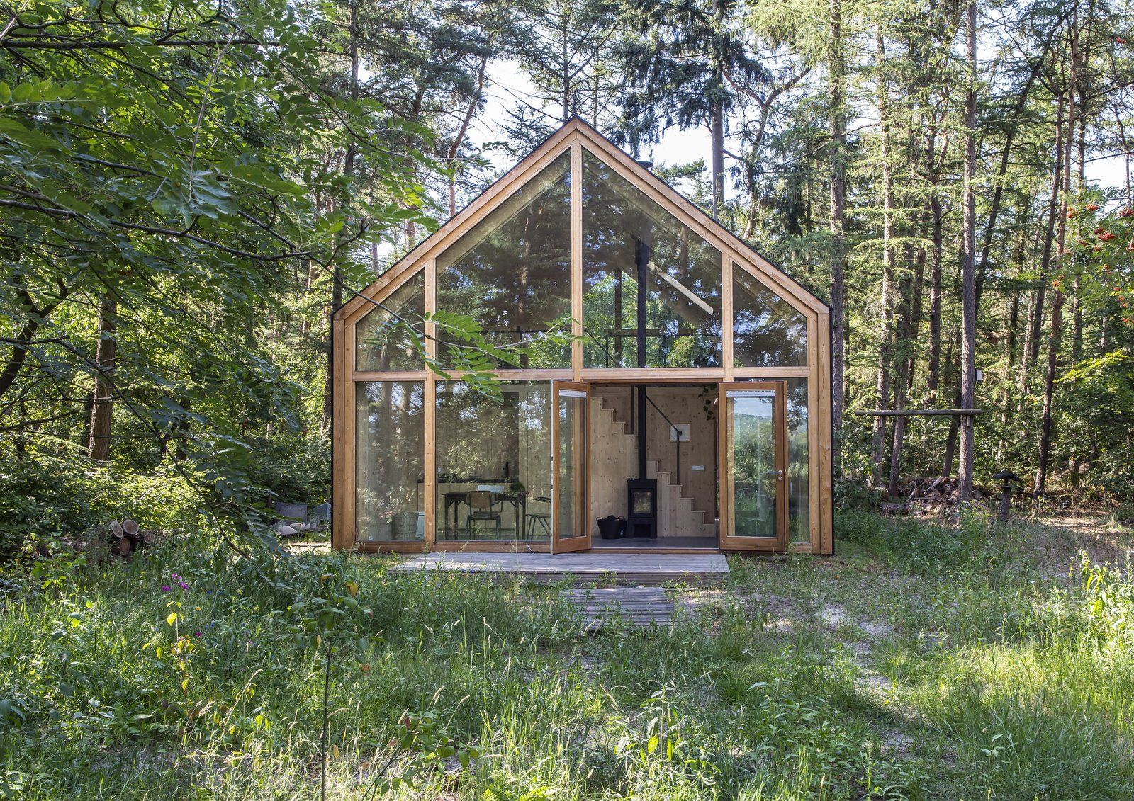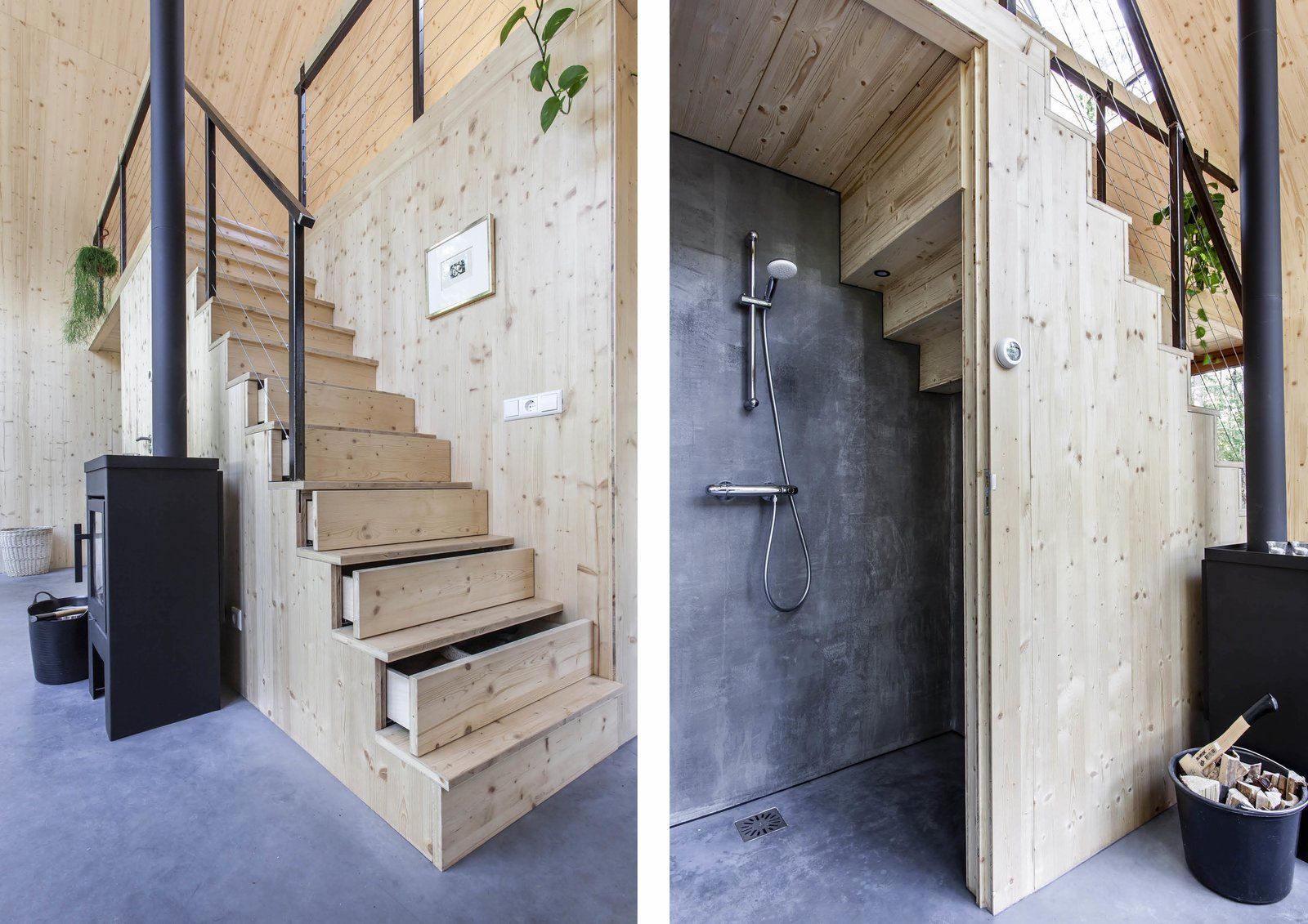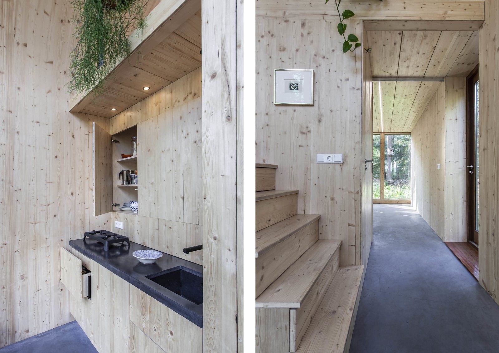Centralnym elementem wnętrza jest drewniany moduł funkcjonalny, w którym mieszczą się kuchnia, łazienka, prysznic oraz schody prowadzące na otwarte poddasze sypialniane. Od strony północnej zaprojektowano studio artystyczne, natomiast od południa znajduje się salon i jadalnia z widokiem na otaczający las. Podłogi wykonano z barwionego betonu, a wnętrza wykończono trójwarstwowymi, giętymi płytami z drewna sosnowego, które zapewniają stabilność konstrukcji bez dodatkowych wzmocnień. Dzięki dobrej izolacji cały dom ogrzewany jest niewielkim piecykiem na drewno, a duże przeszklenia wizualnie wciągają krajobraz do środka, czyniąc naturę integralną częścią codziennego życia i pracy.