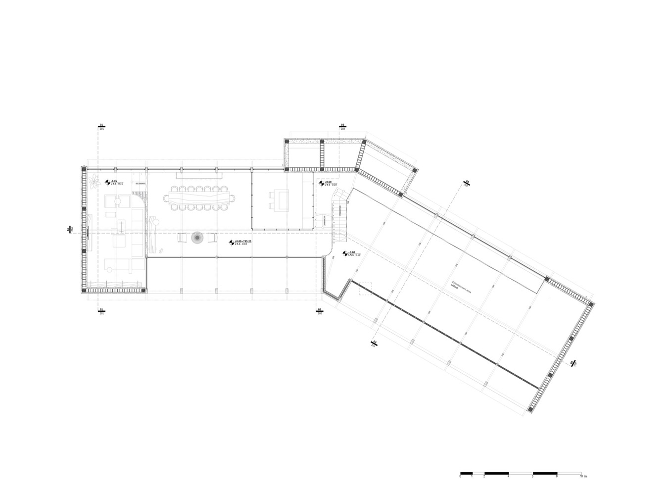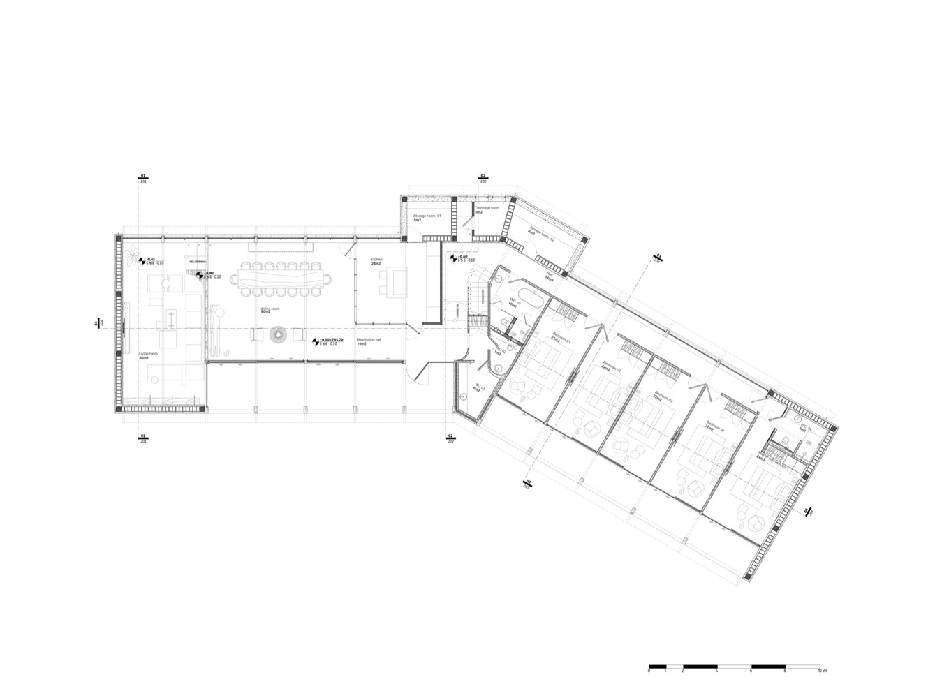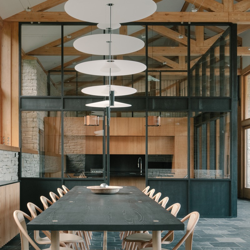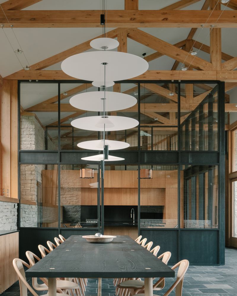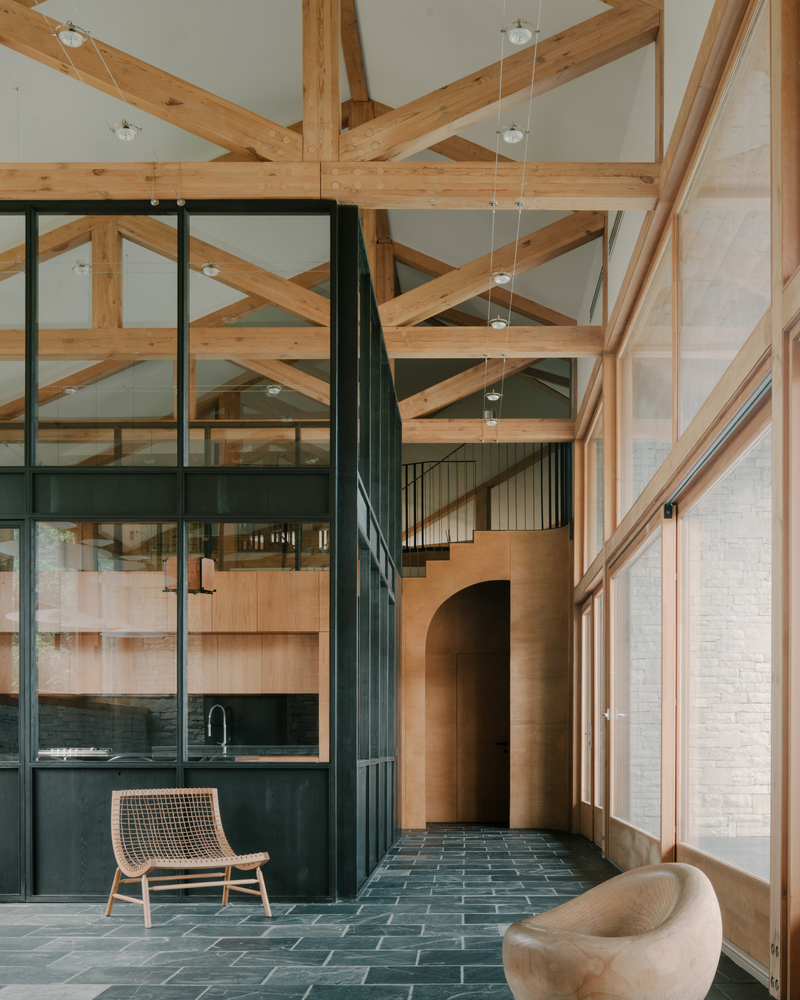 Parterową bryłę zbudowano z konstrukcji kamiennych i drewnianych, które w pewnym stopniu stanowią znaczną część wnętrza. Wielkoformatowe przesłony w elewacji pozwalają zamienić otaczającą przyrodę w część wnętrza i lepiej połączyć bryłę z otoczeniem. Wnętrze skupia się na symbiozie chropowatych i subtelnych elementów oraz ich równowadze. Prostopadle do domu umieszczono piwnicę, utrzymaną w tej samej wizualizacji architektonicznej, która tworzy całościową kompozycję terenu.