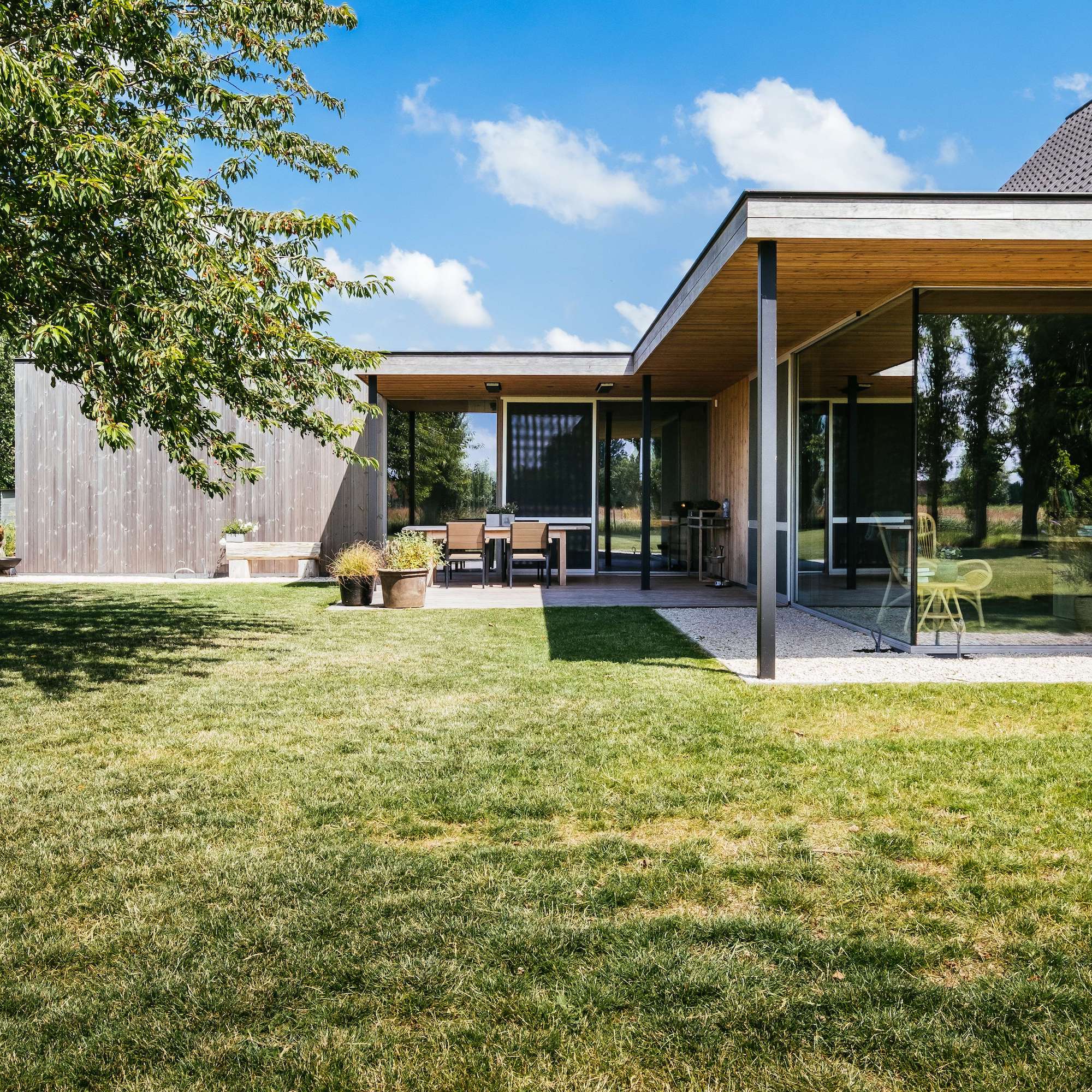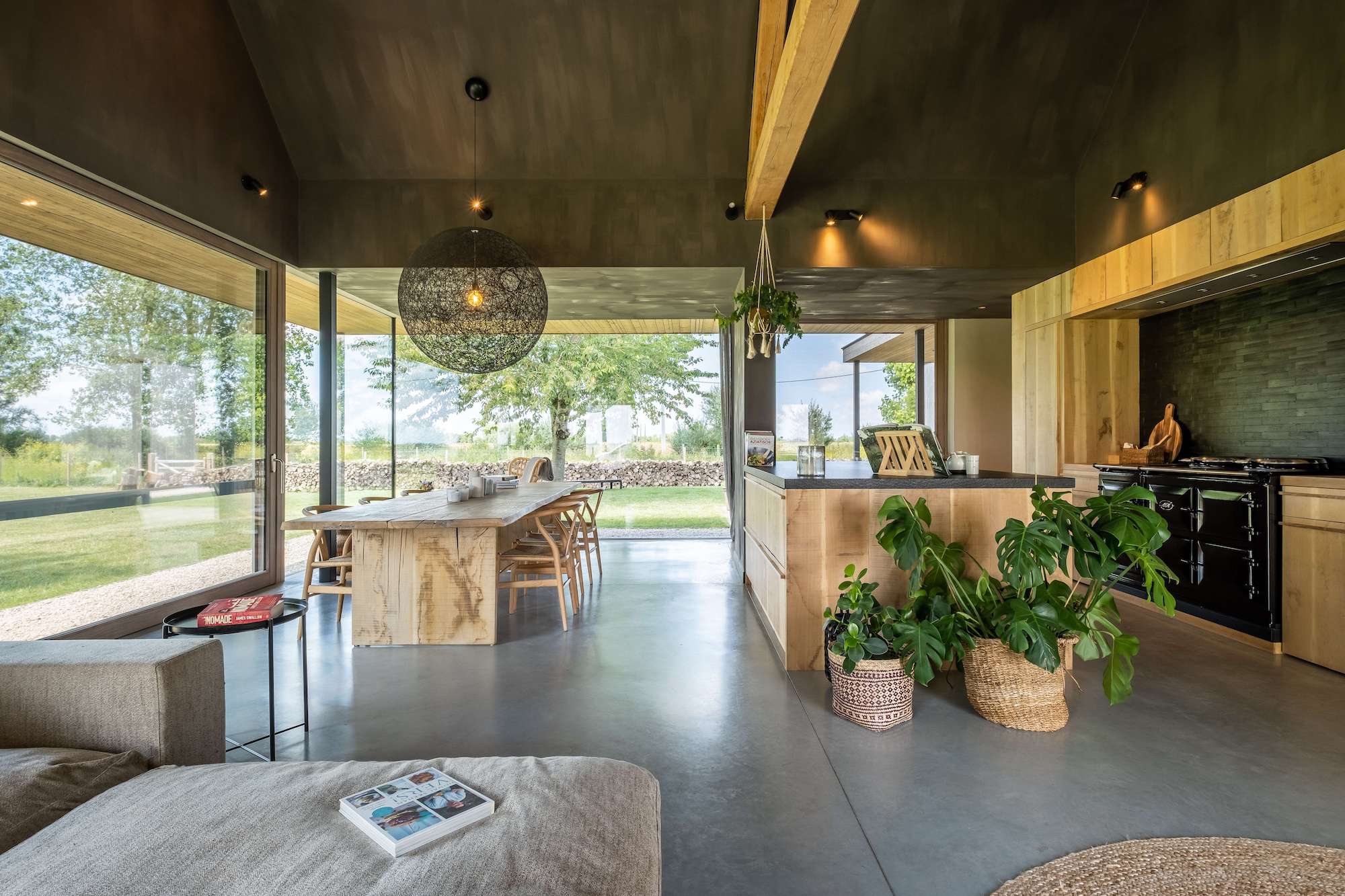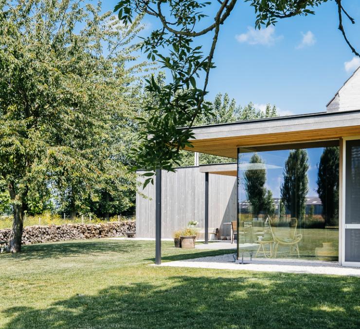 Na pierwszy rzut oka, frontowa część domu w Ramskapelle nie zdradza pełnej okazałości projektu. Budynek, pokryty klasycznym kamieniem, z tradycyjnym dachem dwuspadowym i blachodachówką, wpisuje się w lokalny krajobraz. To jednak, co ukryte w głębi posesji, zaskakuje odwiedzających – projekt charakteryzuje się wielkimi przeszklonymi powierzchniami, które zapraszają naturę do wnętrz i wypełniają przestrzeń naturalnym światłem. Dzięki przeszklonym elewacjom, dom staje się w pełni zintegrowany z otoczeniem, dając poczucie otwartości na przyrodę.