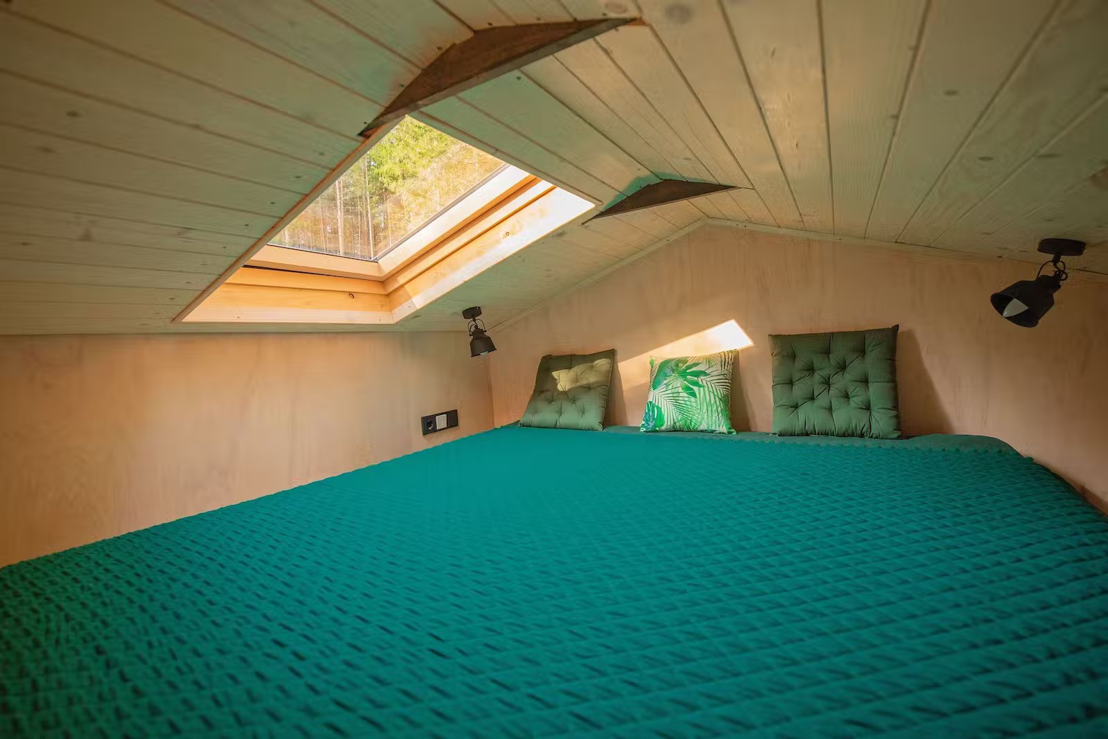 Datscha, czyli stodoła na kółkach, jest pokryta metalowym dachem z rąbkiem stojącym i jasnym świerkiem, co sprawia, że domek jest lekki i łatwy do transportu. „Najważniejsze dla nas było, aby domek był możliwie jak najlżejszy, z masą nieprzekraczającą 5 ton” — wyjaśnia Anna. Zewnętrzna strona budynku została pomalowana na półprzezroczysty biały kolor, aby nadać mu wygląd surowego drewna. Wewnątrz znajdują się drewniane panele na podłodze oraz sufit ze świerku, a ściany z sklejki z naturalnym usłojeniem nadają pomieszczeniom subtelny, ekologiczny charakter. W kuchni kuzyn Anny, Marek, stworzył funkcjonalny stół jadalny z drewna bukowego, który chowa się w szafkach, a po drugiej stronie znajduje się blat z drewna bukowego z żywymi krawędziami. Żeliwna drabina, zaprojektowana przez matkę Anny, prowadzi na poddasze sypialne, gdzie znajduje się świetlik dachowy, przez który można podziwiać gwiazdy bez opuszczania łóżka. Datscha, jako mobilny domek na kółkach, stał się synonimem ekologicznego minimalizmu i nowoczesnego stylu życia w zgodzie z naturą.