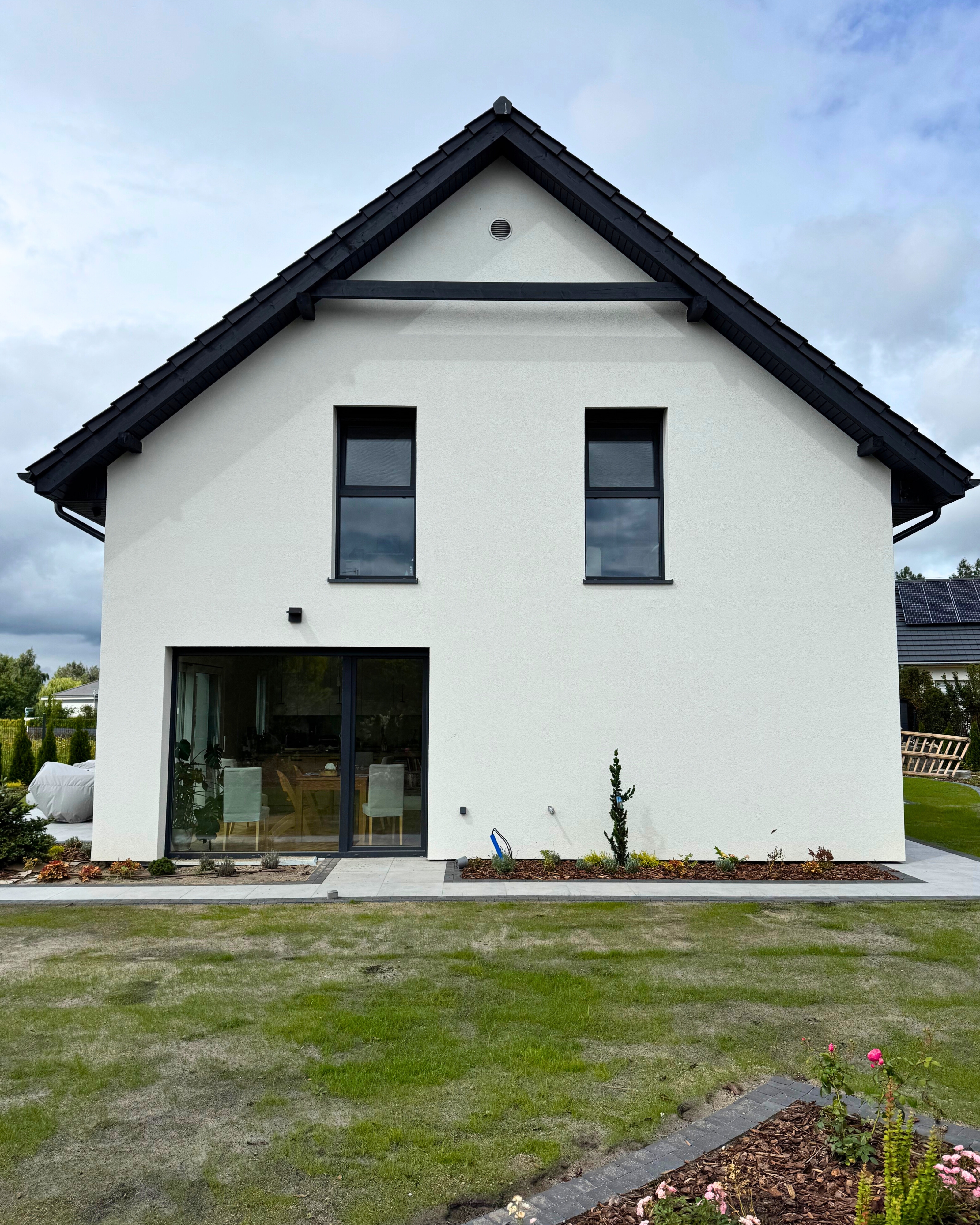 Wnętrze domu zostało zaplanowane z myślą o harmonii i praktyczności. Na parterze znajduje się przestronny wiatrołap z szafą, pomieszczenie techniczne oraz łazienka. Duży pokój naprzeciwko wejścia może pełnić rolę salonu gościnnego lub gabinetu. Największą zaletą jest jednak otwarta przestrzeń łącząca kuchnię z miejscem na duży stół oraz wygodną strefą wypoczynkową – idealną do wspólnego spędzania czasu.