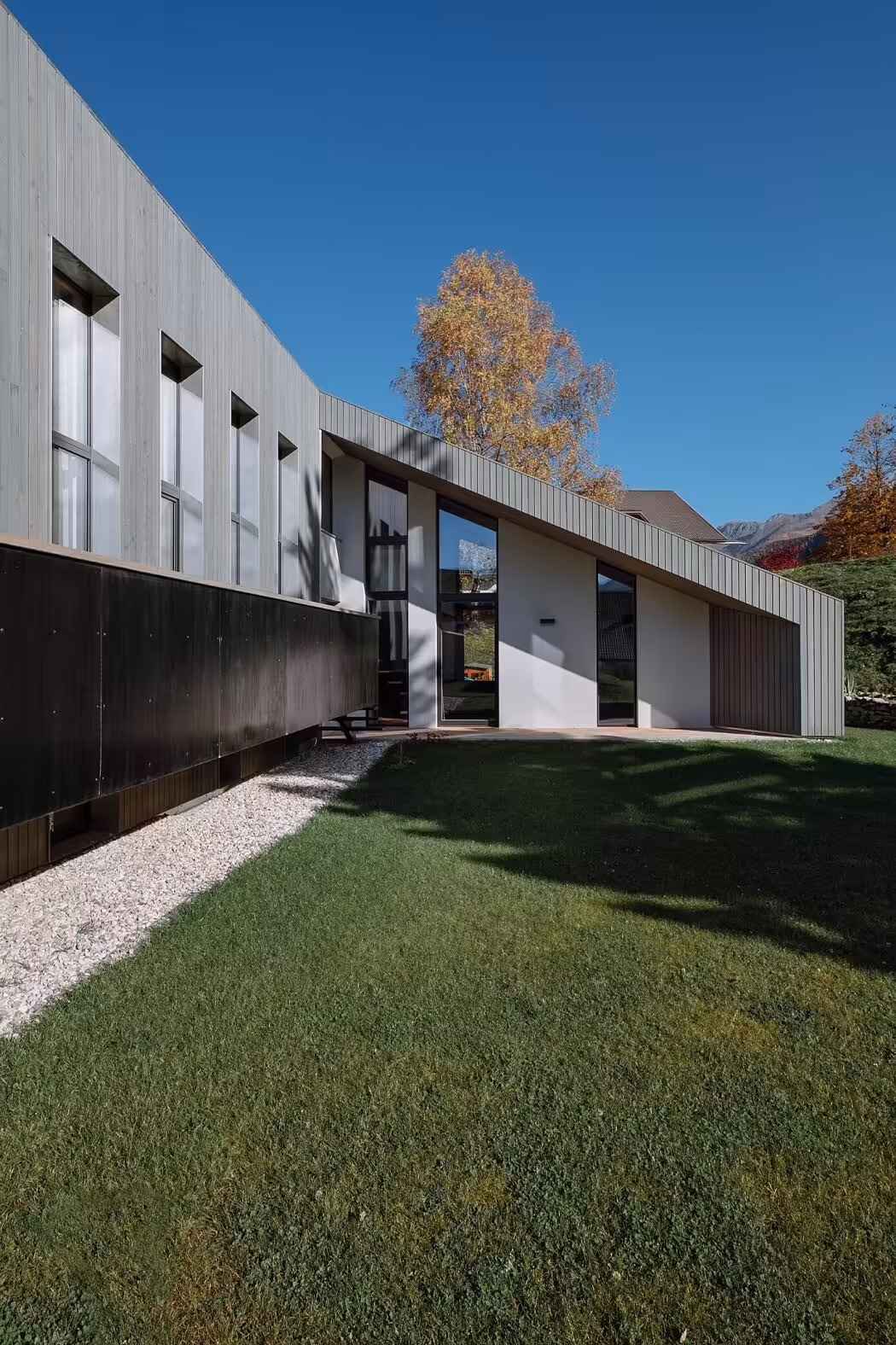 Projekt House L wyróżnia się minimalizmem i ograniczoną paletą materiałów. Elewacje wschodnia i zachodnia zostały wykończone szarymi, surowo ciosanymi deskami, które płynnie przechodzą na nachylony dach, tworząc spójną całość. Czarne elementy z galwanizowanej stali nadają budynkowi elegancji i współczesnego charakteru. We wnętrzu dominuje drewno modrzewiowe i sosnowe, które ociepla przestrzeń i kontrastuje z ciemnymi tonacjami szarości. House L to przykład przemyślanej, ekologicznej architektury, w której prostota formy, naturalne materiały i harmonia z otoczeniem tworzą wyjątkowy dom w stylu współczesnej architektury alpejskiej.