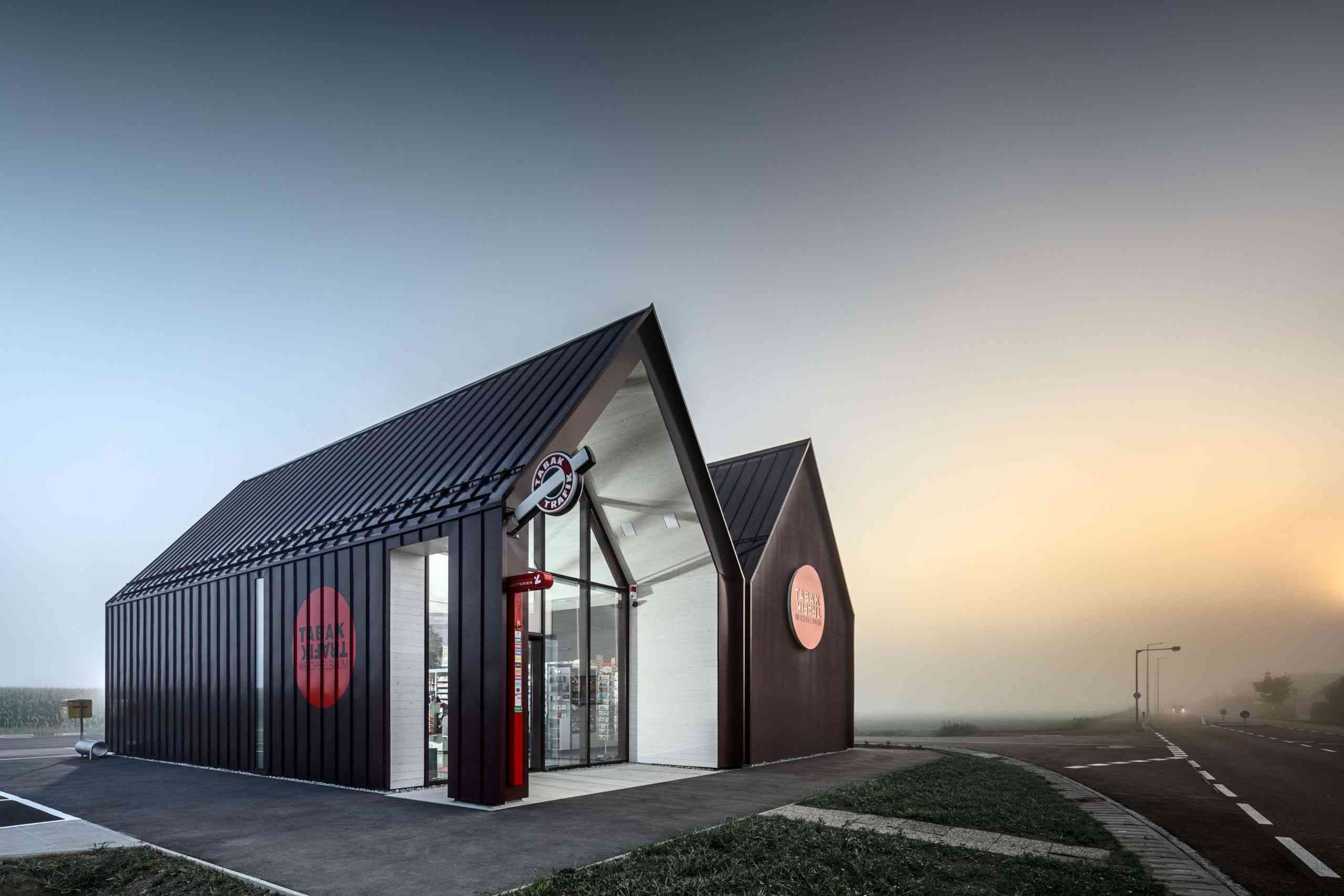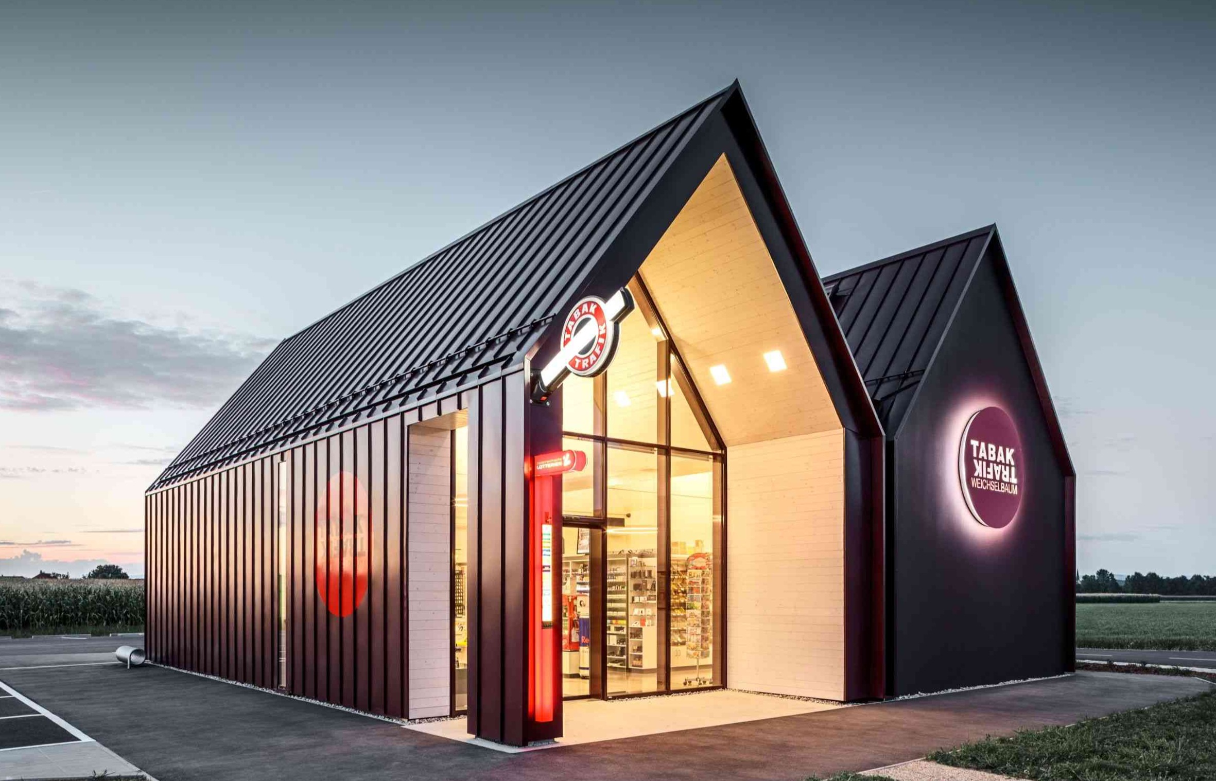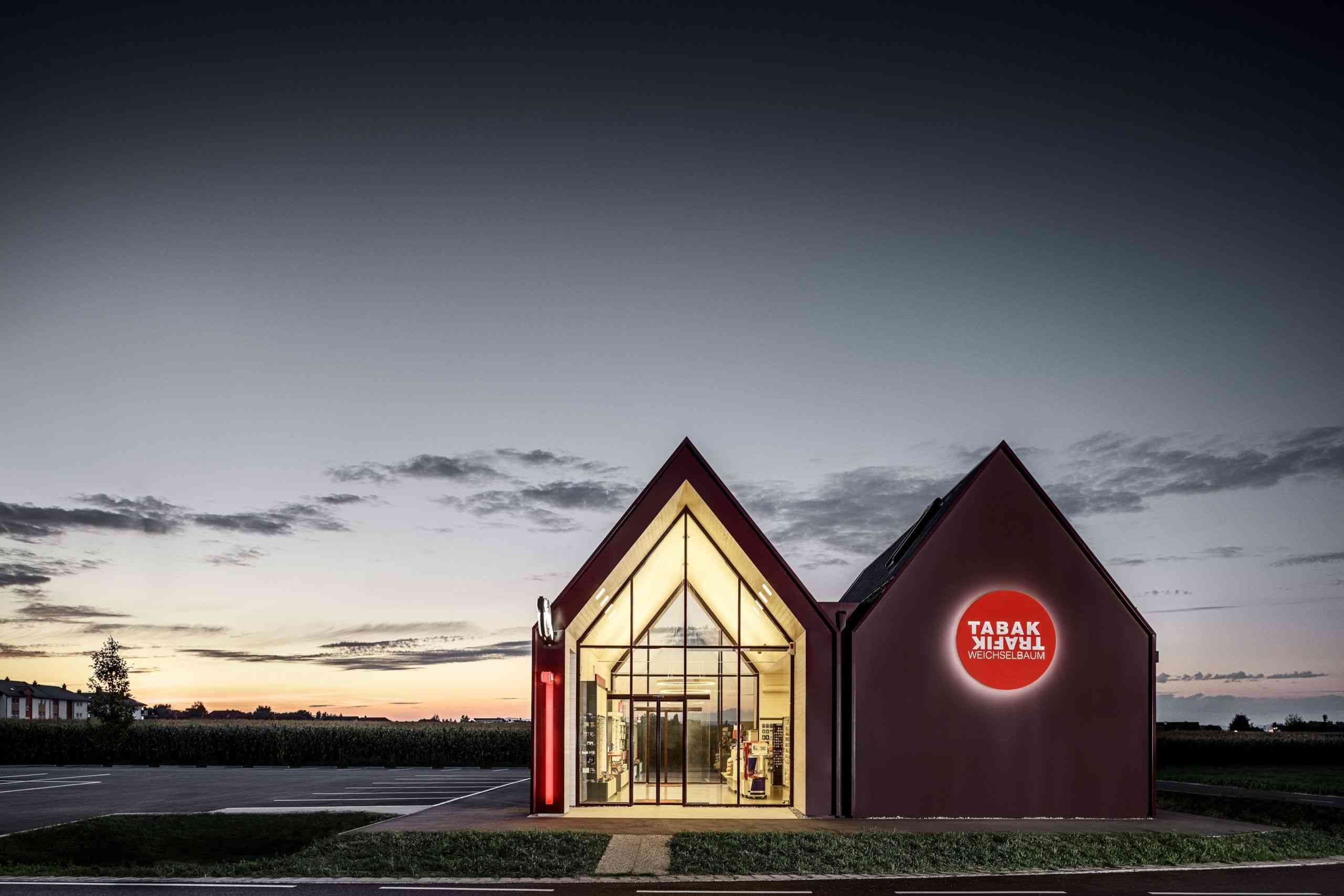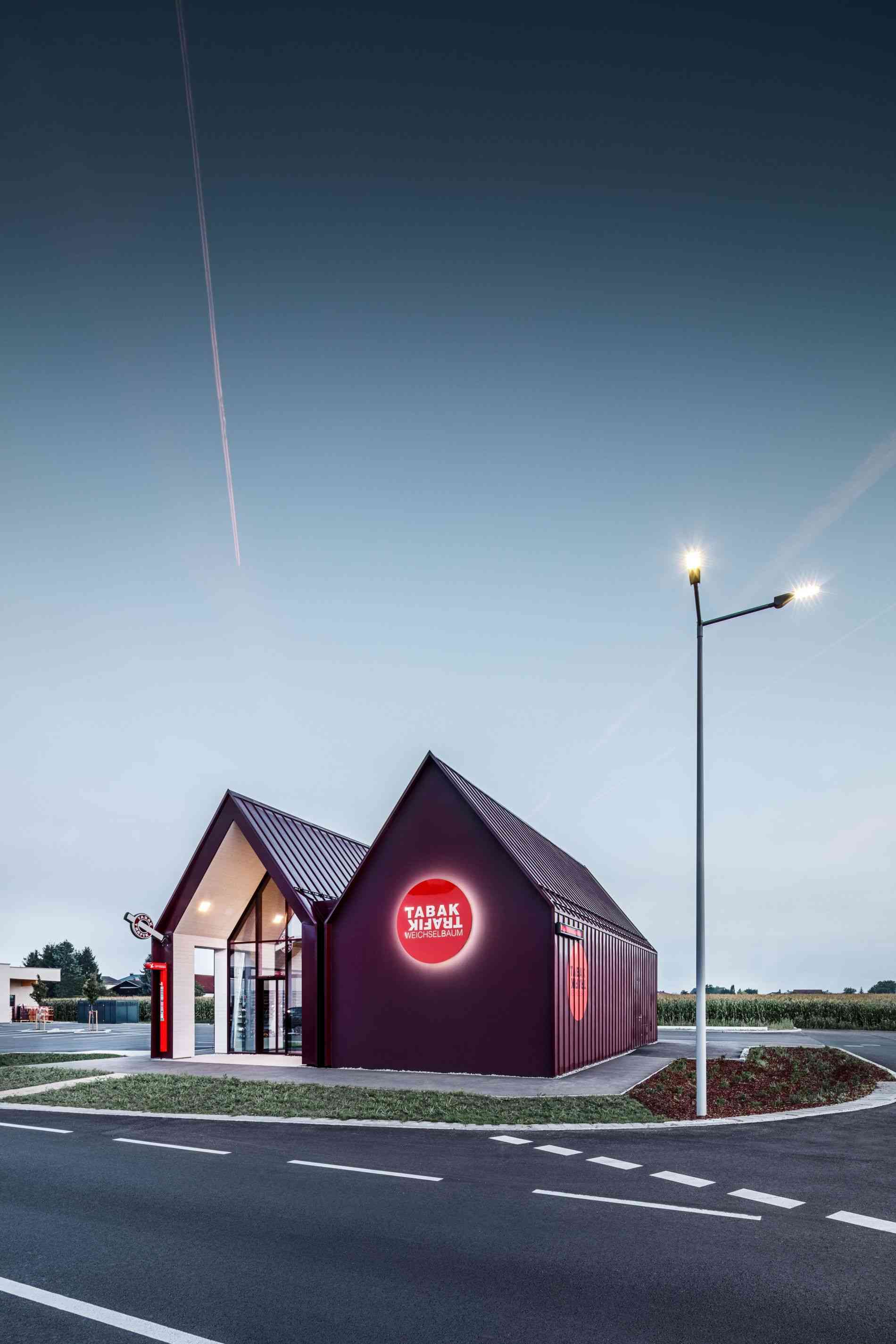 W centrum handlowej dzielnicy austriackiego Sankt Valentin powstał niezwykły budynek sklepu tytoniowego zaprojektowany przez pracownię Poppe*Prehal. Dwuspadowa forma z wysokimi, ostrymi szczytami oraz charakterystyczna czerwona okładzina z aluminium sprawiły, że niewielki pawilon stał się natychmiastowym punktem orientacyjnym w przestrzeni miejskiej. Architekci postawili na reinterpretację tradycyjnych kształtów znanych z lokalnej zabudowy, jednocześnie wprowadzając silny, współczesny akcent wizualny. Efekt przypomina projekty typu nowoczesna stodoła – prosta forma zestawiona z wyrazistym materiałem, tworząca wyjątkową architekturę komercyjną na małą skalę.