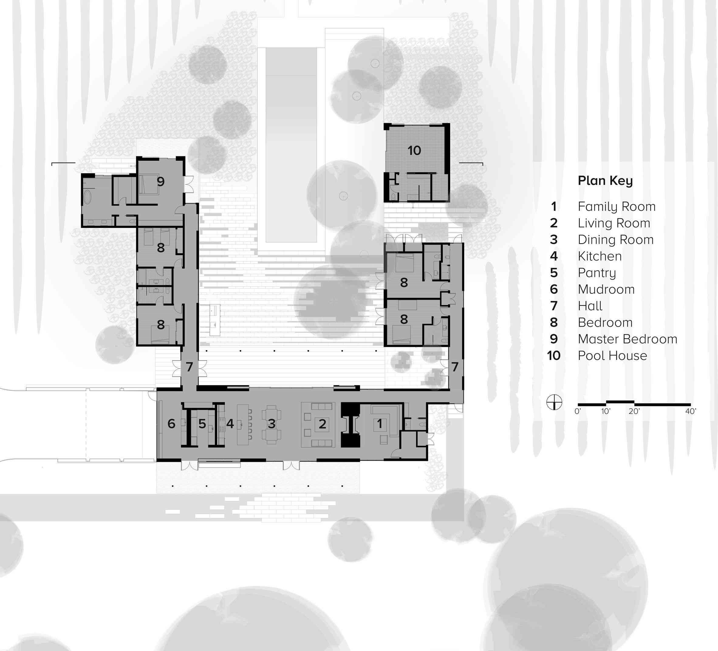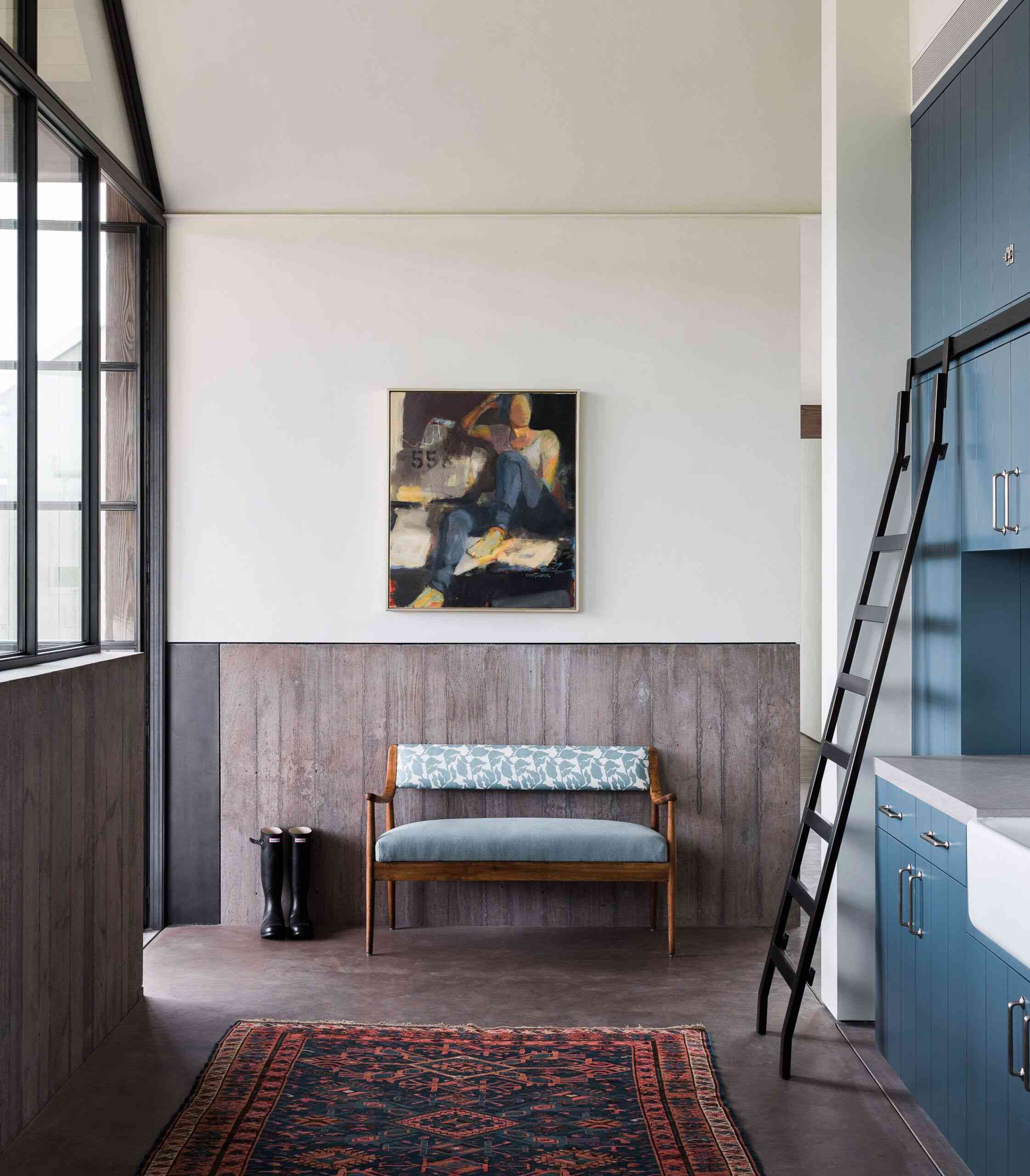 Architekci z Field Architecture zaprojektowali budynek tak, by idealnie współgrał z otoczeniem. Dom został osadzony między drzewami, co pozwoliło zachować naturalny charakter krajobrazu i stworzyć prywatny dziedziniec z basenem w centrum założenia. Z zewnątrz uwagę przyciąga elewacja z drewna i dwuspadowe dachy z blachy, które przywodzą na myśl tradycyjne budynki gospodarcze regionu. Inspiracje lokalną historią agrarną widać także w środku – ciemne drewno, stalowe belki i otwarte przestrzenie przypominają klasyczne amerykańskie stodoły, nadając wnętrzom wyjątkowego charakteru i głębi.