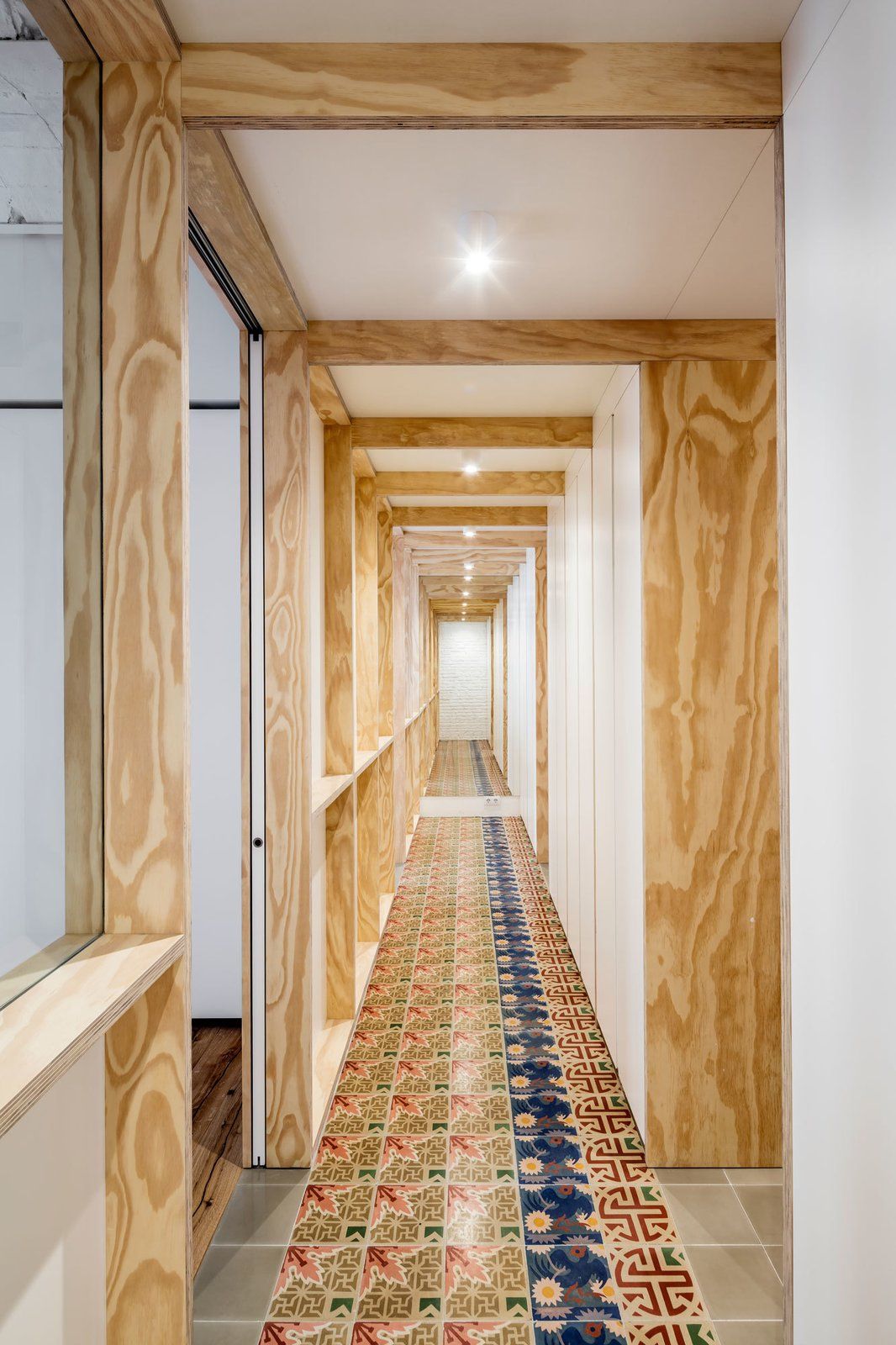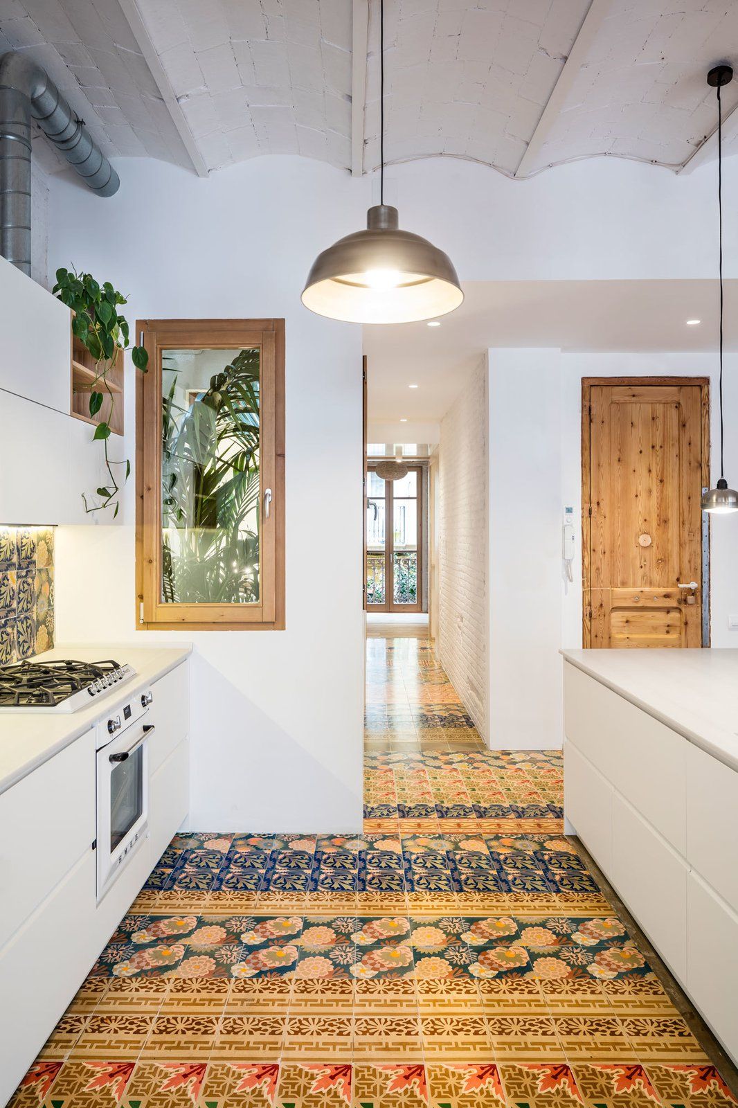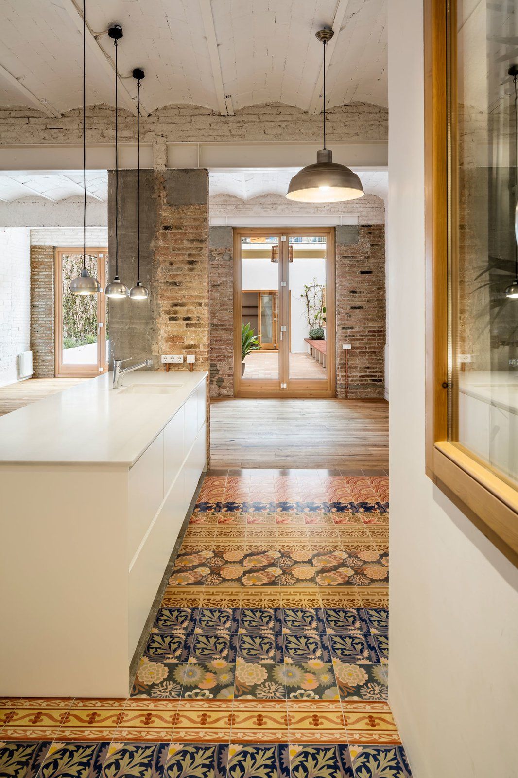W trakcie przebudowy udało się zachować i ponownie wykorzystać około 90% oryginalnych cementowych i ceglanych płytek, które ułożono w formie dekoracyjnych mozaik w kuchni, łazience, garderobie i strefach komunikacji. W korytarzach zaprojektowano pojemne, dyskretne zabudowy meblowe, ograniczając potrzebę wolnostojących mebli w pokojach. Jedno z pomieszczeń przekształcono w studio muzyczne z bezpośrednim dostępem do dużego patio, nad którym powstała pergola porośnięta winoroślą, jaśminem i wisterią. Konstrukcja pergoli połączona została z lekkimi schodami ze stali i drewna, prowadzącymi na dach studia, gdzie zaprojektowano prywatny ogród. Całość realizacji stanowi przykład zrównoważonej renowacji mieszkania w Barcelonie, łączącej historyczne dziedzictwo z nowoczesnym stylem życia.