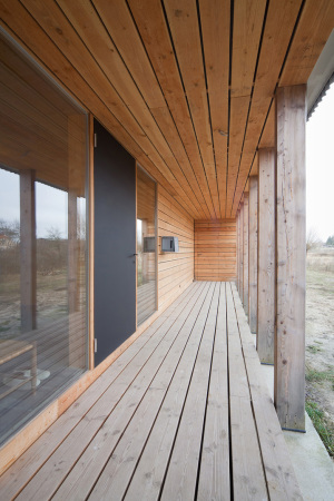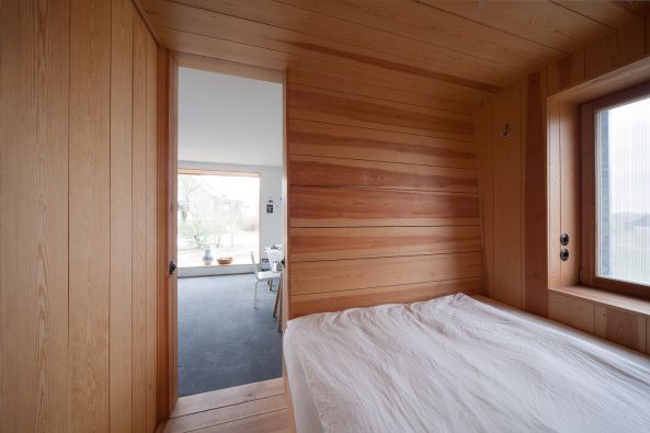 Wejście do części mieszkalnej zostało dyskretnie ukryte po zawietrznej stronie budynku, za werandą z drewnianych desek, a bramy pozostałych obiektów osłonięto w analogiczny sposób, nie zaburzając spójnej kompozycji architektonicznej. Ściana szczytowa została obłożona drewnem modrzewiowym, a zniszczona konstrukcja nośna dachu w najwyższym budynku ustąpiła miejsca nowej, lekkiej i precyzyjnie wykonanej drewnianej strukturze. Warsztat stolarski rozpoczął działalność jeszcze w trakcie budowy, współtworząc elementy konstrukcyjne, okładzinę elewacji oraz wnętrza. Cały zespół budynków sprawia wrażenie lekkiego i przestronnego, a minimalistyczne wnętrza, zdominowane w części mieszkalnej przez duże przeszklenie, konsekwentnie podkreślają funkcjonalny i współczesny charakter tej architektonicznej rekonstrukcji.