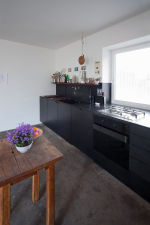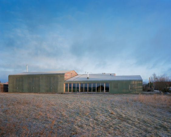 Pierwotny budynek z 1987 roku wraz z przylegającymi biurami pełnił funkcję warsztatu ślusarskiego dla LPG Gerswalde. Nowy inwestor zdecydował się na kompleksową rekonstrukcję całego zespołu, zachowując jego pierwotną bryłę, choć po zakończeniu prac obiekt jest niemal nie do poznania. Trzy połączone ze sobą budynki otrzymały nową okładzinę z blachy falistej, która miękko zaokrągla się na styku ściany i dachu, oplatając całą konstrukcję. Układ funkcjonalny odpowiada zróżnicowanej masie budynków: w najniższej i najwęższej części zaplanowano mieszkanie, w środkowej — warsztat, natomiast najwyższa bryła z dużą bramą pełni funkcję handlową i magazynową. Takie zestawienie funkcji i formy przywodzi na myśl współczesną reinterpretację typologii, jaką określa się dziś jako nowoczesna stodoła w przemysłowym wydaniu.
