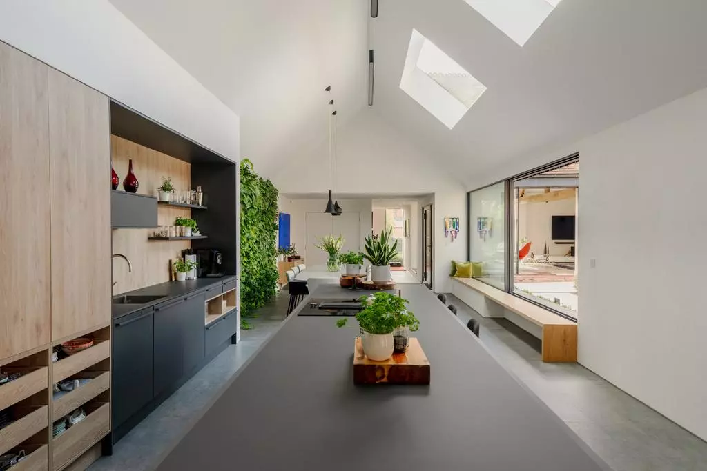 Nowa część budynku mieści główną przestrzeń dzienną. Dwukondygnacyjna kuchnia i jadalnia została zaprojektowana jako serce domu, gdzie mieszkańcy mogą spędzać wspólnie czas. Wysokie okna oraz świetliki dachowe wprowadzają do wnętrza dużą ilość naturalnego światła, a jednocześnie podkreślają kontrast pomiędzy historyczną cegłą a nowoczesną formą architektoniczną.