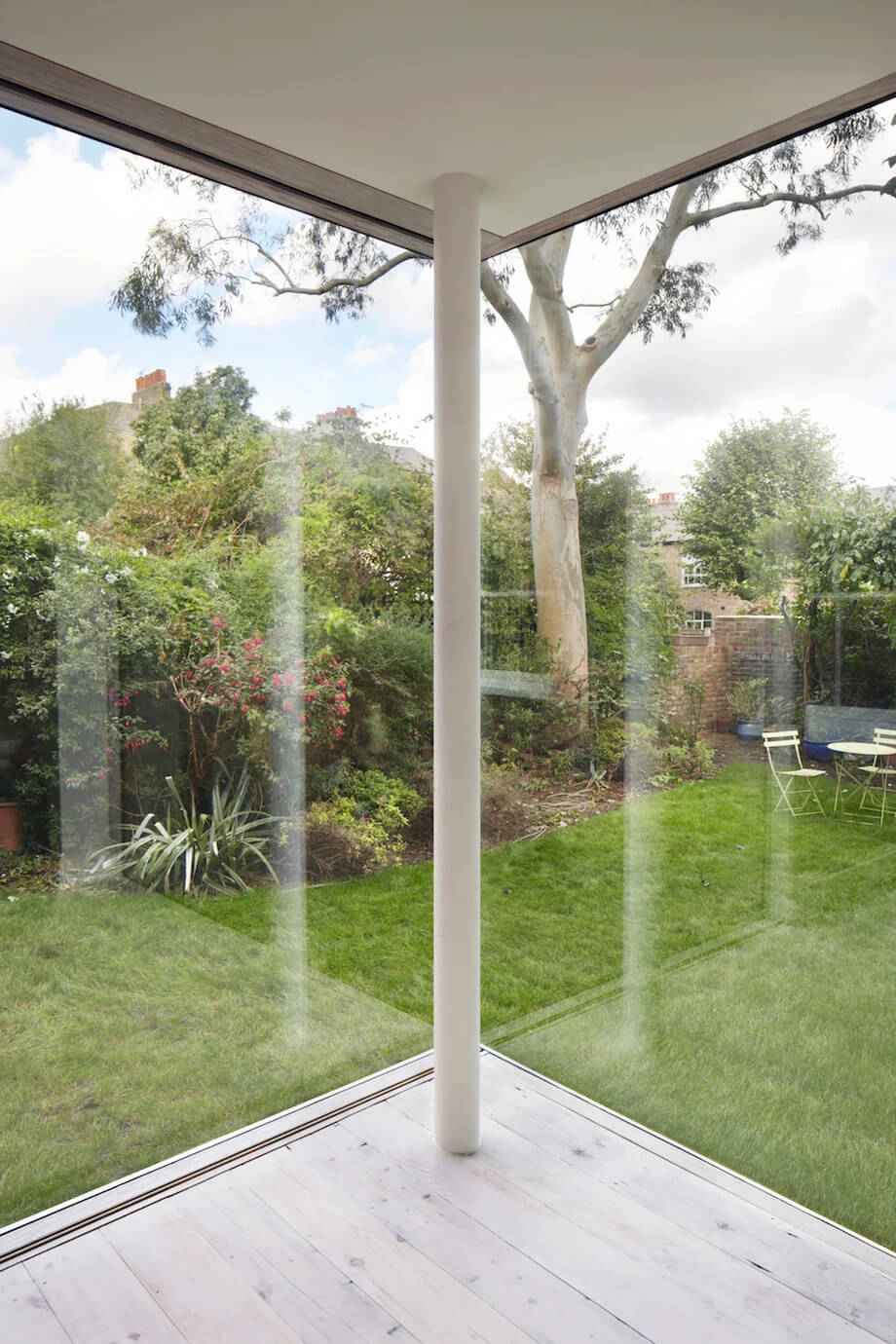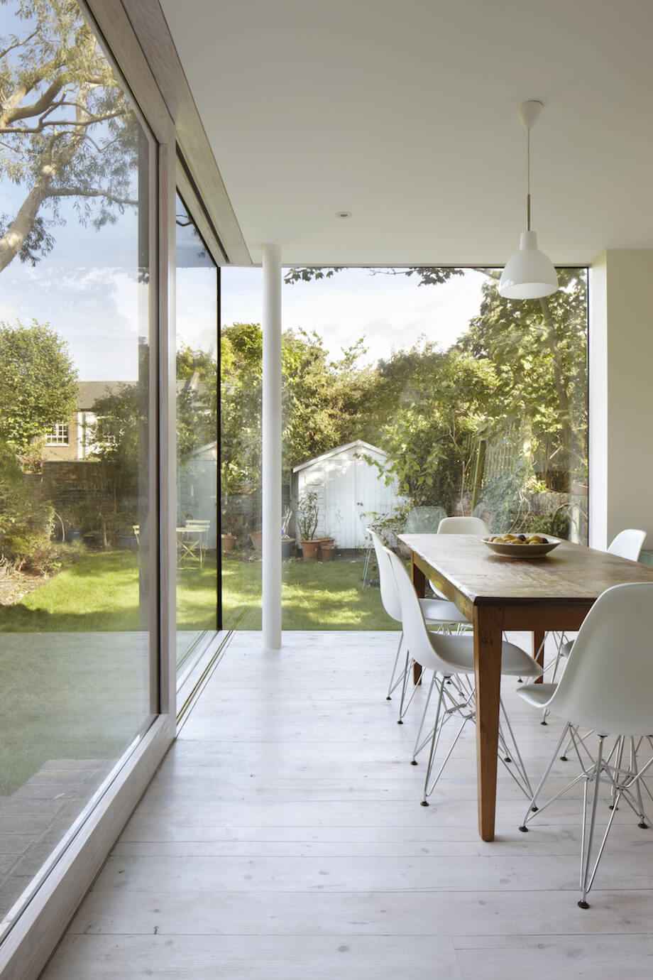 Parter nowej części budynku mieści przestronną jadalnię, której dwie szklane ściany sięgają od podłogi do sufitu. Dzięki nim wnętrze otwiera się na bujny, zielony ogród, zacierając granicę między przestrzenią wewnętrzną a zewnętrzną. To rozwiązanie nie tylko zapewnia obfite doświetlenie naturalnym światłem, ale też znacząco zwiększa poczucie przestrzeni w stosunkowo zwartej zabudowie miejskiej. Zastosowanie dużych przeszkleń pozwoliło stworzyć dynamiczną relację z otoczeniem bez naruszania prywatności mieszkańców.