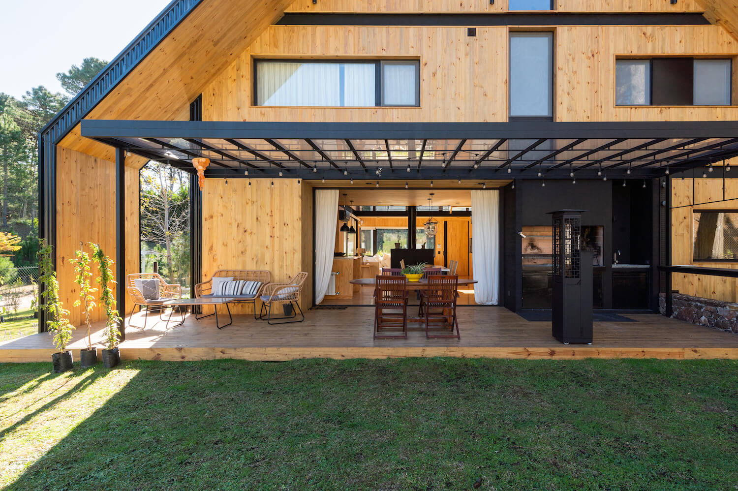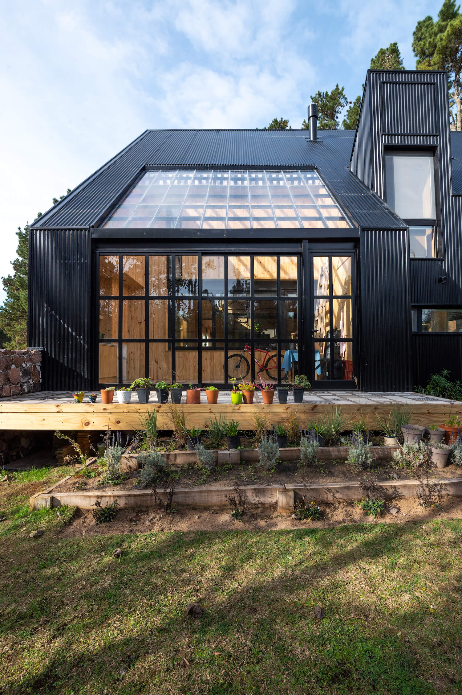 Dom oparty jest na platformie podtrzymywanej przez betonowe słupy, co zapewnia stabilność i łączy budynek z terenem. Powietrze, które otacza bryłę, łączy przestrzenie, tworząc uczucie otwartości i naturalności.