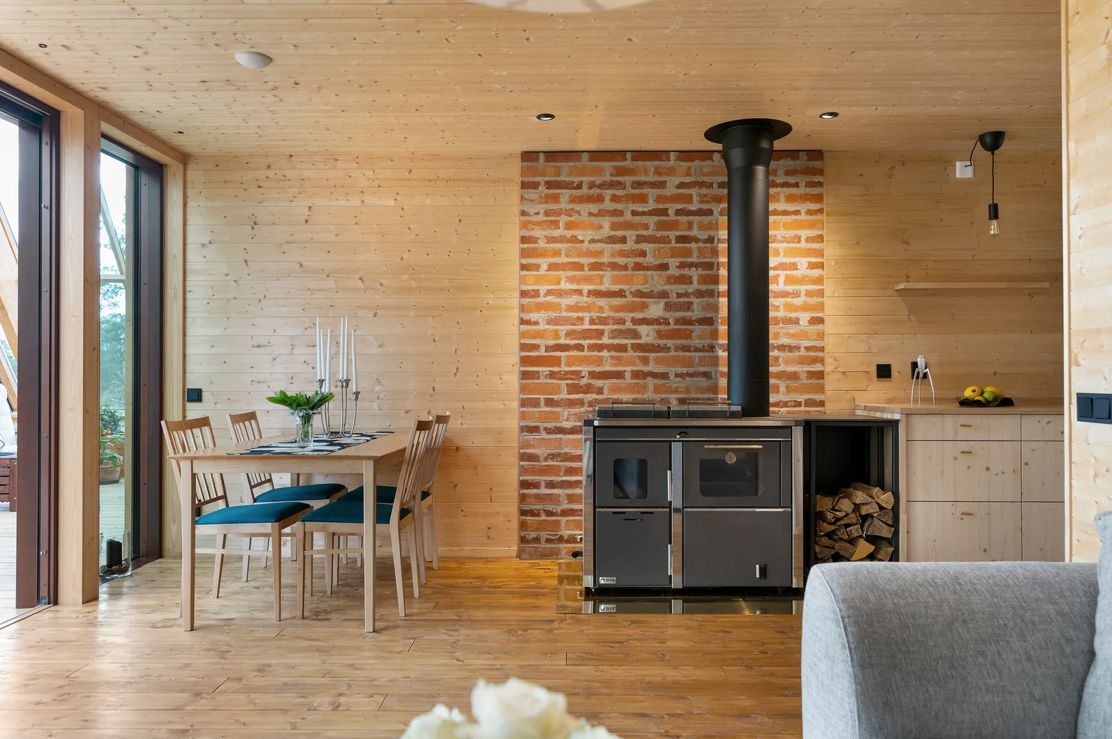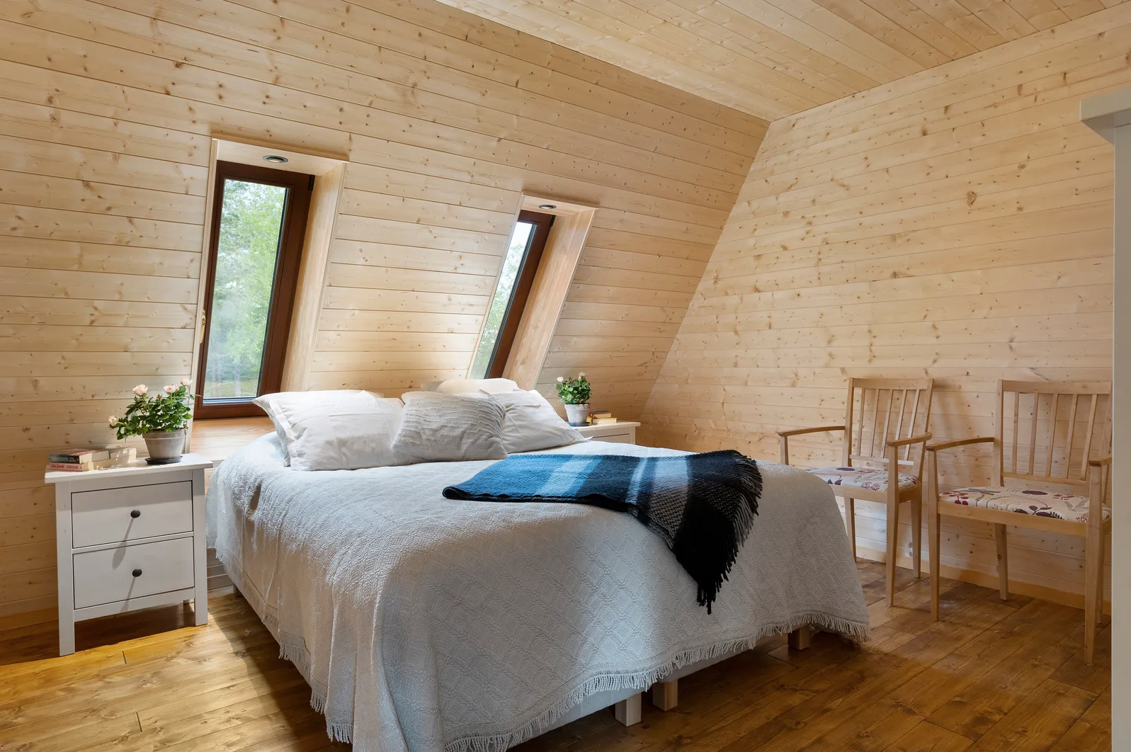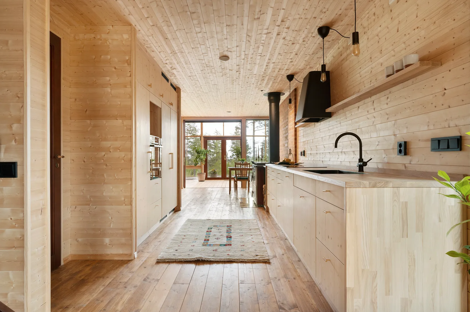 Wnętrze domu to otwarta przestrzeń mieszkalna, kuchnia z jesionowymi blatami, miejsce do pracy i sypialnie na wyższych poziomach. Z wewnętrznego balkonu i tarasu na dachu rozciąga się widok na jezioro Vänern i koronę drzew – prawdziwa harmonia z naturą.