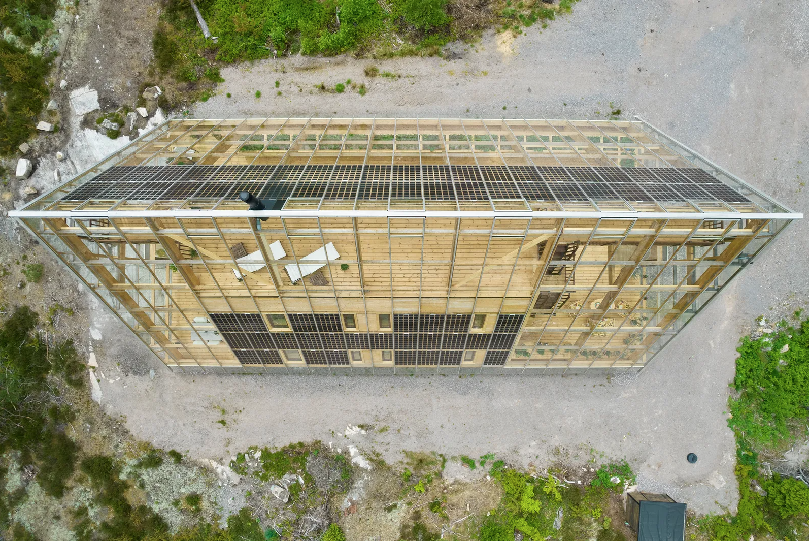Wbrew pozorom, pełne przeszklenie nie powoduje problemów z klimatyzacją – zastosowano tu pasywne systemy chłodzenia, wentylację krzyżową oraz energooszczędne rozwiązania grzewcze. Latem dom działa w pełni na panele fotowoltaiczne, a zimą dogrzewany jest przez tradycyjny piec na drewno. Serce budynku stanowi trzypiętrowe atrium, łączące funkcję szklarni i salonu z jadalnią. Grządki ciągnące się wzdłuż południowej ściany służą do uprawy warzyw, ziół i owoców. System nawadniania opiera się na wodzie z własnej studni.