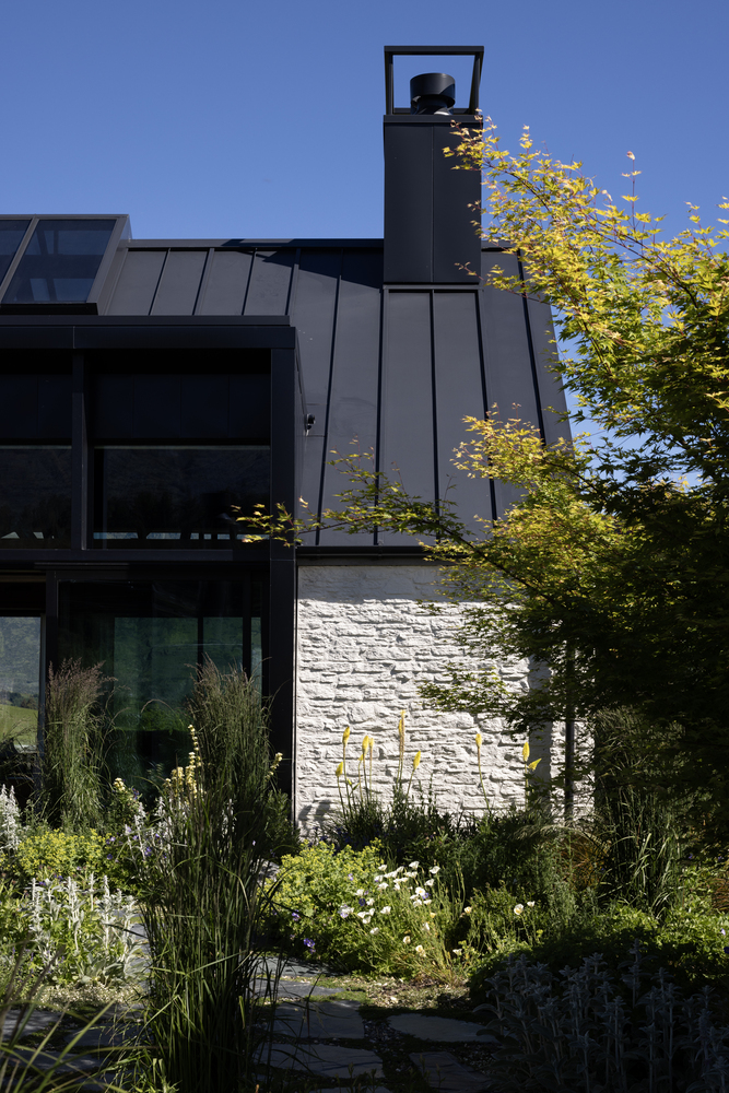 - Schistowa elewacja, wykończona jasnym mineralnym malowaniem, nawiązuje do historycznych kamiennych budynków z sąsiedniej posiadłości Thurlby Domain.