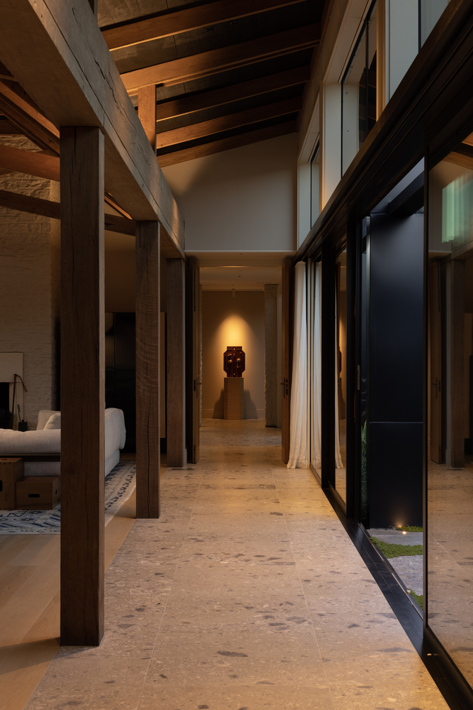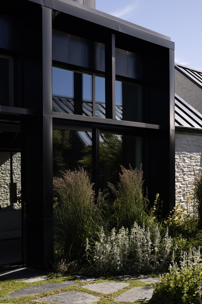 - Dwuspadowy dach głównego budynku, otwierający się na północ i południe, czerpie inspirację z historycznej konstrukcji dla jeleni, znalezionej na terenie posesji podczas pierwszej wizyty.