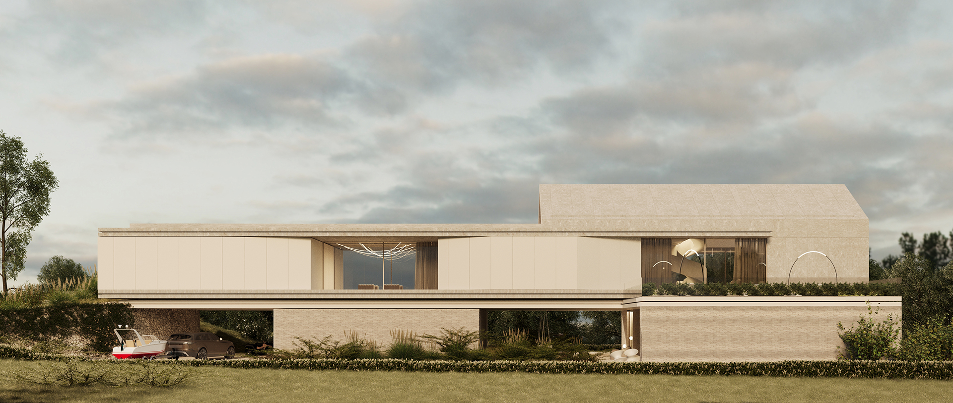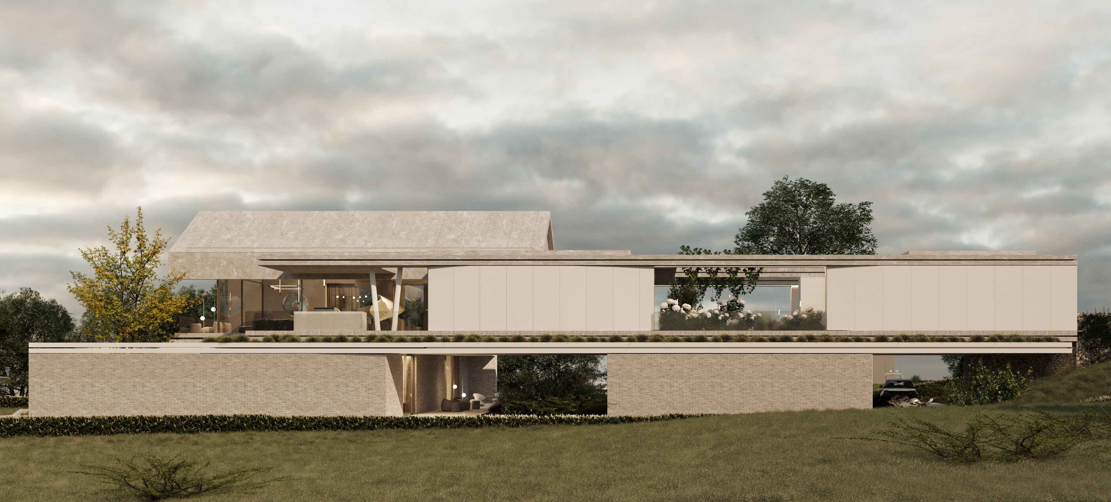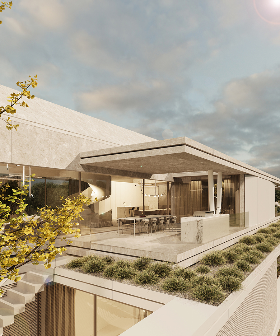 Elewacja została zaprojektowana w stonowanych odcieniach beżu i jasnego kamienia, co nadaje bryle ponadczasową elegancję i subtelny charakter. Rytm horyzontalnych i pionowych linii przełamują miękkie formy zieleni, wprowadzając lekkość i organiczny wymiar do nowoczesnej struktury budynku.