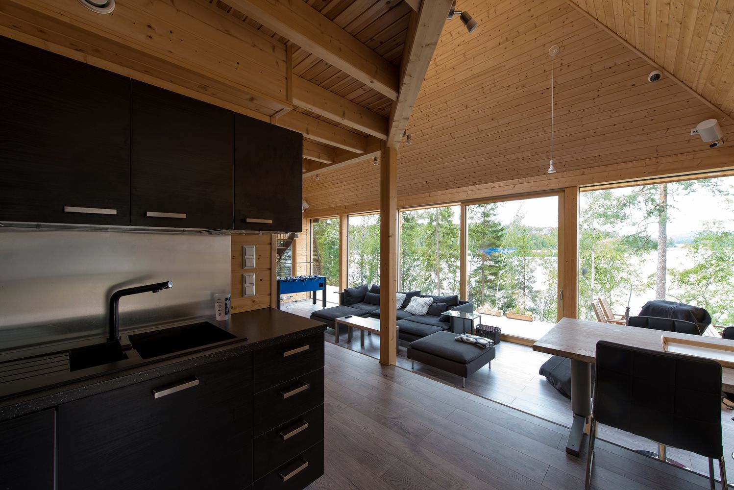 Dach w kształcie piramidy zakończonej pełnym przeszkleniem, kryjący prywatne obserwatorium, definiuje charakter tej nowoczesnej stodoły w Finlandii. Drewniany dom powstał na stromej działce nad jeziorem, w otoczeniu górskiego lasu, łącząc proste, geometryczne linie z tradycyjnymi materiałami, co tworzy przestronne i funkcjonalne wnętrza. Wnętrza w nowoczesnej stodole są zaprojektowane wokół centralnego obserwatorium, które zapewnia panoramiczne widoki, wypełnia naturalnym światłem wszystkie poziomy budynku oraz podkreśla wielopoziomowy salon z eliptyczną klatką schodową owijającą kamienny kominek. Tarasy rozłożone na różnych poziomach działki umożliwiają korzystanie z przestrzeni zewnętrznej w zgodzie z naturalnym ukształtowaniem terenu i otaczającą przyrodą.