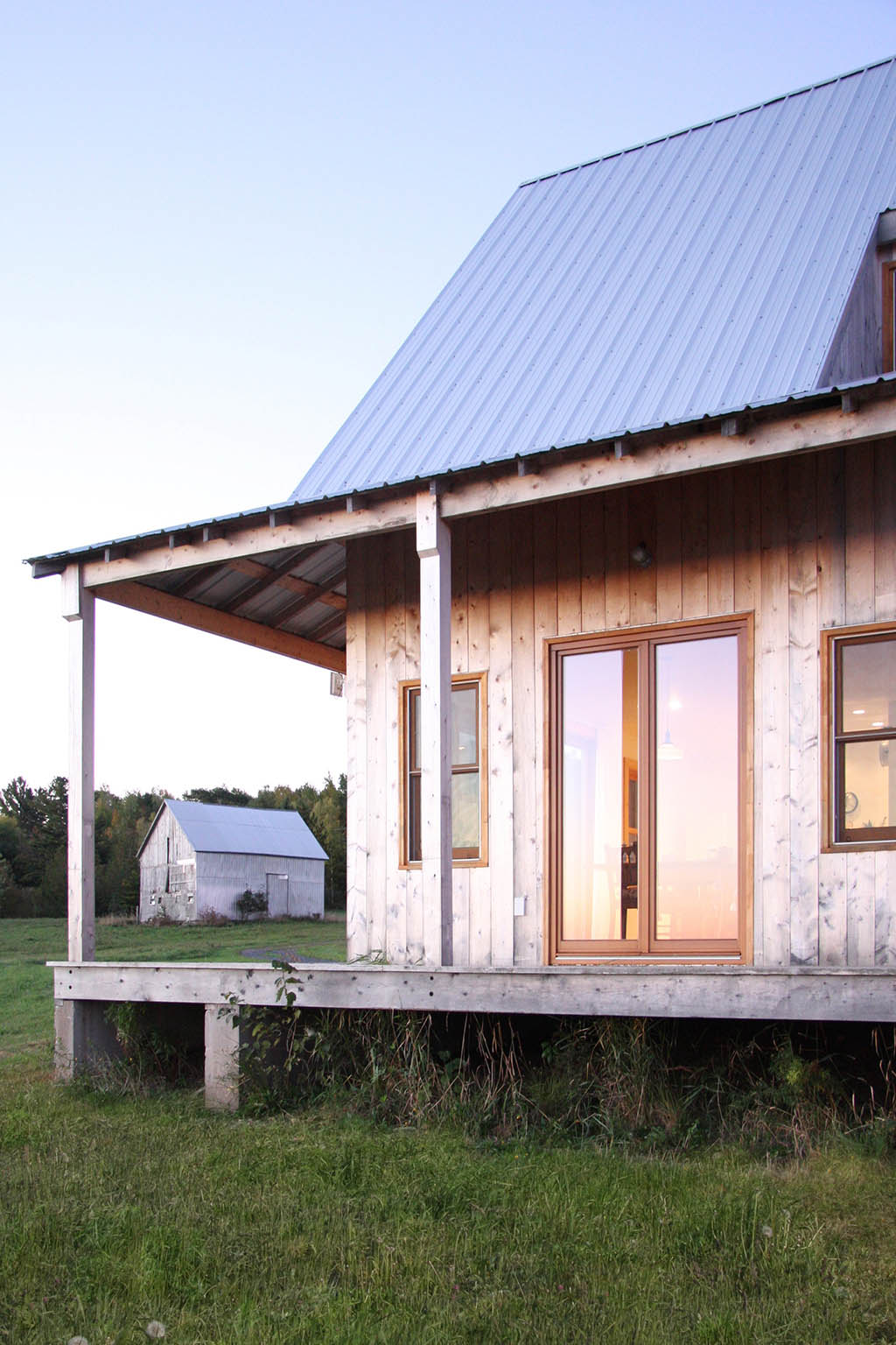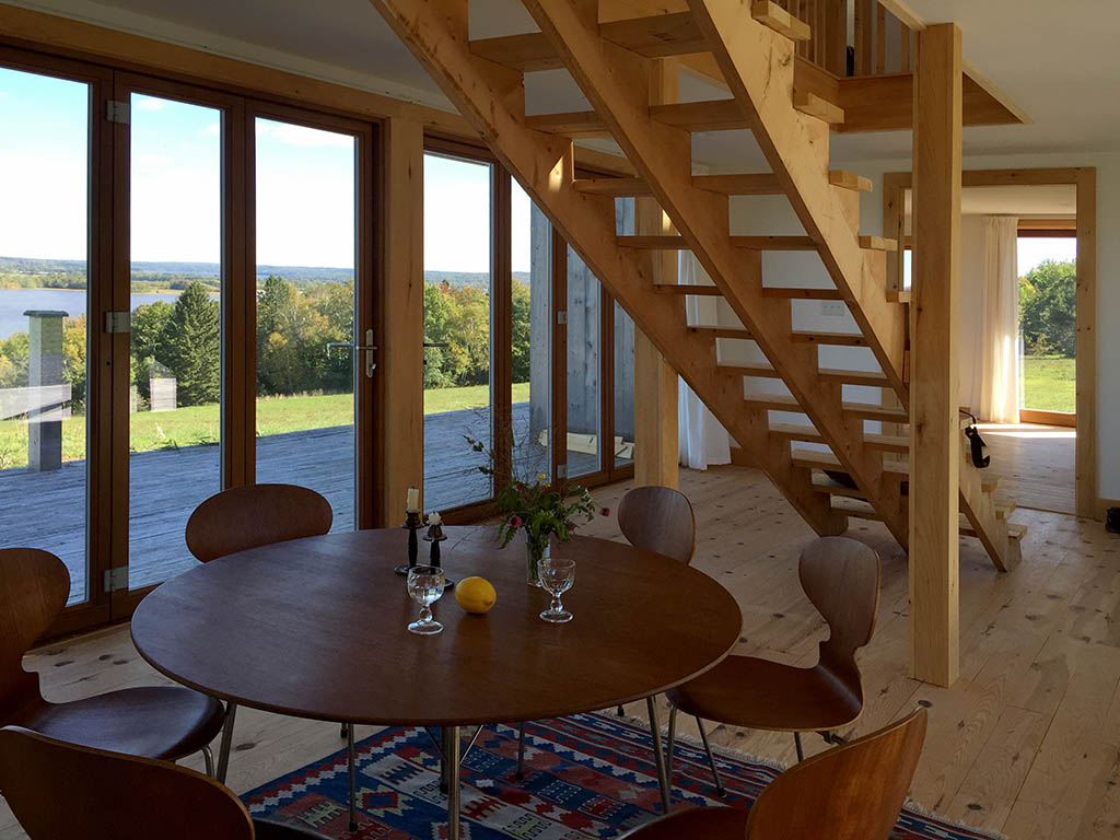 Dom stanął samotnie na północnym stoku z widokiem na jezioro Otnabok, w krajobrazie, który emanuje spokojem i naturalnością. Prosta bryła nawiązuje do okolicznych stodół: dwuspadowy dach kryty blachą, podcień biegnący dookoła budynku, drewniana konstrukcja lekko uniesiona nad ziemią. Wszystko tu zdaje się znajome, ale forma została przemyślana z architektoniczną precyzją i ironią – jak choćby weranda, która otacza dom z każdej strony, choć żaden z sąsiadów nie poszedł aż tak daleko.