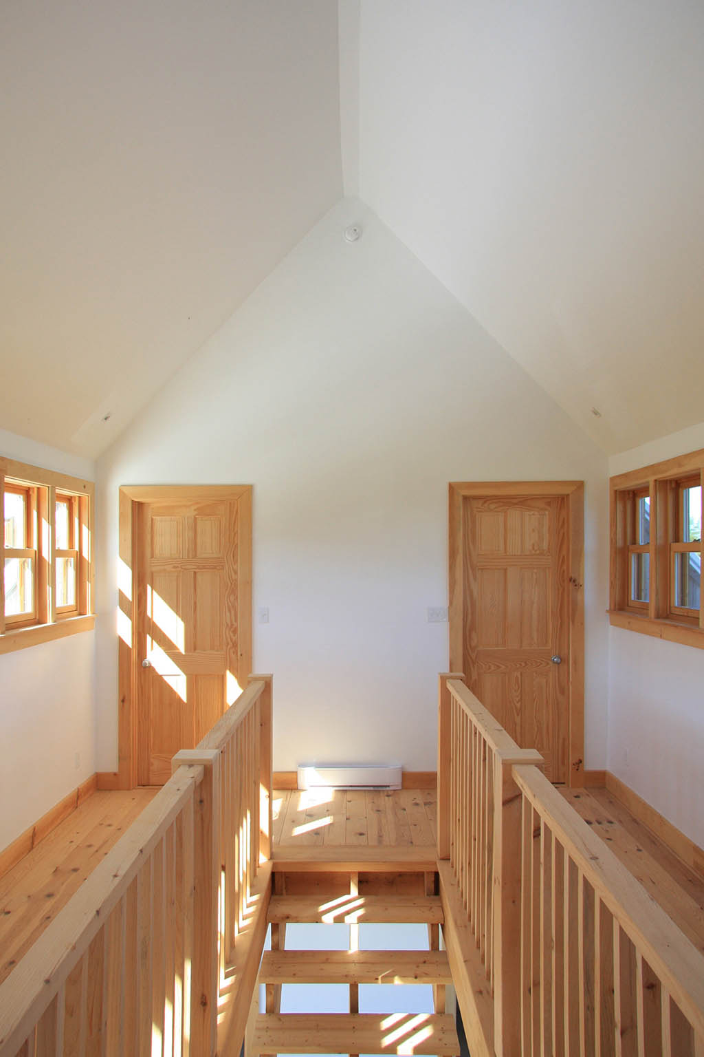 Plan budynku oparto na czytelnej symetrii: centralna oś z przeszklonymi otwarciami i wciętą loggią, po bokach zamknięte strefy mieszkalne. Parter mieści kuchnię, jadalnię, salon i łazienkę, natomiast na piętrze zaplanowano trzy sypialnie oraz dodatkową łazienkę. Jednak pomimo pozornej rygorystyczności, architekci wprowadzili celowe przesunięcia – drzwi, które łamią rytm, ściana poza osią, wyższe okno w szczycie. Te drobne „nieposłuszeństwa” wobec porządku wnoszą naturalność i luz, odróżniając projekt od skrajnego formalizmu spod znaku Oswalda Mathiasa Ungersa.