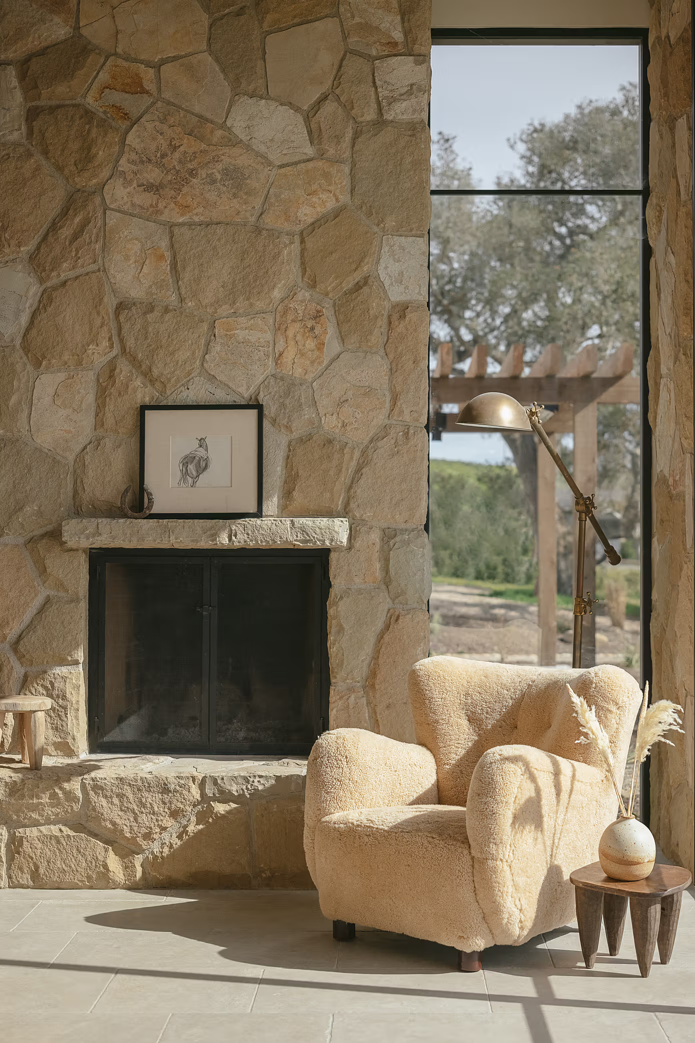 Kamień i inne materiały zewnętrzne pochodzą z lokalnych kamieniołomów, a ich instalacją zajęli się doświadczeni kamieniarze. Starannie dobrana mieszanka wapienia i piaskowca odzwierciedla stonowaną paletę barw, harmonizującą z naturalnym krajobrazem. Wnętrza kontynuują ten motyw, wykorzystując bielony dąb, podłogi z wapienia i minimalistyczne dekoracje, które podkreślają panoramiczne widoki otaczającej przyrody.
