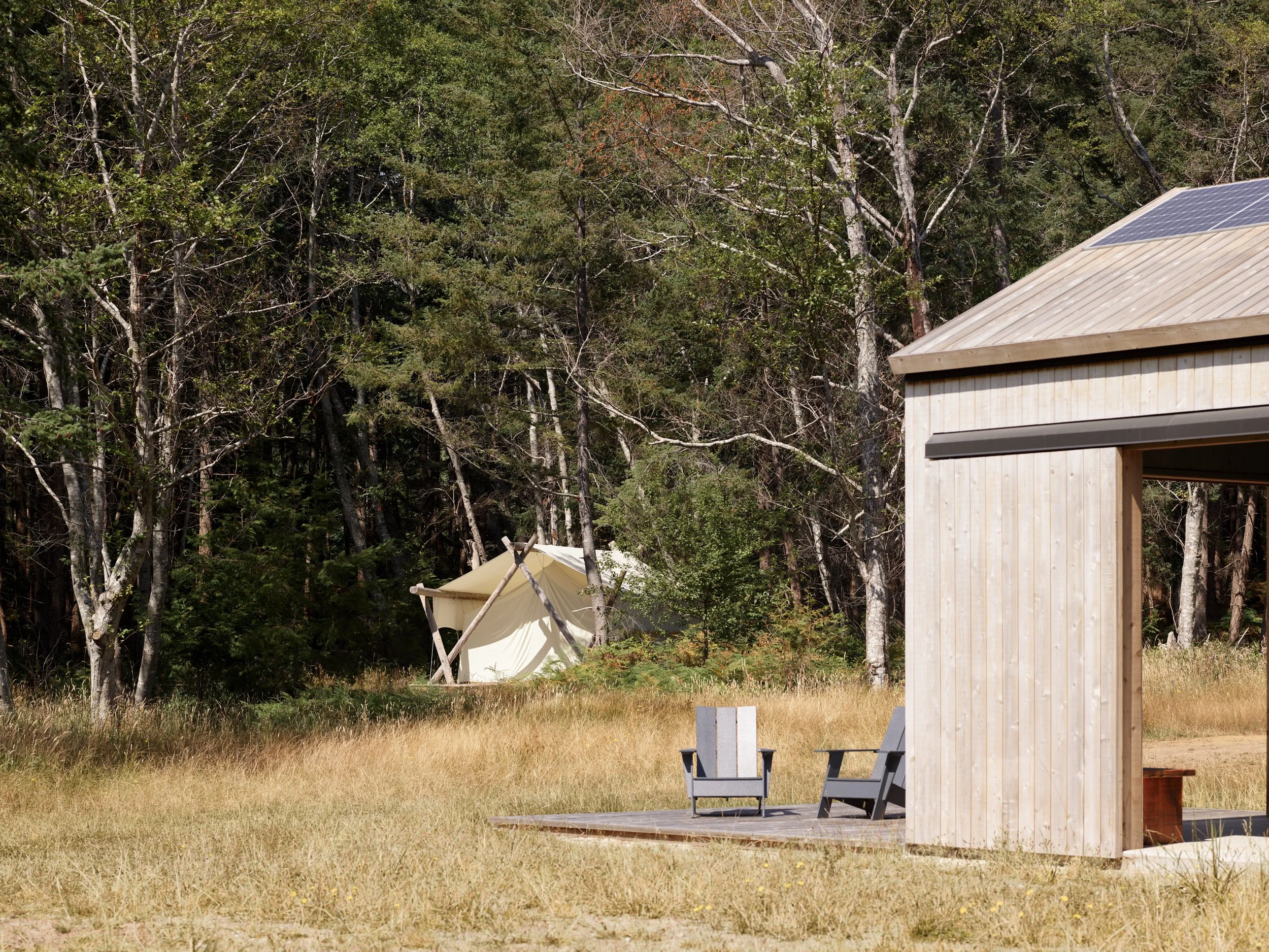 Inwestorzy spędzili na działce całe lato pod namiotem, zanim zwrócili się do architektek z wizją stworzenia letniego rancza – prostego, funkcjonalnego i otwartego na otoczenie. Odpowiedzią był projekt dwóch budynków ustawionych w kształcie litery L: The Cabin i The Barn.